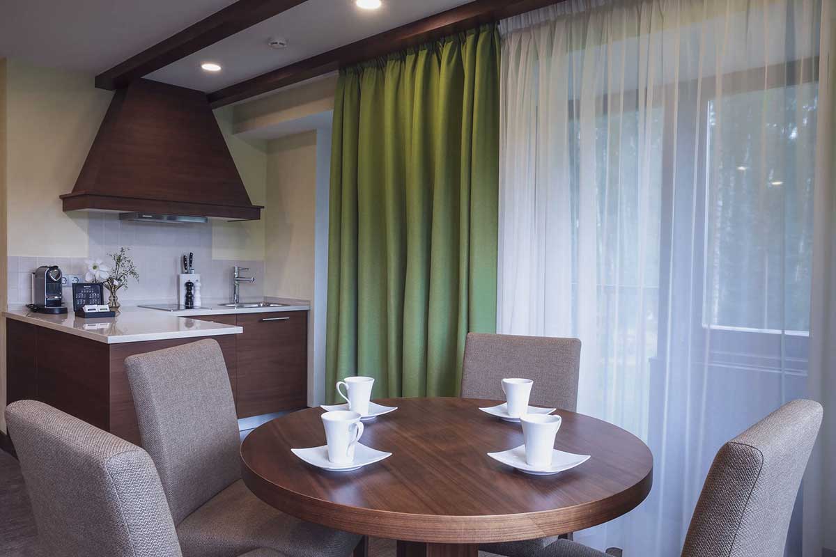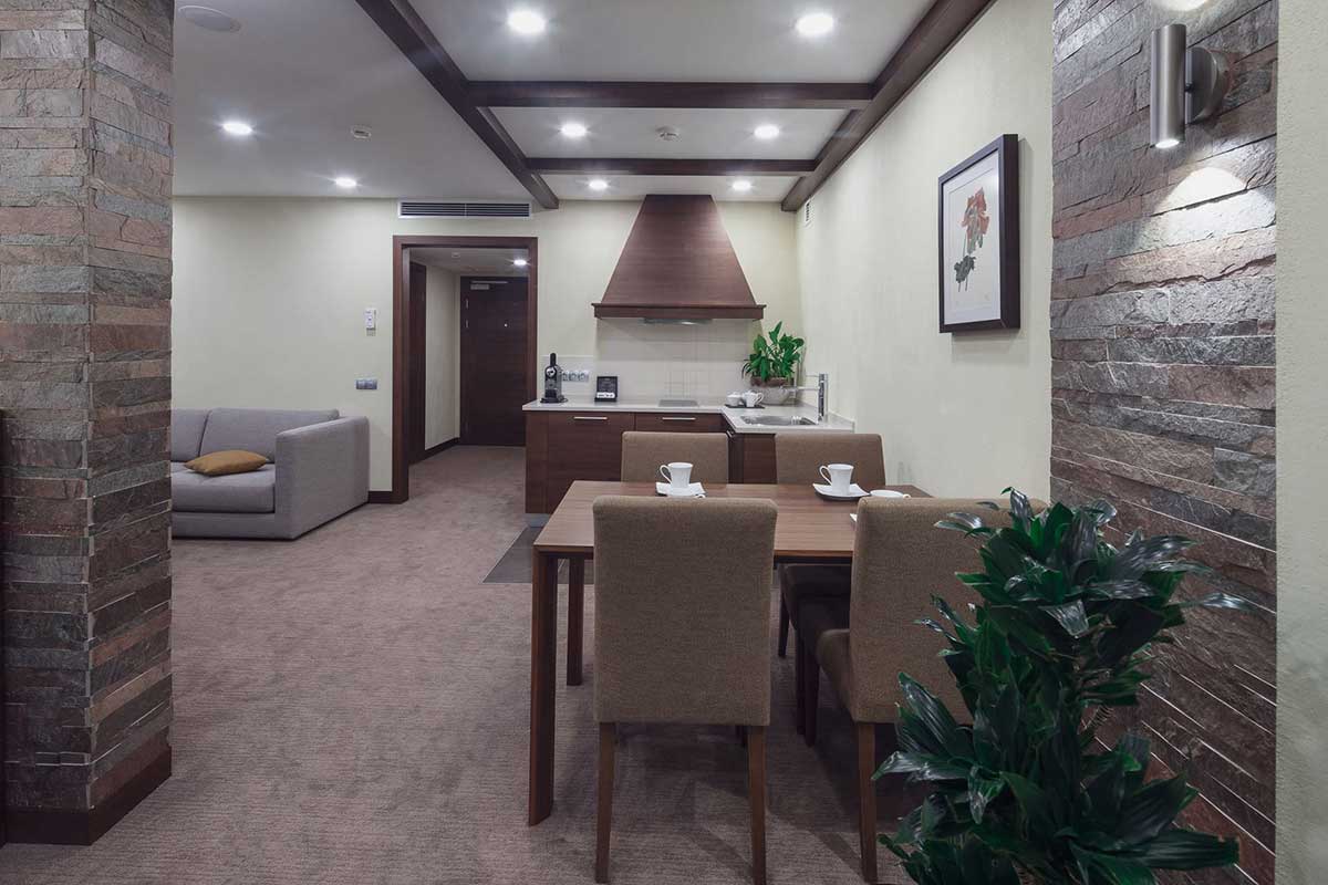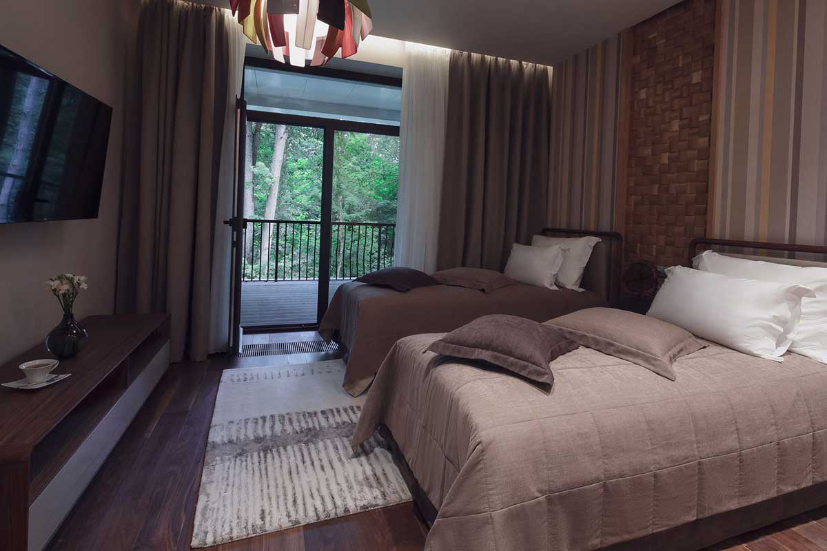 Номерной фонд предлагает гостям таунхаусы и апартаменты. Каждый номер — это простор и комфорт, экологичные материалы отделки, натуральные ткани, оригинальные дизайнерские решения по сочетанию оттенков и фактур.