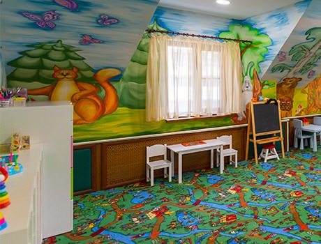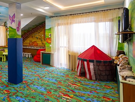 Многие гости приезжают в отель со своими детьми, поэтому на территории предусмотрена отличная детская комната. Комната имеет яркий дизайн, оснащена специальной детской мебелью и большим количеством игрушек, лабиринтов и развивающих игр.