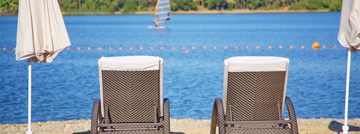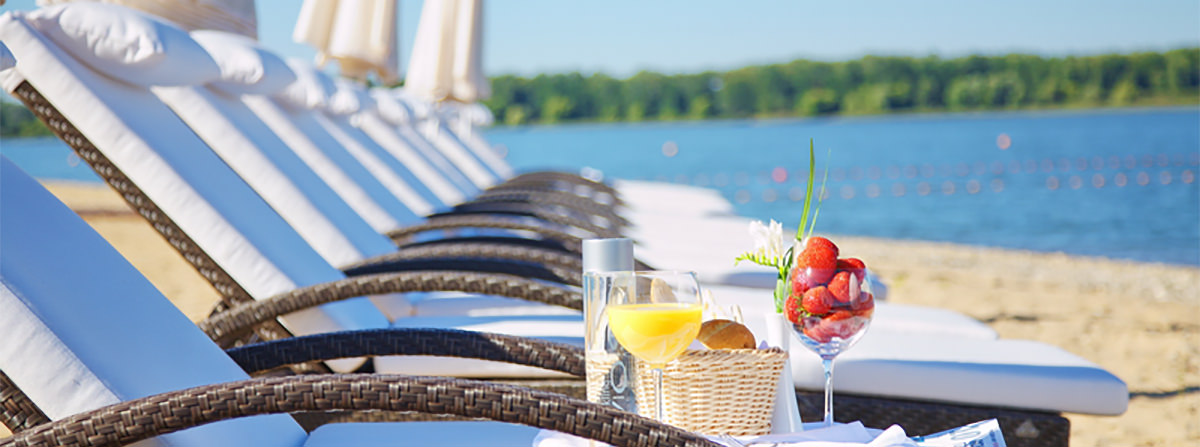 На пляже можно комфортно расположиться на удобном шезлонге, загорать на солнце и любоваться великолепными природными пейзажами.