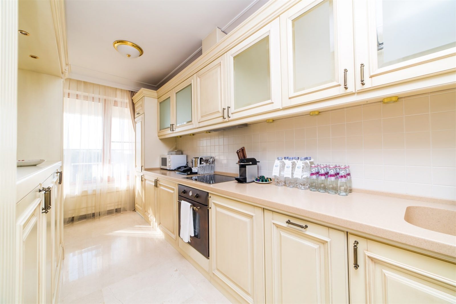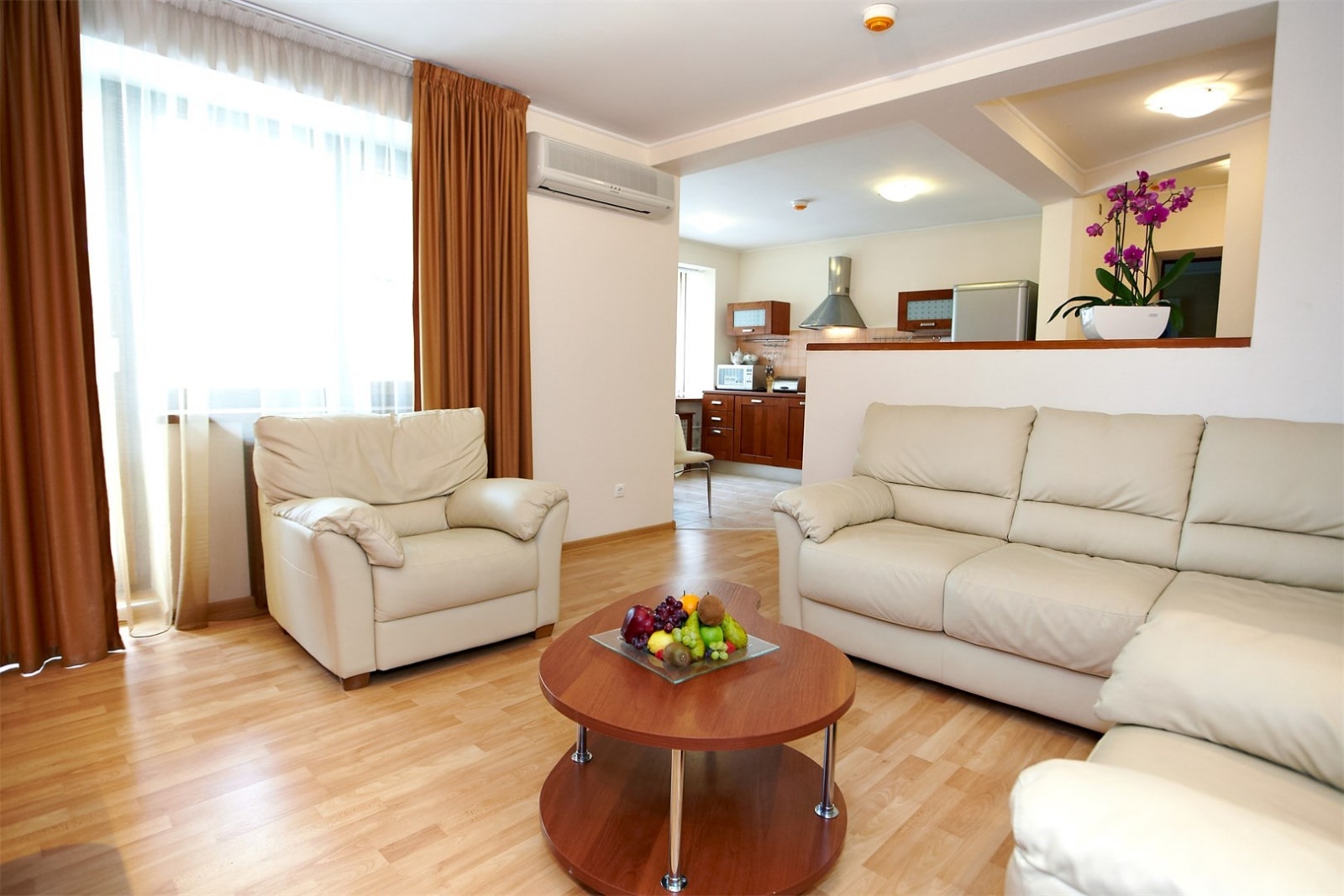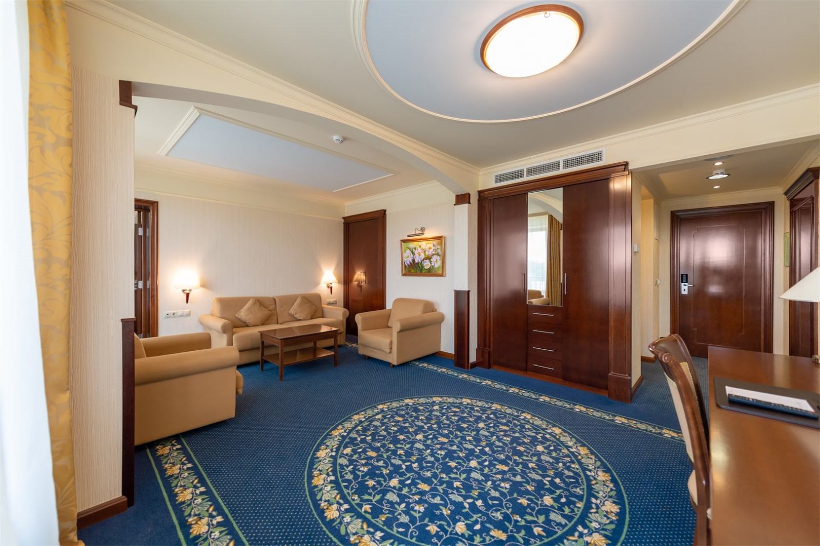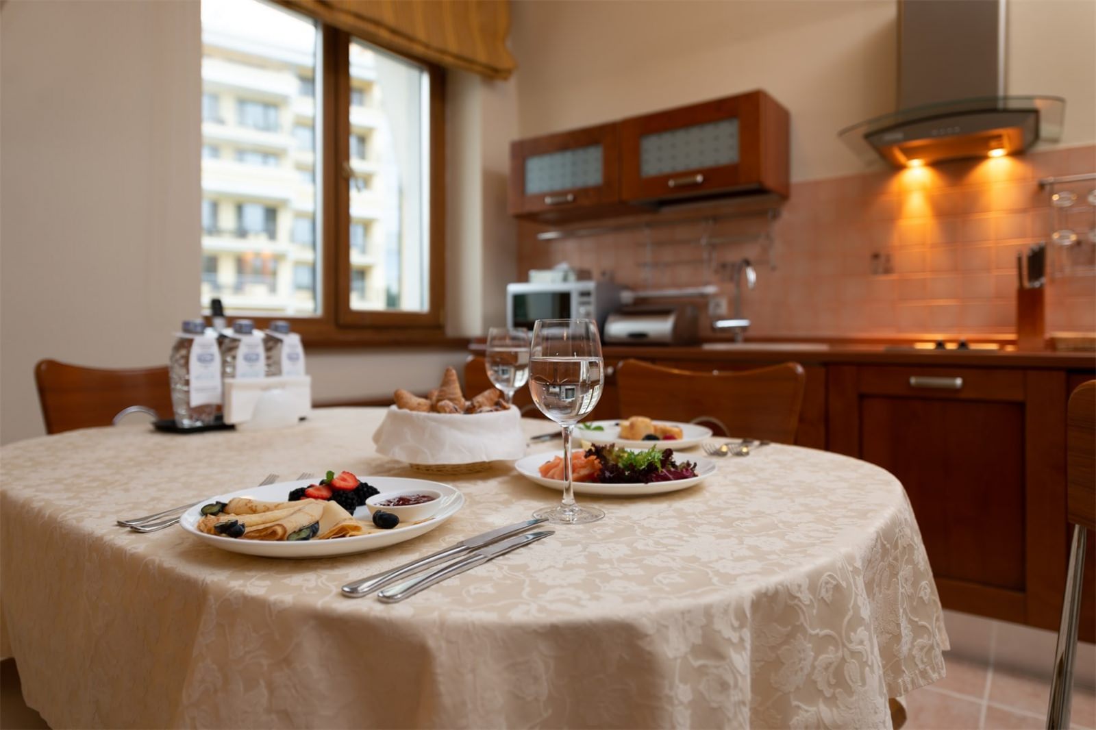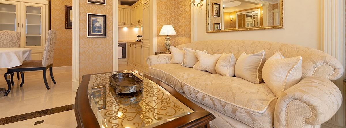 Апартаменты состоят из спальни, кухни, гостиной, гардеробной и отдельной ванной комнаты.