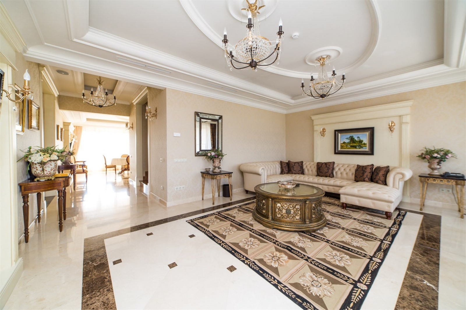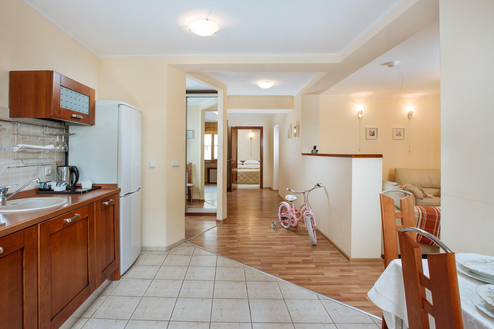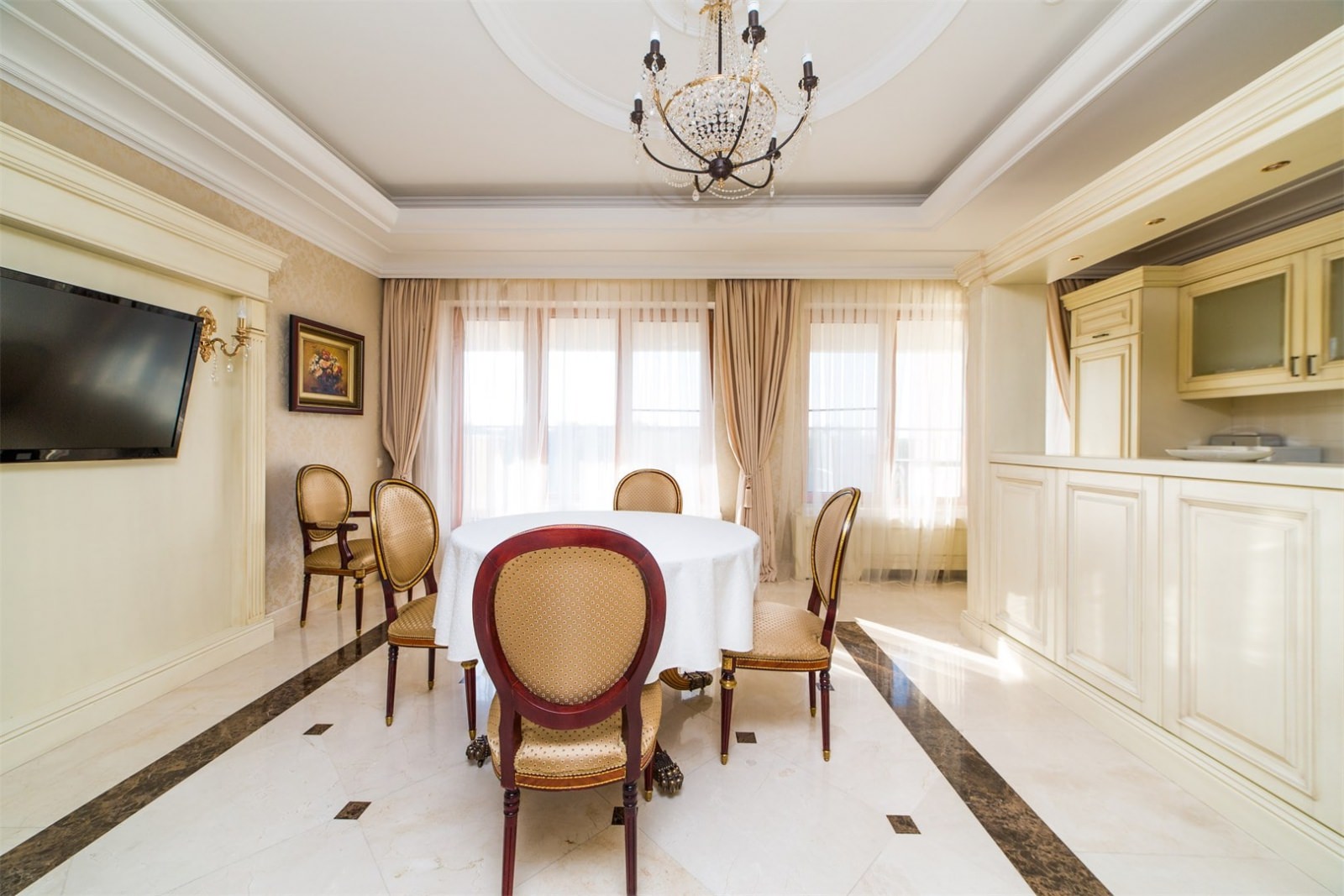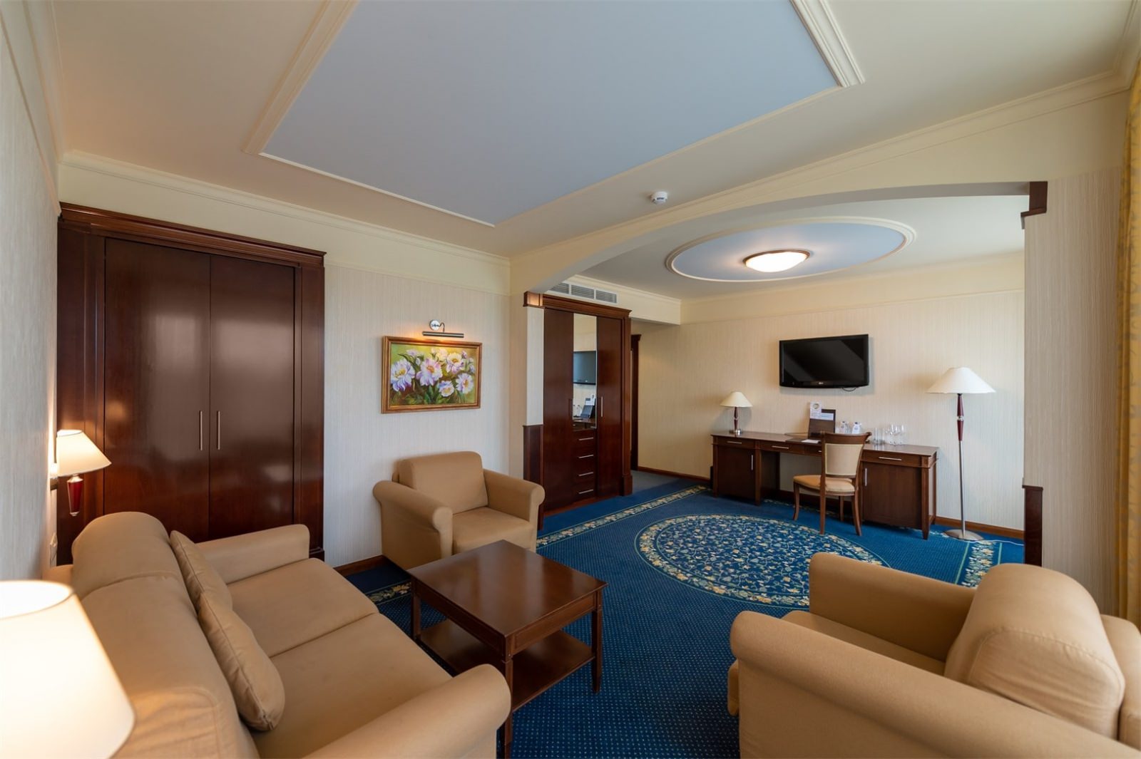 Апартаменты состоят из спальни, кухни, гостиной, гардеробной и отдельной ванной комнаты.