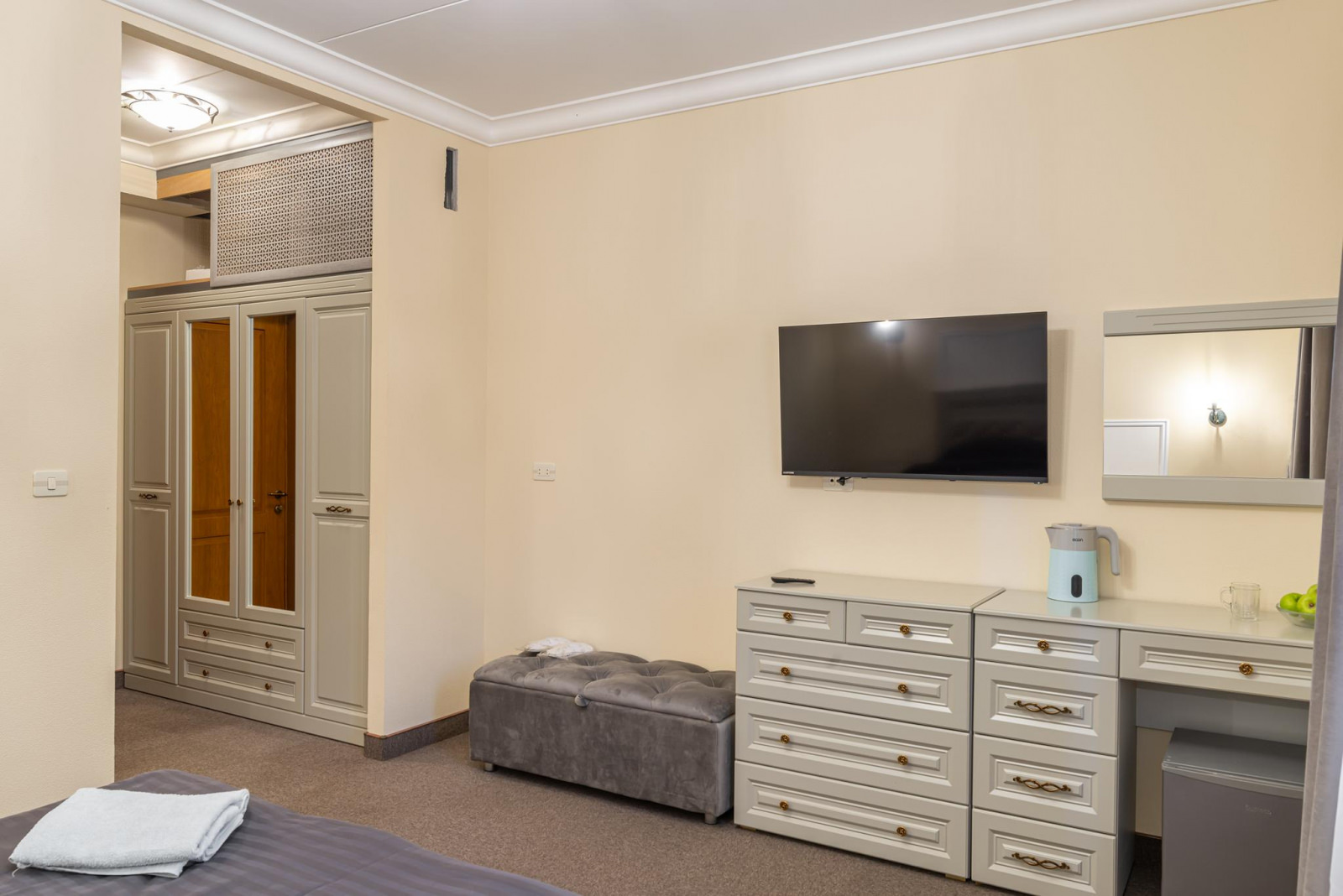 Стандартный номер — это идеальное сочетание комфорта и функциональности, предназначенное для одного или двух человек. Номер оформлен в современном стиле с уютной атмосферой, что делает его идеальным местом для отдыха после насыщенного дня.