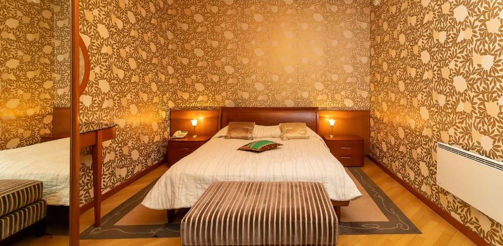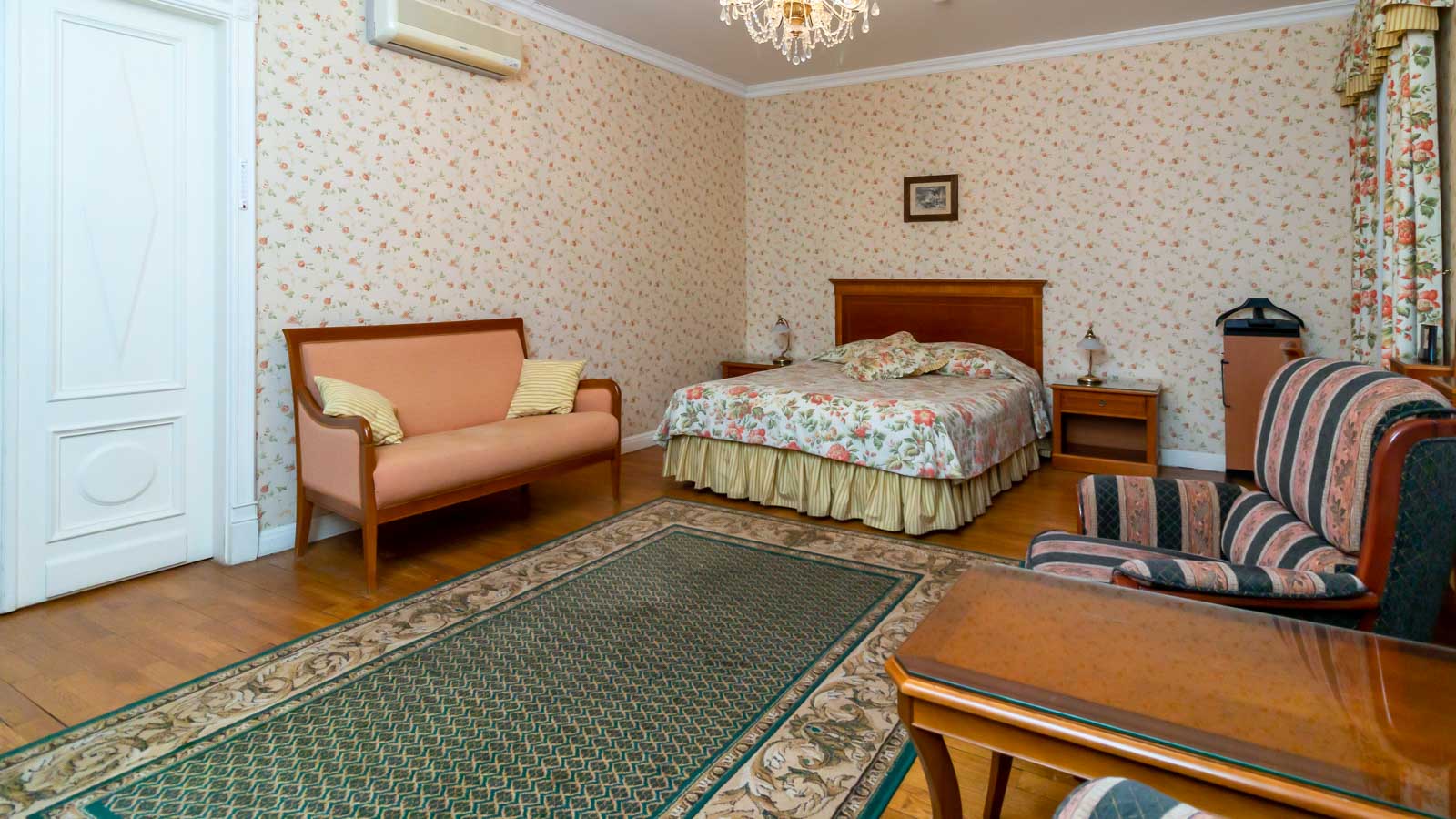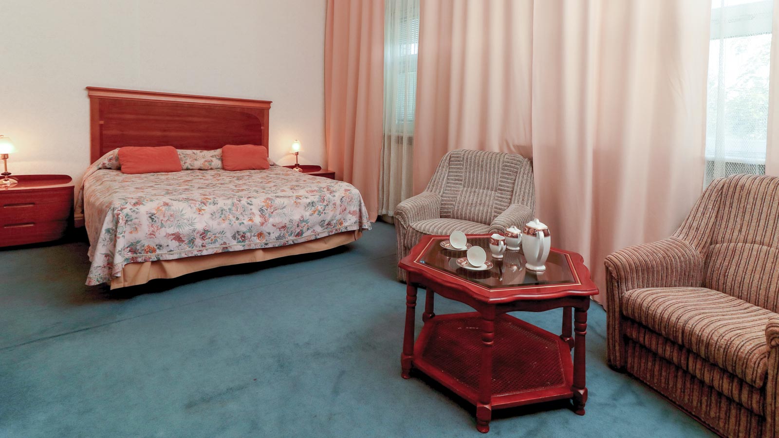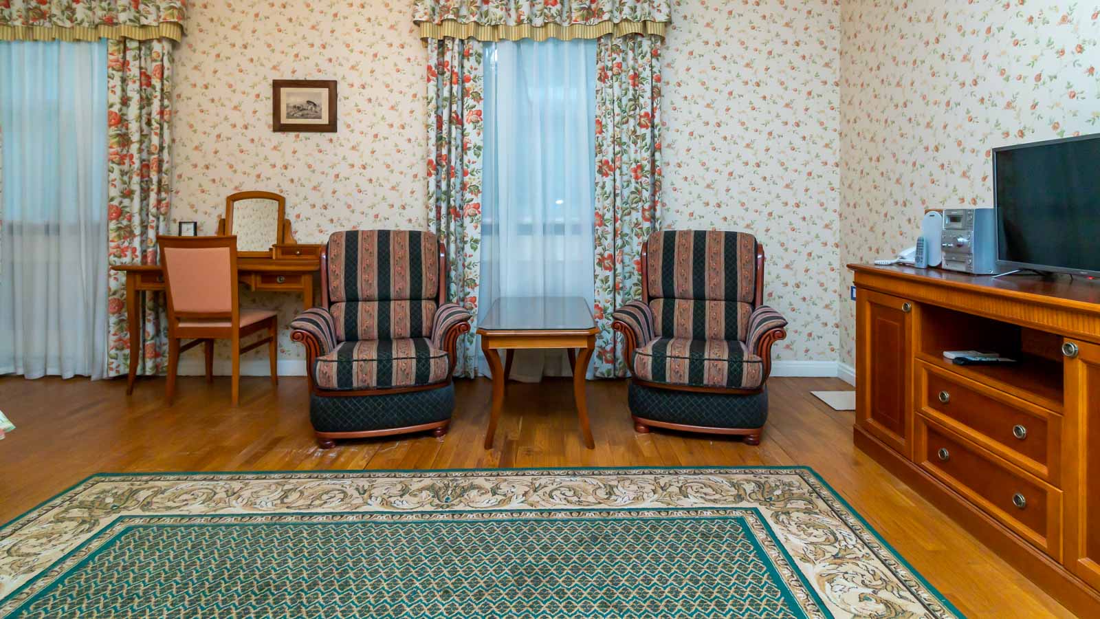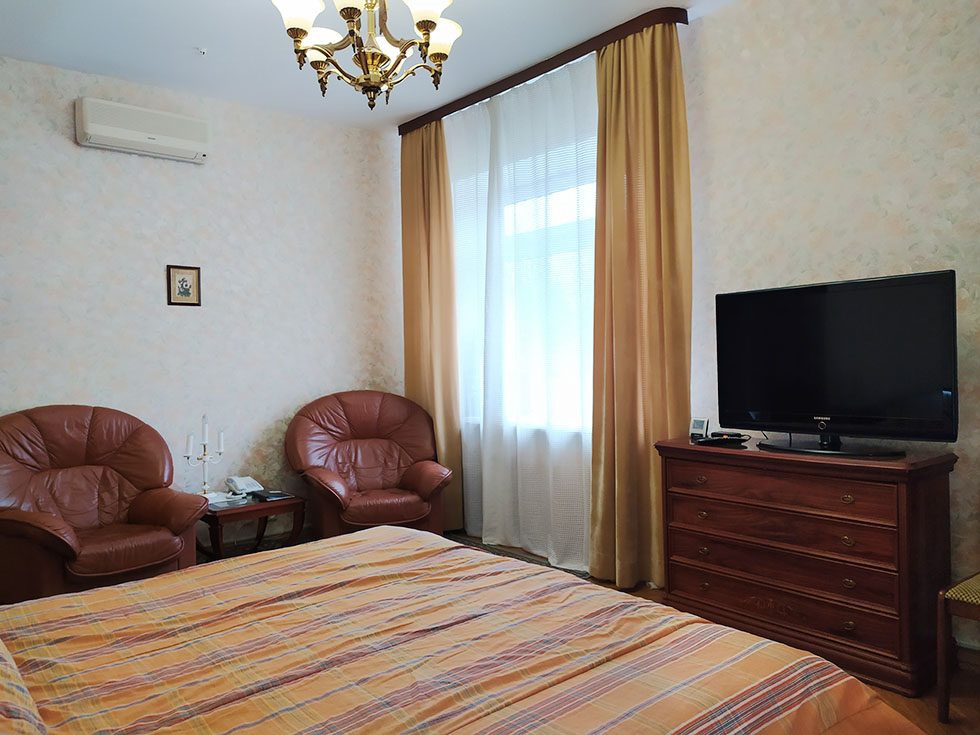 2 осн. места. 2 доп. места. Мебель: вешалка, диван, зеркало, кресло, кровати односпальные /одна двуспальная кровать, прикроватные тумбочки, стол, стулья, шкаф. Оборудование: гладильная доска, кондиционер, набор посуды, сейф, телевизор, телефон, утюг, холодильник, электрочайник. Санузел: с ванной, тапочки, туалетные принадлежности, фен, халат. Сервис: смена полотенец (ежедневно), смена постельного белья (ежедневно), уборка номера (ежедневно), услуги телефонной связи по территории отеля.