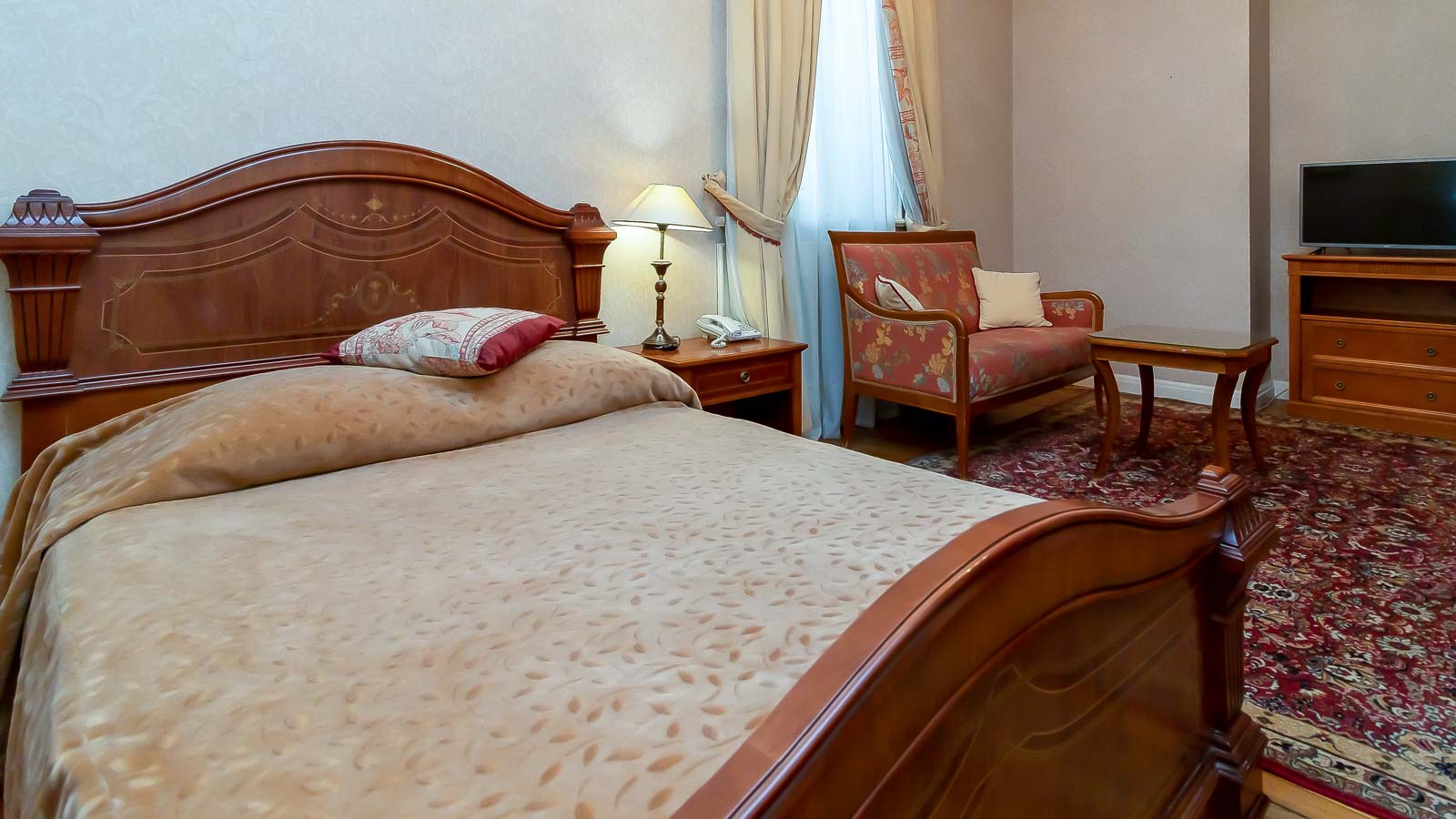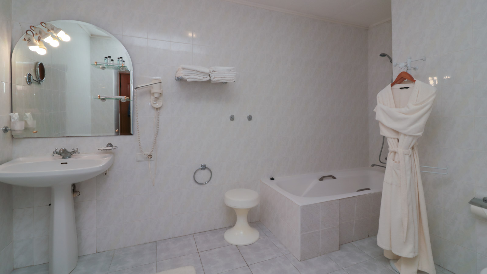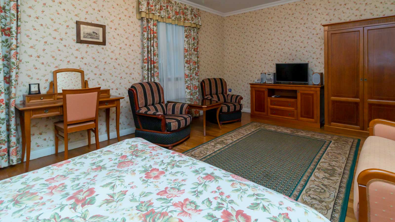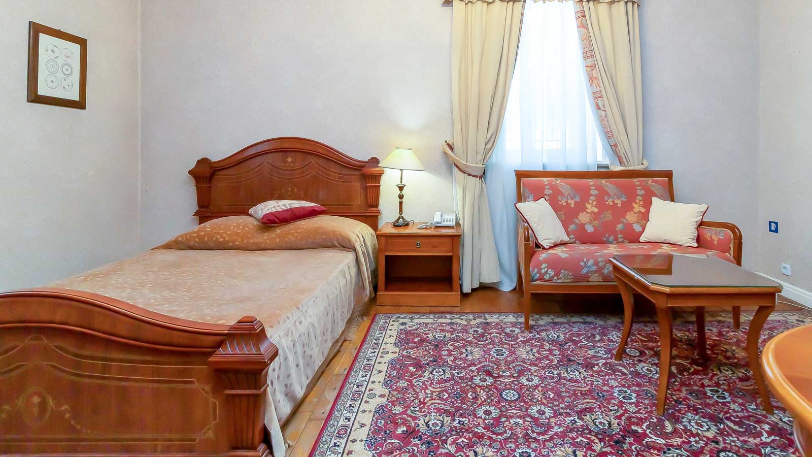 2 осн. места. 2 доп. места. Мебель: вешалка, диван, зеркало, кресло, кровати односпальные /одна двуспальная кровать, прикроватные тумбочки, стол, стулья, шкаф. Оборудование: гладильная доска, кондиционер, набор посуды, сейф, телевизор, телефон, утюг, холодильник, электрочайник. Санузел: с ванной, тапочки, туалетные принадлежности, фен, халат. Сервис: смена полотенец (ежедневно), смена постельного белья (ежедневно), уборка номера (ежедневно), услуги телефонной связи по территории отеля.