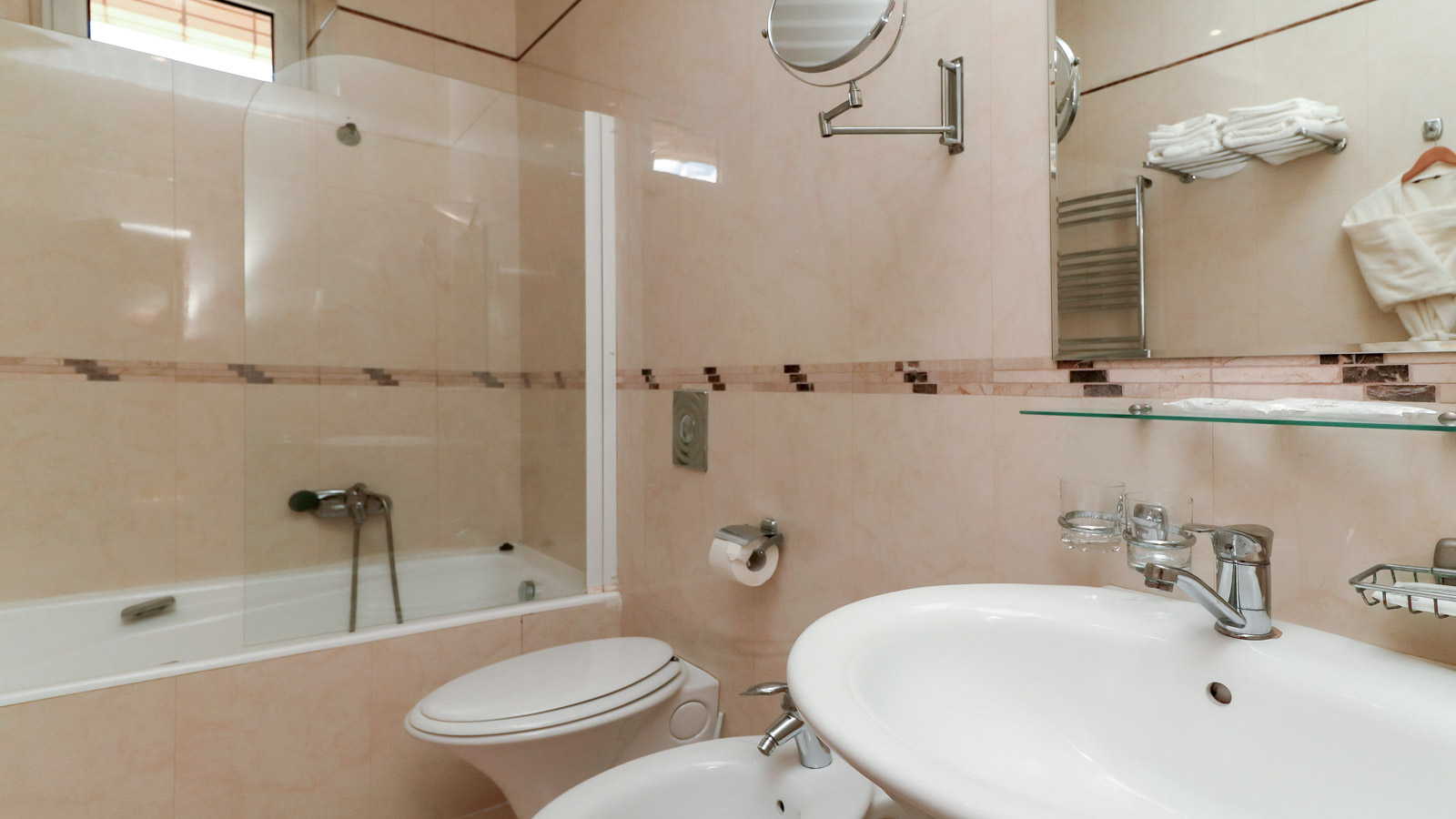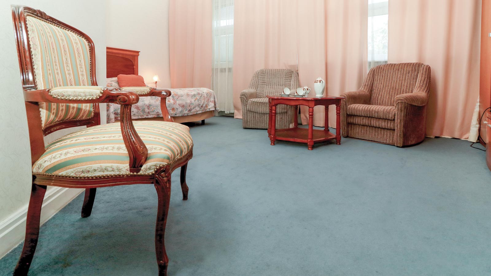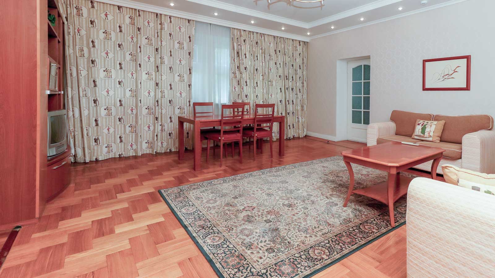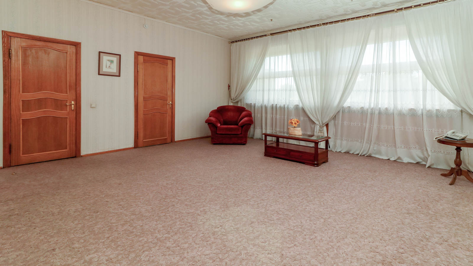 2 осн. места. 2 доп. места. Мебель: вешалка, диван, зеркало, кресло, кровати односпальные /одна двуспальная кровать, прикроватные тумбочки, стол, стулья, шкаф. Оборудование: гладильная доска, кондиционер, набор посуды, сейф, телевизор, телефон, утюг, холодильник, электрочайник. Санузел: с ванной, тапочки, туалетные принадлежности, фен, халат. Сервис: смена полотенец (ежедневно), смена постельного белья (ежедневно), уборка номера (ежедневно), услуги телефонной связи по территории отеля.