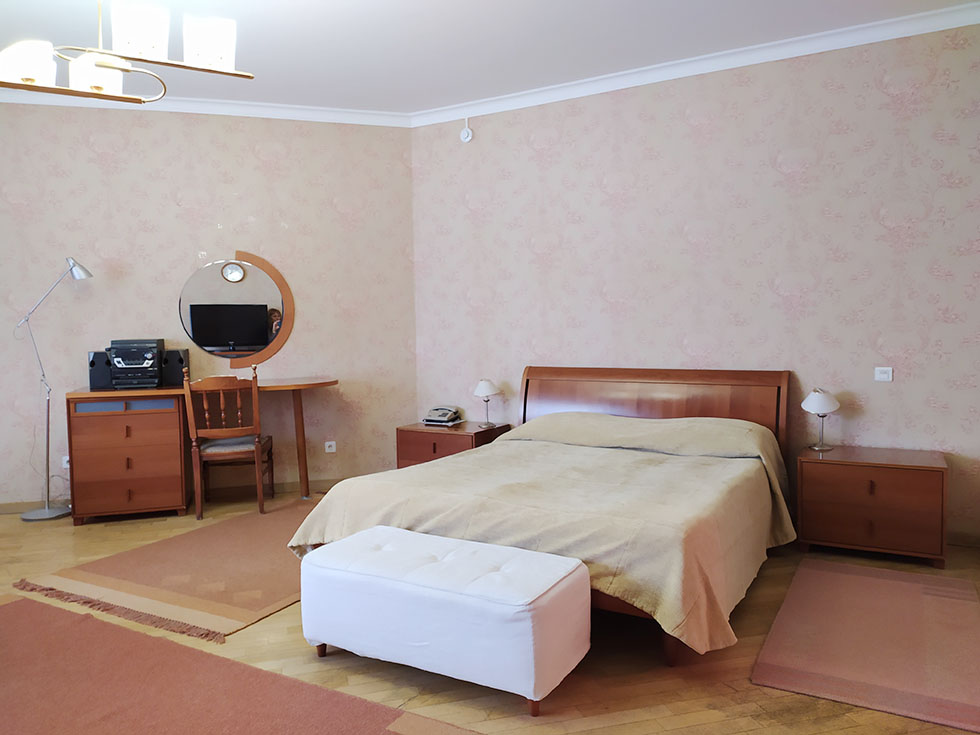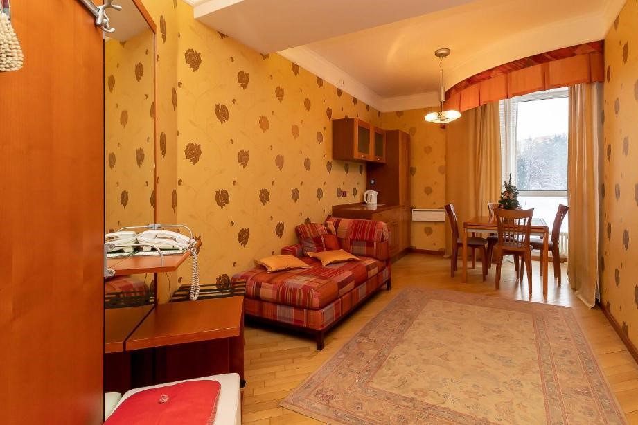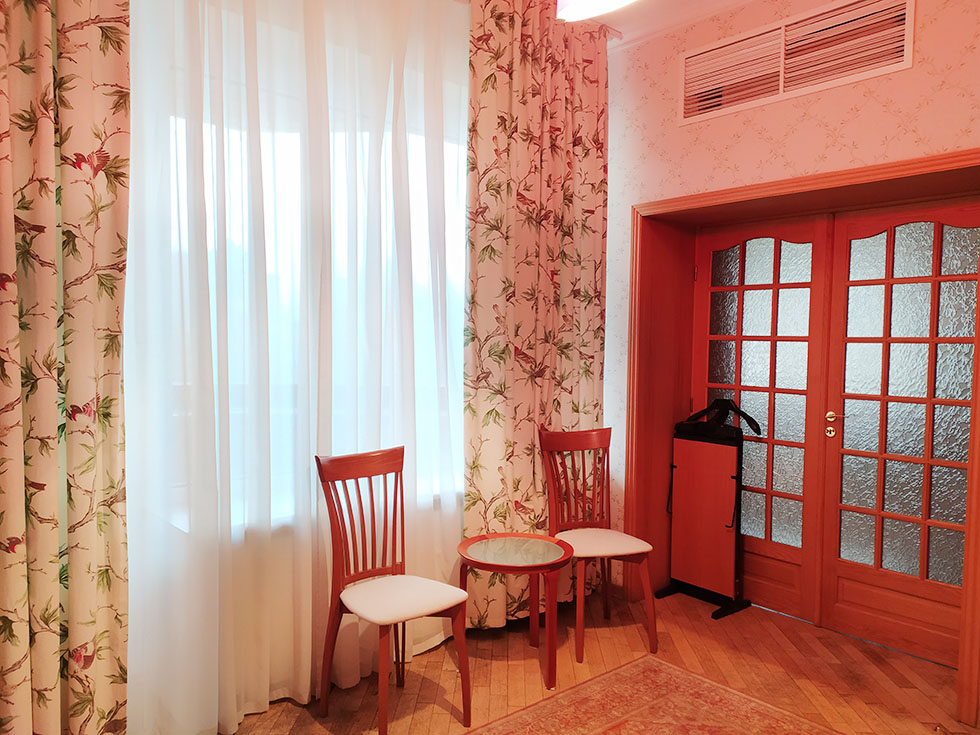 Площадь номера - 48 кв.м. 2 осн. места. 2 доп. места. Мебель: вешалка, кресла, кровать двуспальная, стол, шкаф. Мини-кухня. Оборудование: гладильная доска, кондиционер, микроволновая печь, набор посуды, сейф, телевизор, телефон, холодильник, электрочайник. Санузел: биде, с ванной, тапочки, туалетные принадлежности, фен, халат. Сервис: смена полотенец (ежедневно), смена постельного белья (ежедневно), уборка номера (ежедневно), услуги телефонной связи по территории отеля.