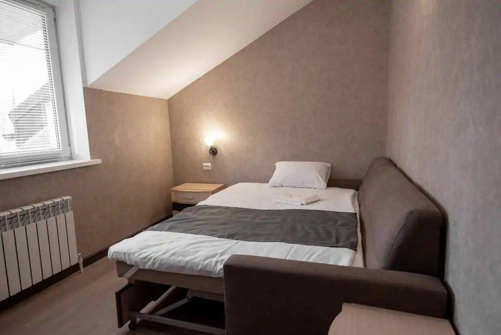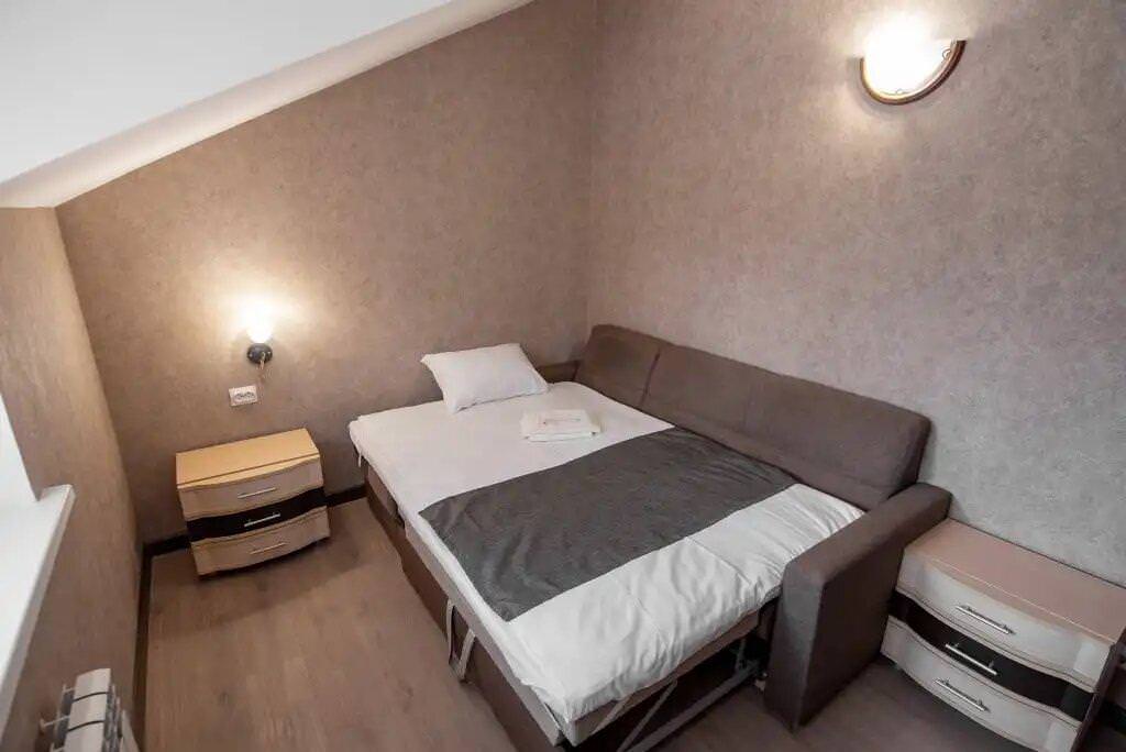 Одноместный номер стандарт с удобствами на этаже. Номер оснащен: телевизором с плоским экраном, прикроватной тумбочкой и односпальным раскладным диваном.