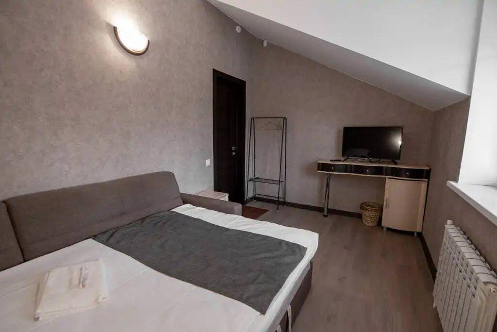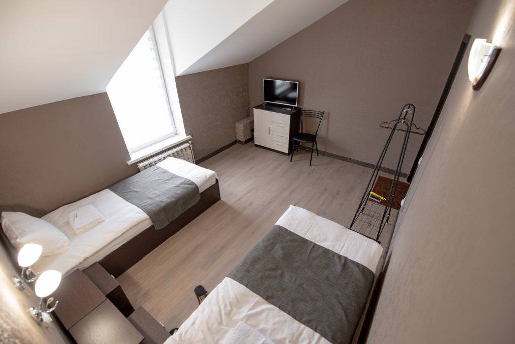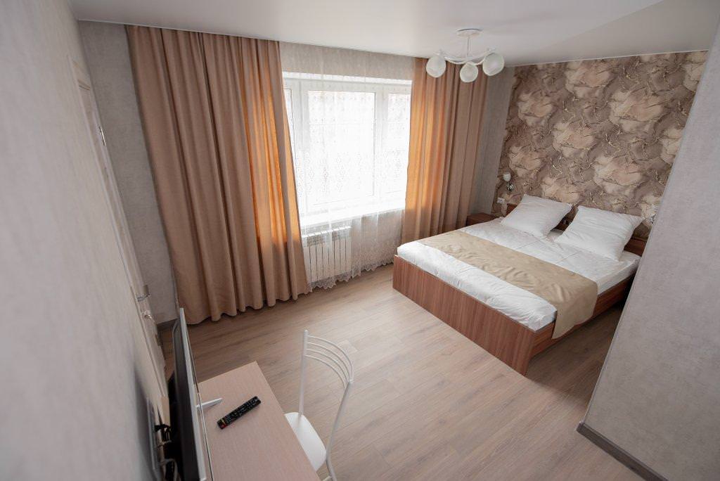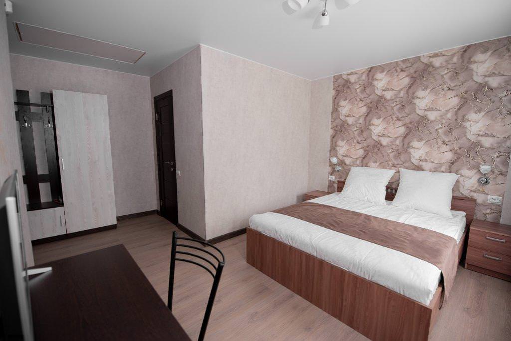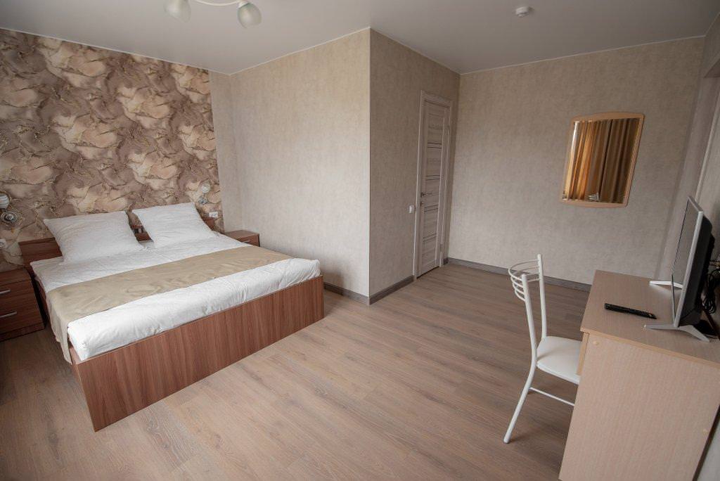Однокомнатный двухместный номер стандарт с удобствами в номере. В номере представлены: 1 двухспальная кровать, телевизор с плоским экраном, прикроватные тумбочки.