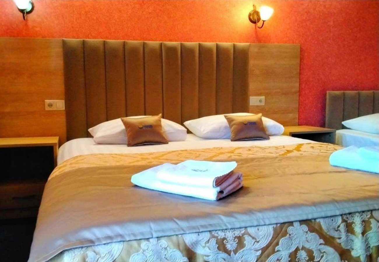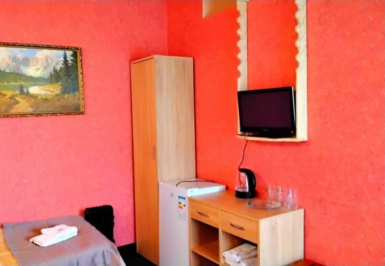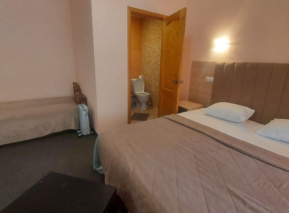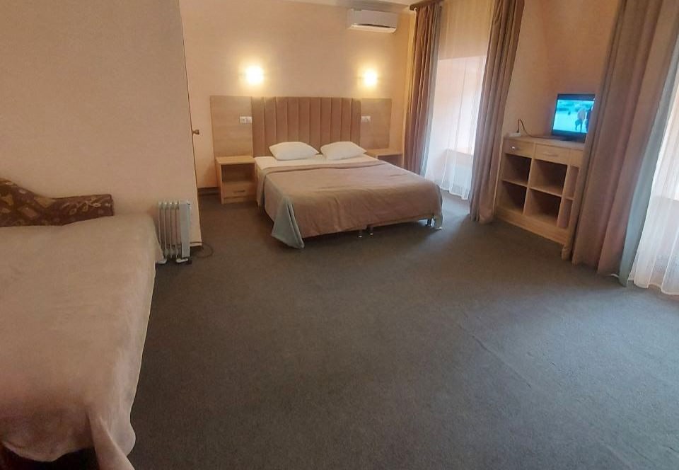 5 осн. мест. Мебель: вешалка, диван, зеркало, кровать двуспальная, кровать односпальная, прикроватные тумбочки, стол, стулья, шкаф. Оборудование: телевизор, холодильник, чайный набор посуды, электрочайник. Санузел: с душем, фен. Сервис: Wi-Fi бесплатно, смена полотенец, смена постельного белья, уборка номера.