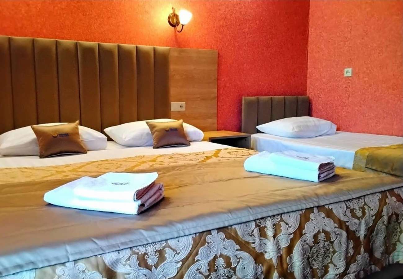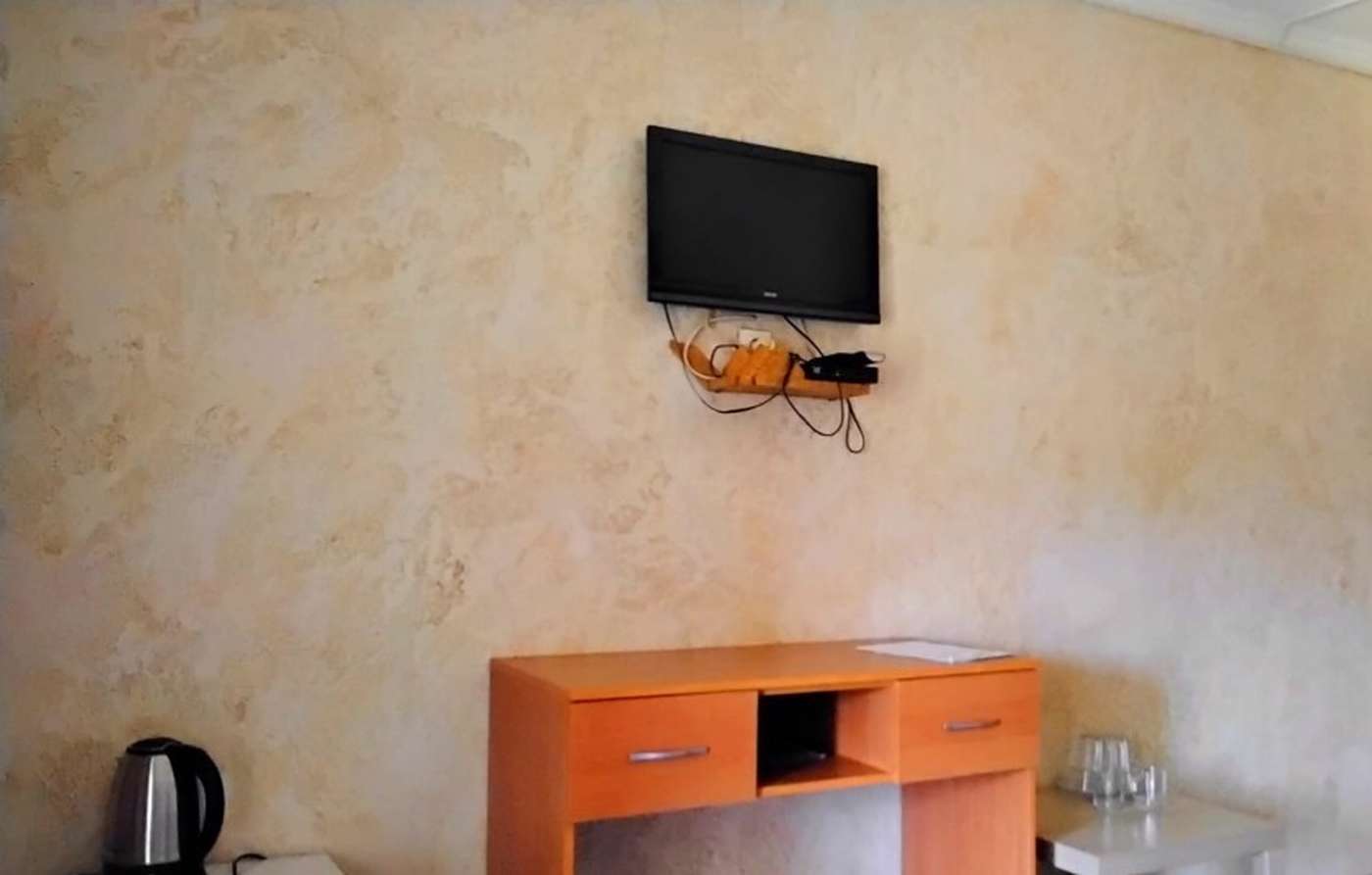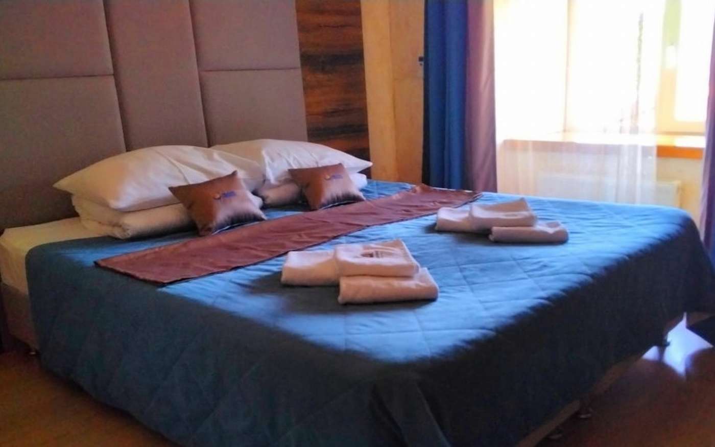 5 осн. мест. Мебель: вешалка, диван, зеркало, кровать двуспальная, кровать односпальная, прикроватные тумбочки, стол, стулья, шкаф. Оборудование: телевизор, холодильник, чайный набор посуды, электрочайник. Санузел: с душем, фен. Сервис: Wi-Fi бесплатно, смена полотенец, смена постельного белья, уборка номера.