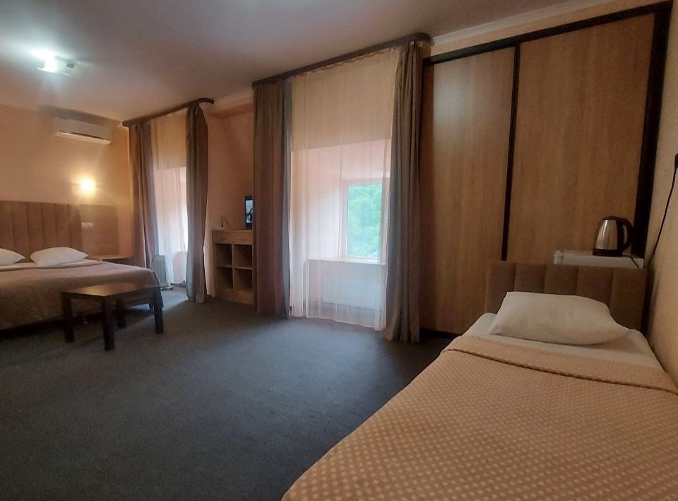 3 осн. места. Балкон. Мебель: вешалка, зеркало, кровать двуспальная, кровать односпальная, прикроватные тумбочки, стол, стул, шкаф. Оборудование: телевизор, холодильник, чайный набор посуды, электрочайник. Санузел: с душем, фен. Сервис: Wi-Fi бесплатно, смена полотенец, смена постельного белья, уборка номера.