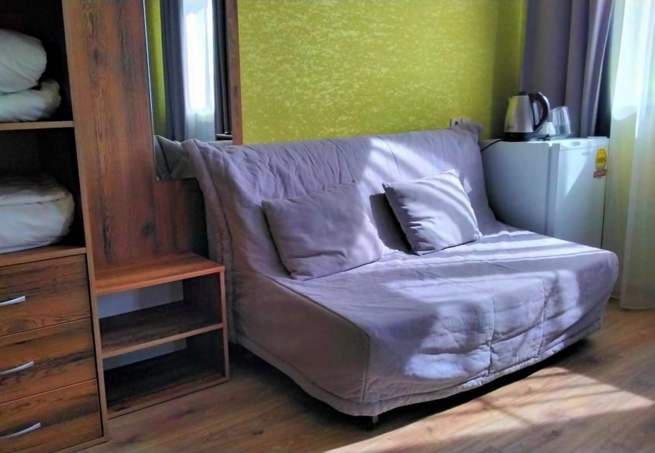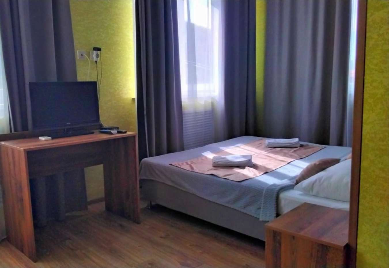 3 осн. места. Мебель: вешалка, диван, зеркало, кровать двуспальная, прикроватные тумбочки, стол, стул, шкаф. Оборудование: телевизор, холодильник, чайный набор посуды, электрочайник. Санузел: с душем, фен. Сервис: Wi-Fi бесплатно, смена полотенец, смена постельного белья, уборка номера.