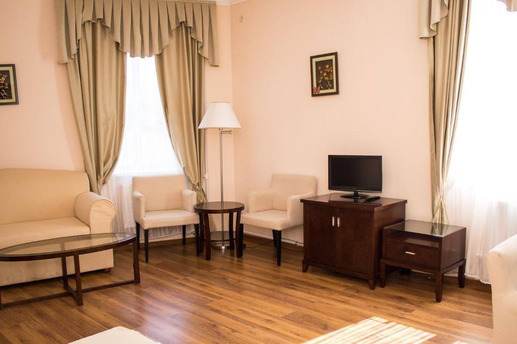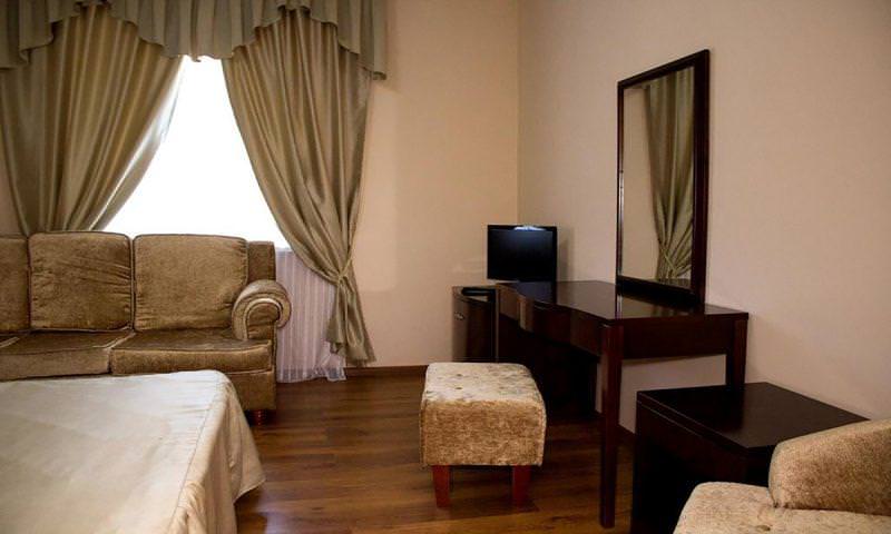 Двухкомнатный номер стандарт семейный общей площадью 49 кв.м. для размещения от 1 до 4х гостей. В номере: две двухспальные кровати, диван, телевизор, сейф, кондиционер, мини-холодильник, туалетный столик, собственная ванная комната, туалетно-косметические принадлежности.