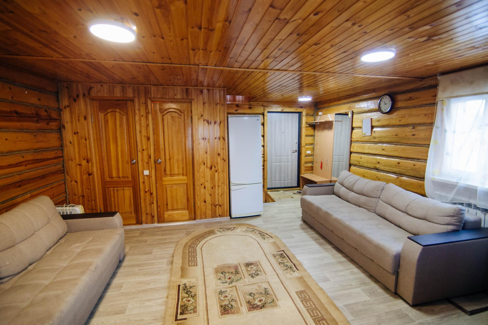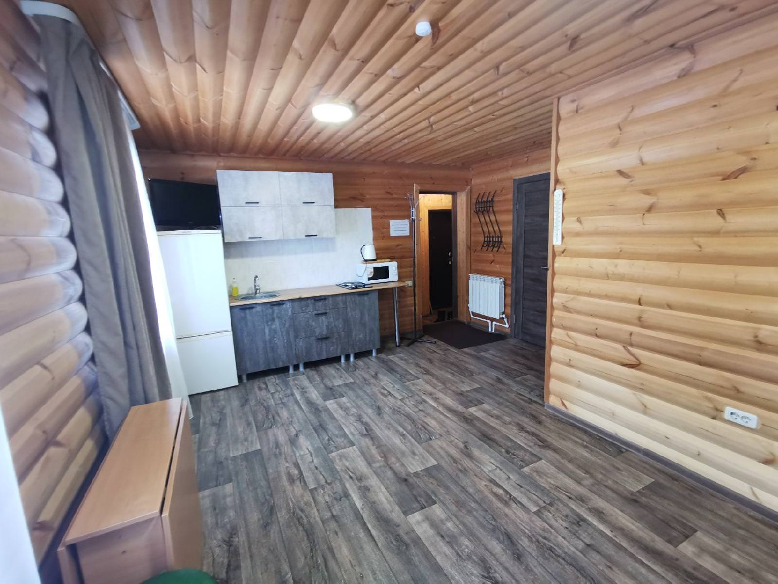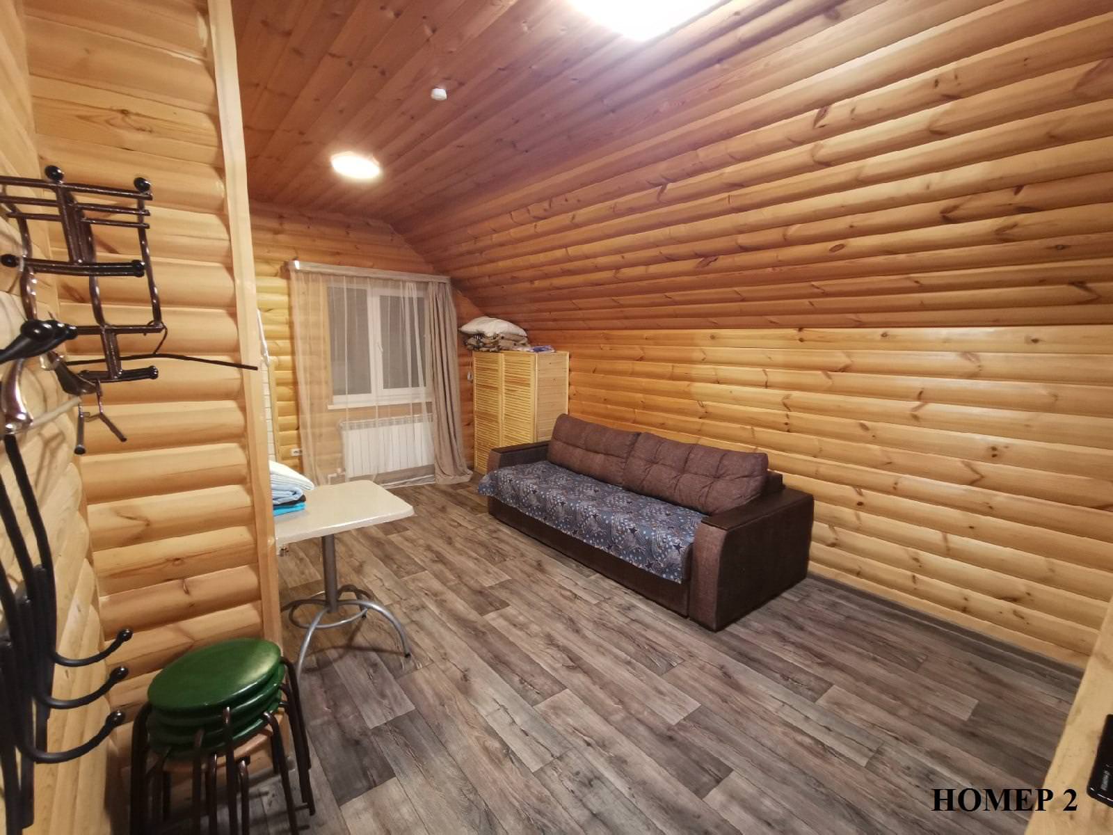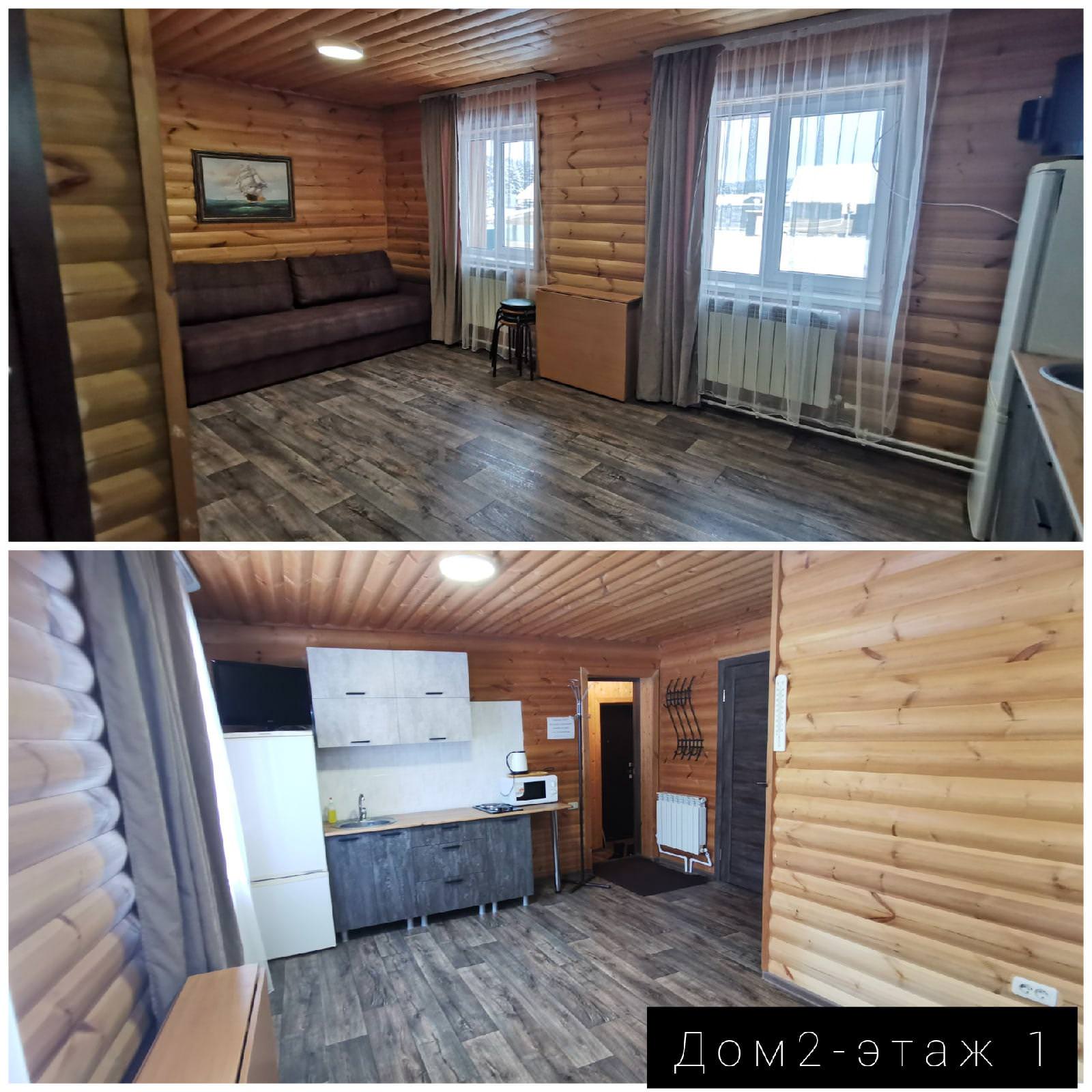 Коттедж для компании, 2-х этажный дом, рассчитанный на 8-10 спальных мест. На первом этаже располагается большая гостиная и кухонная зона, укомплектованная всем необходимым. Раздельный санузел. Также есть спутниковое телевидение от Триколор и Wi-Fi на территории. На втором этаже — 4 кровати односпальные и 1 кровать двуспальная.