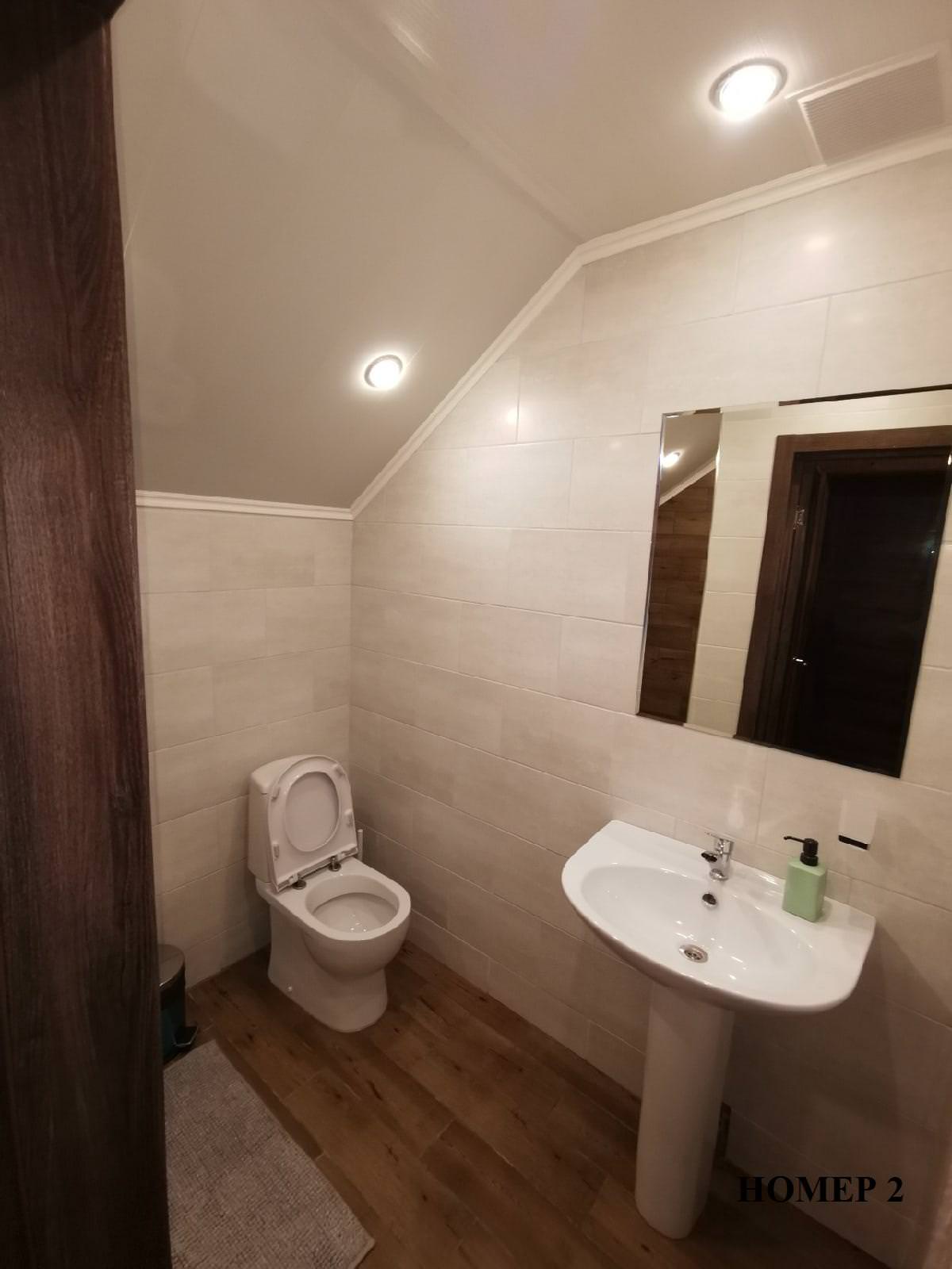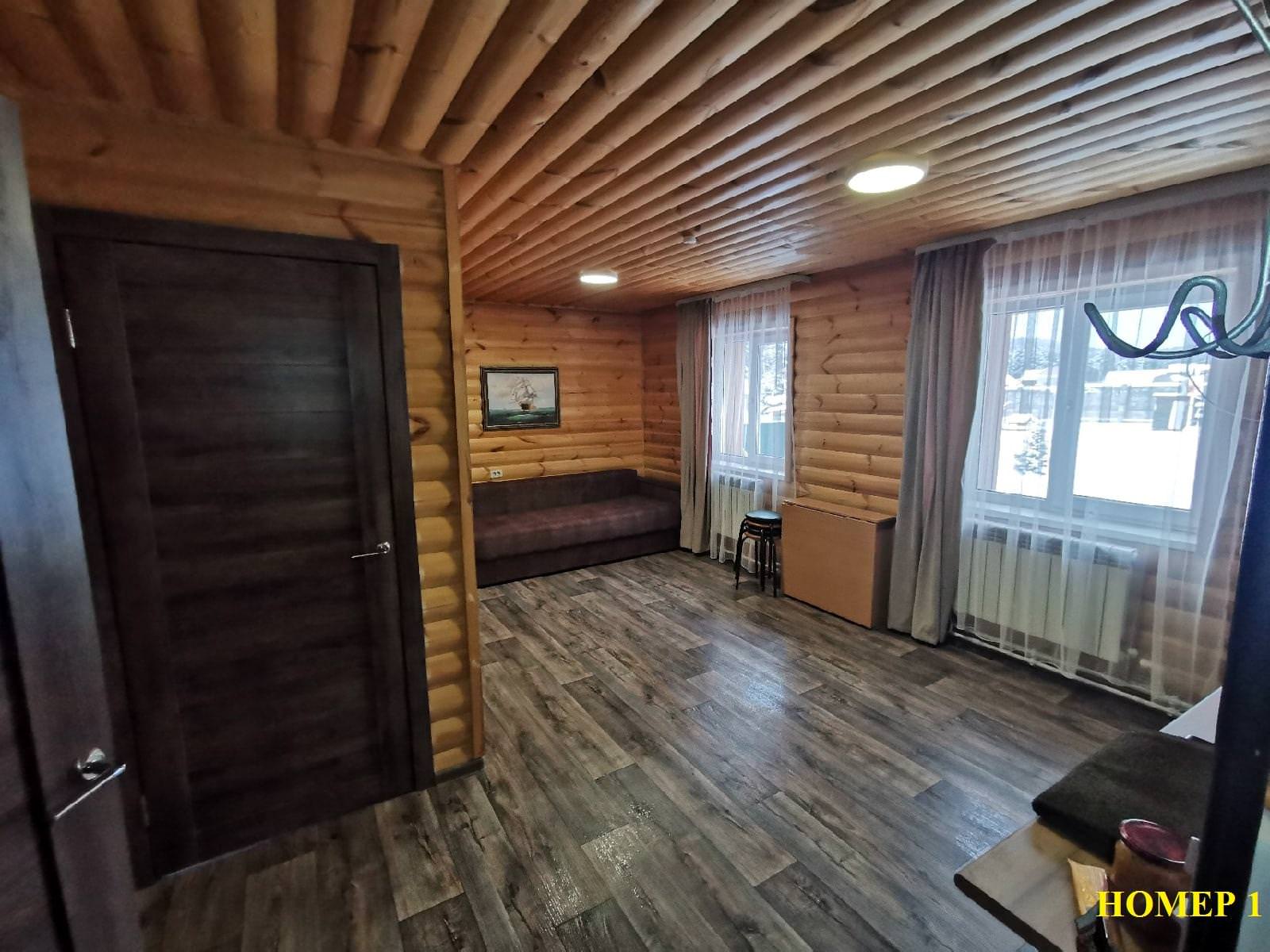 Семейный номер сдается поэтажно, вход на каждый этаж раздельный, гостям не придется встречаться с соседями в самом доме. На каждом этаже гостиная совмещенная с кухонной зоной, спальня, санузел. Каждый этаж рассчитан на 6 спальных мест. Первая комната: гостиная с 2-мя диванами и кухонная зона, укомплектованная всем необходимым. Вторая комната: спальня с двумя кроватями.