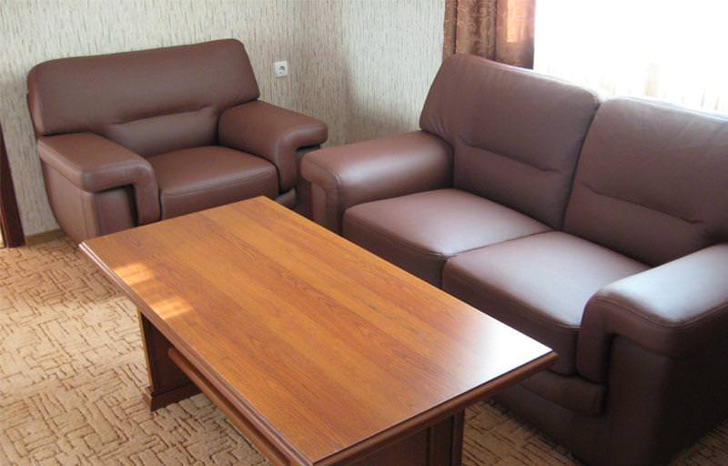 Двухкомнатный номер Люкс расположен в основном корпусе на 1 этаже. В номере двуспальная кровать, прикроватные тумбочки, телевизор. В холле уютный мягкий диванчик с креслами, журнальный столик, зеркало, шкаф. Для Вашего удобства холодильник и чайник под запрос.