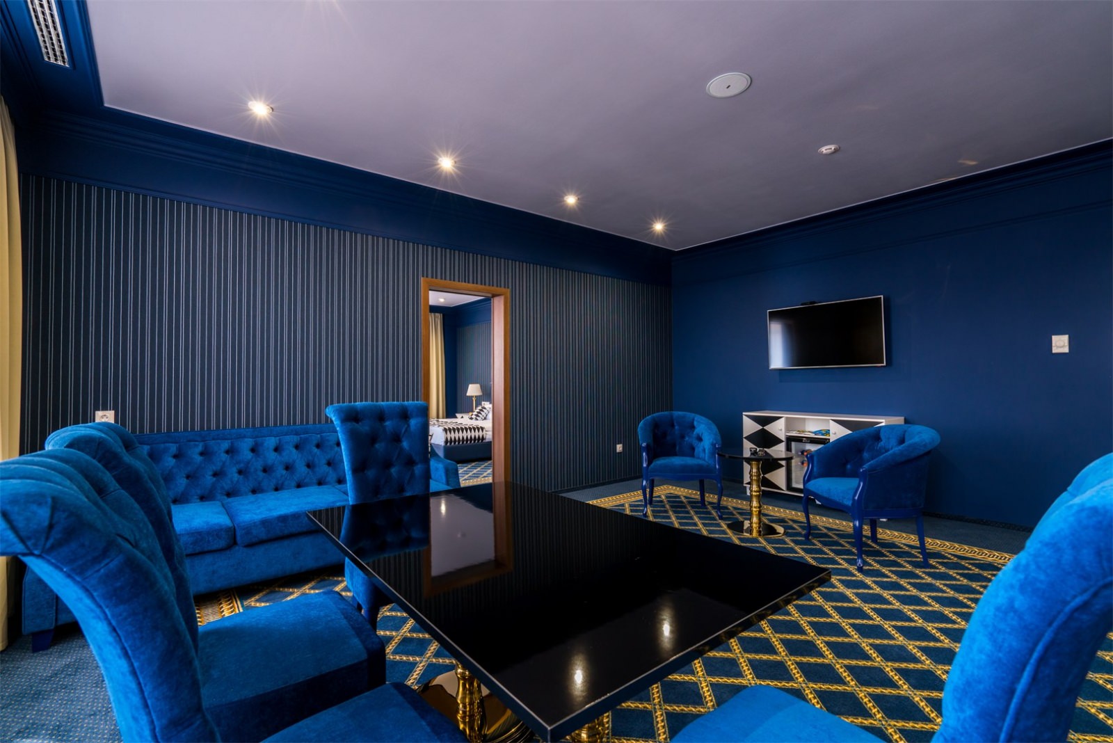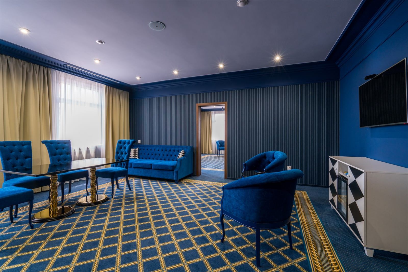 Элегантные Представительские люксы, площадью 87 м2. каждый, одинаково комфортны как для работы и проведения деловых встреч, так и для отдыха. Освещенные люстрами Swarovski, они состоят из просторного холла, уютной спальни и светлой гостиной с выделенной рабочей зоной.