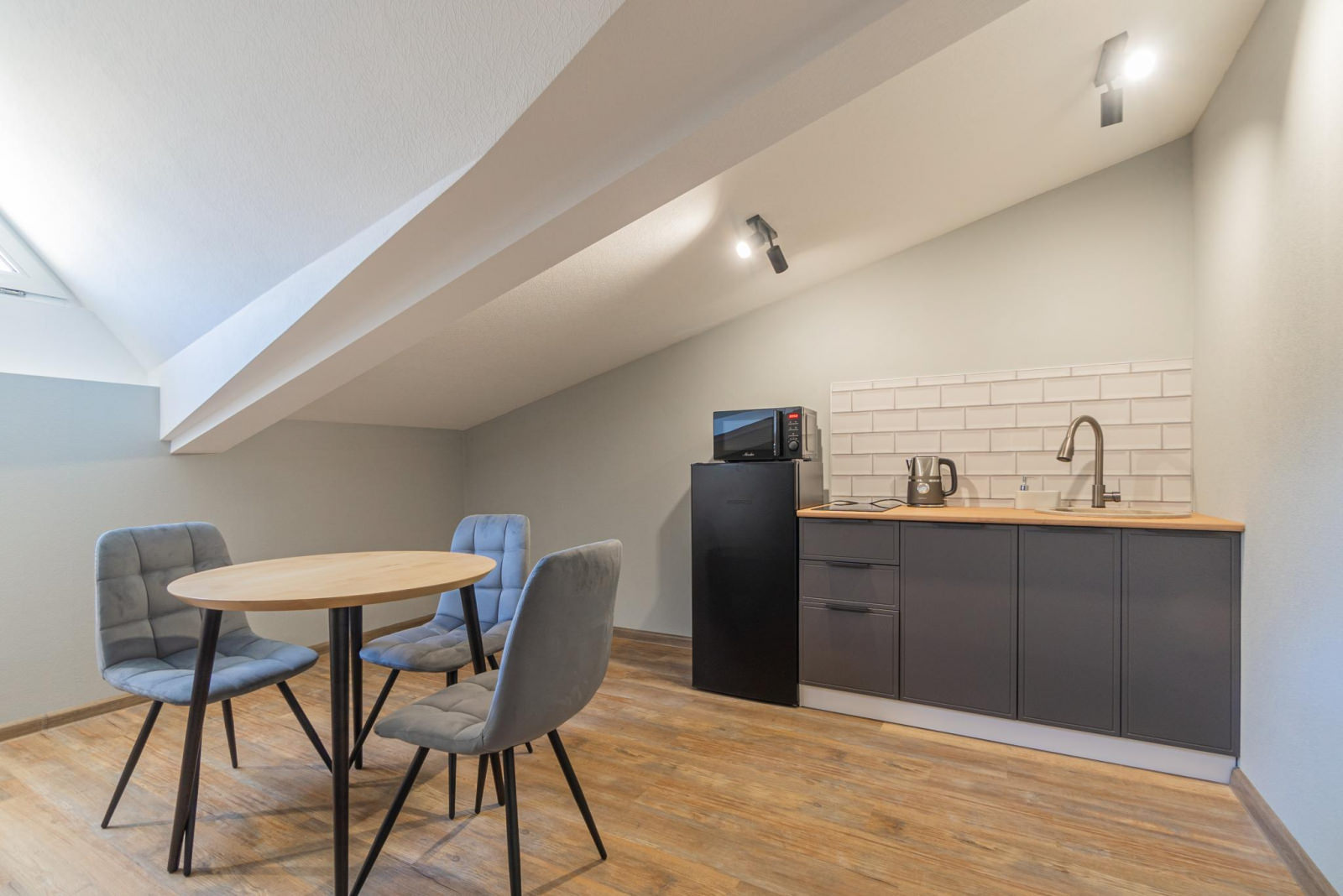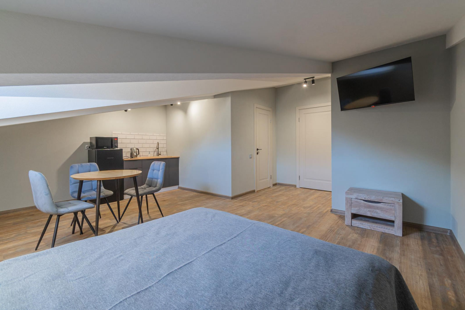 Номер стандарт (мансарда). С нетерпением ждём вас в нашем номере стандарт! Этот небольшой, но невероятно уютный номер на мансардном этаже подарит вам уединенное пространство и комфорт, где все под рукой. Его метраж идеально подходит для отдыха и уединения. Номер оснащен двуспальной кроватью с ортопедическим матрасом, обеспечивающей качественный сон и отдых. По обе стороны от кровати находятся прикроватные тумбы, а бра с дополнительным освещением создадут приятную атмосферу для чтения или вечернего отдыха. В распоряжении гостей также большой телевизор и бесплатный Wi-Fi, чтобы вы могли оставаться на связи и наслаждаться любимыми программами. Полностью оборудованная кухня включает в себя холодильник, варочную панель, микроволновку и всю необходимую посуду для приготовления пищи, а также столовые приборы. Это позволит вам чувствовать себя как дома и готовить ваши любимые блюда. Вместительный шкаф обеспечит достаточно места для хранения всех ваших вещей. Для удобных трапез предусмотрен стол с мягкими стульями. В ванной комнате вы найдете душевую кабину и санузел, а также зеркало с подсветкой, фен и бесплатные средства личной гигиены. Мягкие полотенца и возможность замены постельного белья сделают ваше пребывание еще более комфортным. При необходимости мы предоставим дополнительное спальное место или детскую кроватку, чтобы ваш отдых был максимально удобным. Остановитесь у нас и оцените уют и удобство нашего номера стандарт!