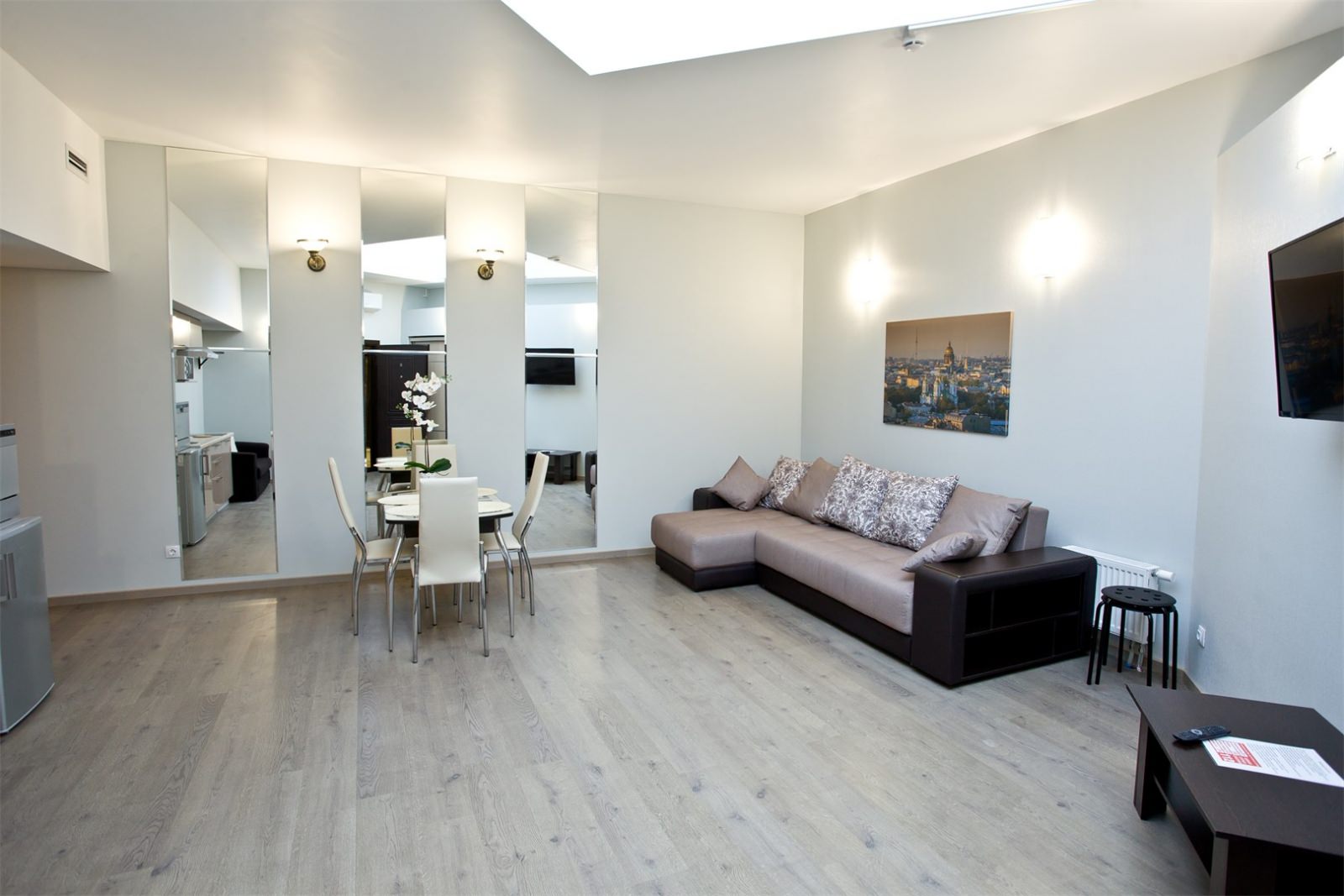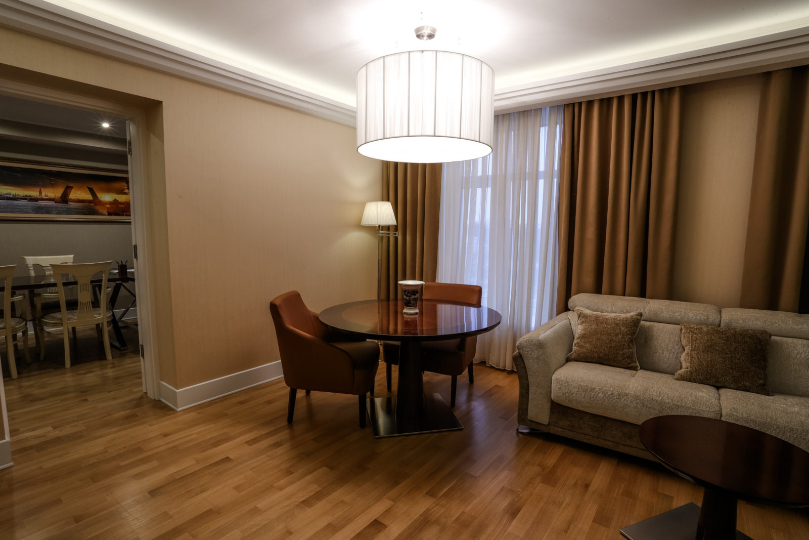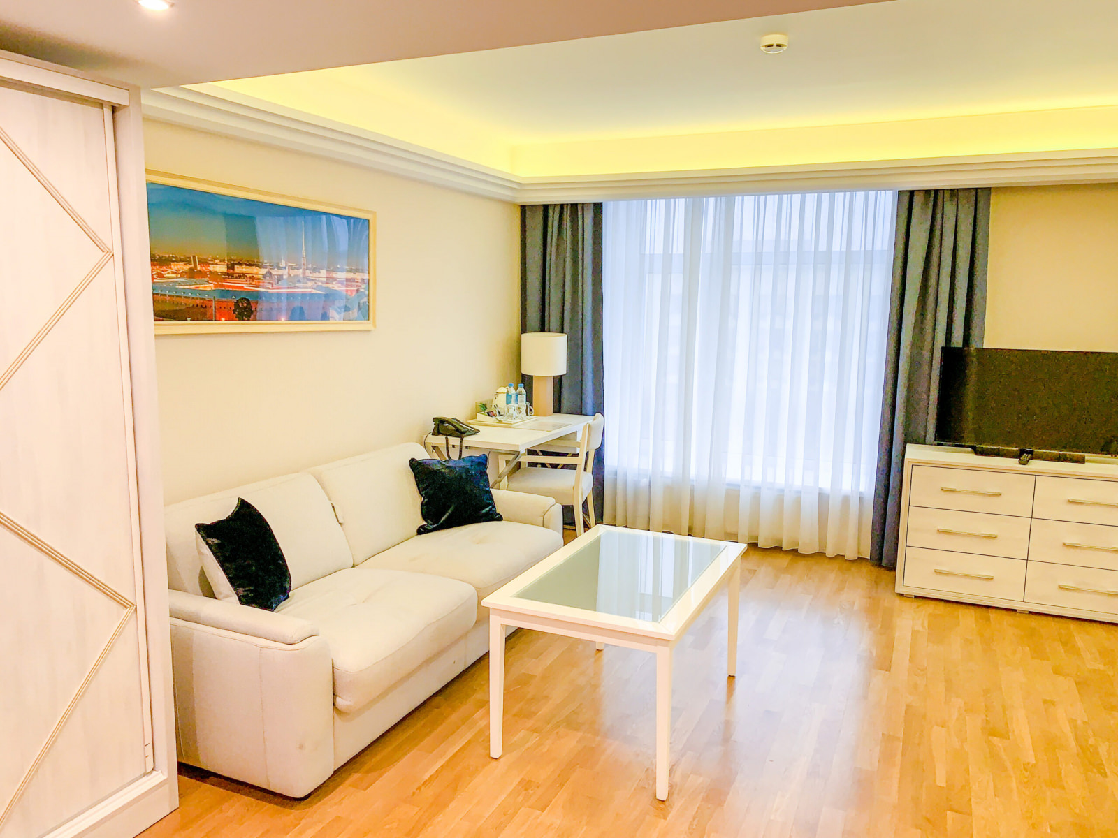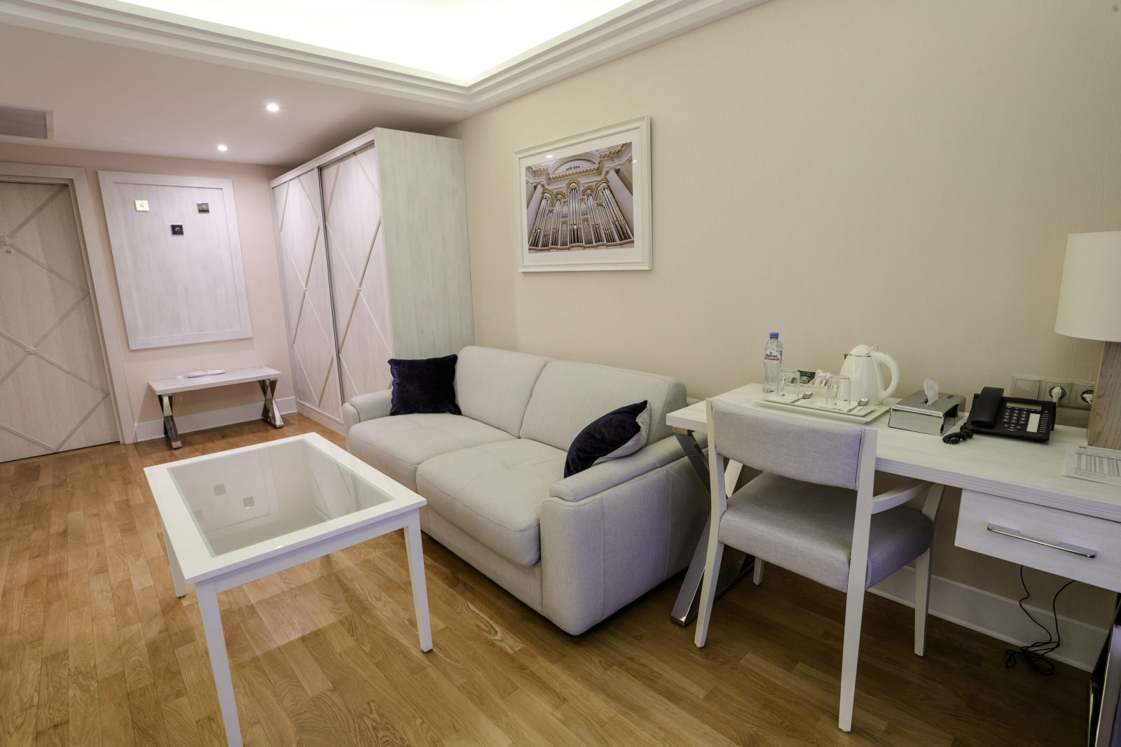2 осн. места. 2 доп. места. Мебель: вешалка, диван, зеркало, кровать двуспальная, прикроватные тумбочки, стол, столик журнальный, стулья, шкаф. Оборудование: мини-холодильник, сейф, система общего кондиционирования, телевизор ЖК, телефон, чайный набор посуды, электрочайник. Санузел: с душем, тапочки, туалетные принадлежности, фен, халат. Сервис: Wi-Fi бесплатно, смена полотенец, смена постельного белья, уборка номера, услуги внутренней телефонной связи.