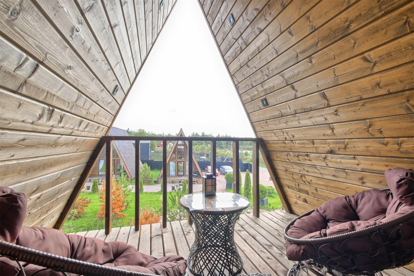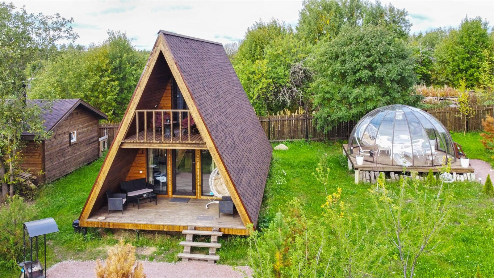 Треугольный дизайнерский домик— шале с балконом (вместимость до 10 человек), общая площадь 72 кв.м. Дом для отдыха полностью выполнен из дерева и оборудован для комфортного отдыха. В доме теплые водяные полы с датчиком регулировки температуры, настенный кварцевый обогреватель, вентилятор, установлен бойлер, современный экологический септик. В доме есть все необходимое для комфортного проживания: - Мини-кухня (большой обеденный стол и стулья, холодильник, микроволновая печь, набор посуды/утвари для приготовления еды и красивой сервировки стола, чайник, индукционная плита, средства для мытья посуды, губки, кухонные полотенца); - Гостиная с панорамными окнами в пол с видом на лес (в гостиной: ЖК телевизор, подвесное кресло/кокон с подсветкой, три дивана/кровати с независимыми пружинными блоками и ортопедическим основанием, - Две изолированные спальные комнаты (в одной комнате одна двуспальная кровать, во второй две односпальные, прикроватные тумбочки. Все спальные места укомплектованы ортопедическими матрасами и застелены премиальным белоснежным постельным бельем (хлопок/сатин); - Ванная комната (фен, гипоаллергенные крем/гель для душа и гель мыло для рук, шампунь, наборы полотенец); - Санузел (туалетная бумага, дезинфицирующие средства, освежитель воздуха); - Собственная крытая мангальная зона (шампура и принадлежности для барбекю предоставляются в аренду); - Детская кровать и стул (за дополнительную плату) - Утюг и гладильная лоска (по запросу); - Wi-Fi (оптоволокно).