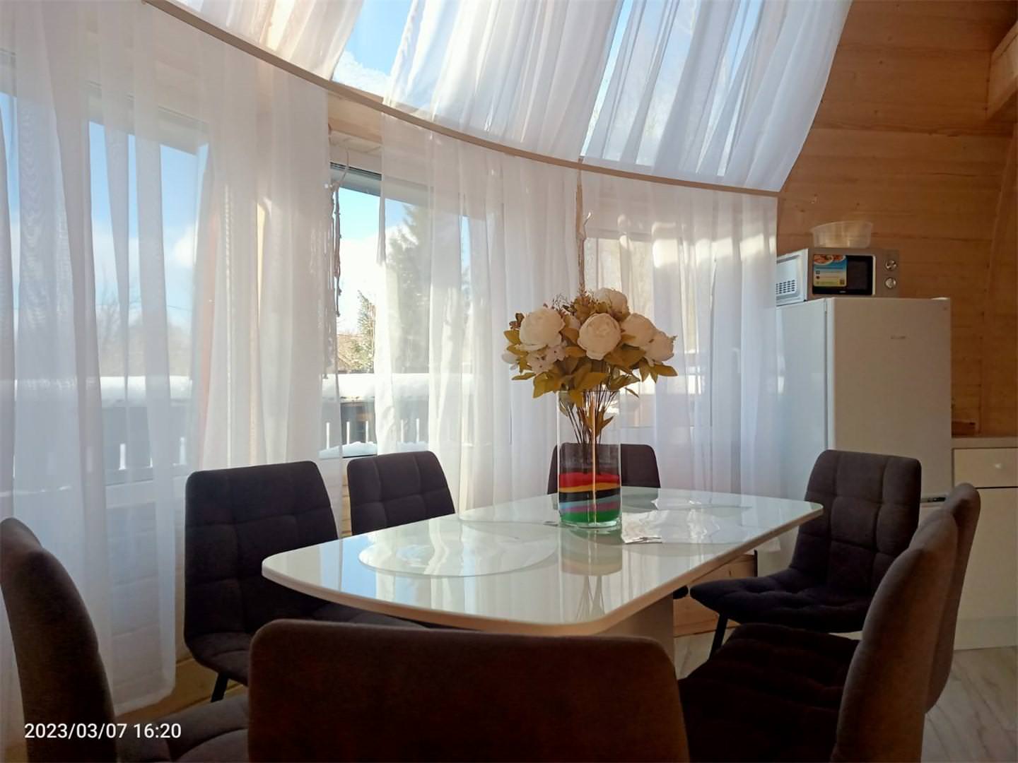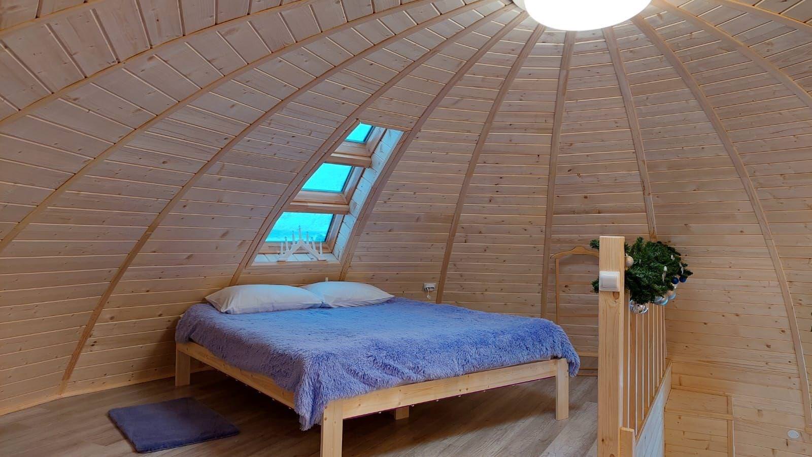 Купольный дом- шале с крытой террасой по периметру (вместимость до 10 человек), общая площадь 64 кв.м. Дом полностью оборудован для комфортного отдыха, декодер- дерево, также в доме присутствует изюминка в виде дизайнерского освещения. В доме теплые водяные полы с датчиком регулировки температуры, настенный кварцевый обогреватель, вентилятор, установлен бойлер, современный экологический септик. В доме есть все необходимое для комфортного проживания: - Мини-кухня (большой раскладной обеденный стол и стулья, холодильник, микроволновая печь, набор посуды/утвари для приготовления еды и красивой сервировки стола, электрический чайник, индукционная плита, средства для мытья посуды, губки, кухонные полотенца); - Гостиная с панорамными окнами в пол (ЖК телевизор, электрический камин, диван/кровать с независимым пружинным блоком и ортопедическим основанием, комод); - Изолированная спальная на первом этаже (двуспальная кровать 160х120, диван/кровать с независимым пружинным блоком и ортопедическим основанием, шкаф платяной, прикованные тумбы); - Спальная на втором этаже (двуспальная кровать 160х120, диван/кровать с независимым пружинным блоком и ортопедическим основанием, прикроватные тумбы, дизайнерские кресла, журнальный стол, напольная вешалка) *Все спальные места укомплектованы ортопедическими матрасами и застелены премиальным белоснежным постельным бельем (хлопок/сатин); - Ванная комната (фен, гипоаллергенные крем/гель для душа и гель мыло для рук, шампунь, наборы полотенец); - Санузел (туалетная бумага, дезинфицирующие средства, освежитель воздуха); - Собственная крытая мангальная зона (шампура и принадлежности для барбекю предоставляются в аренду); - Детская кровать и стул (за дополнительную плату) - Утюг и гладильная лоска (по запросу); - Wi-Fi (оптоволокно).