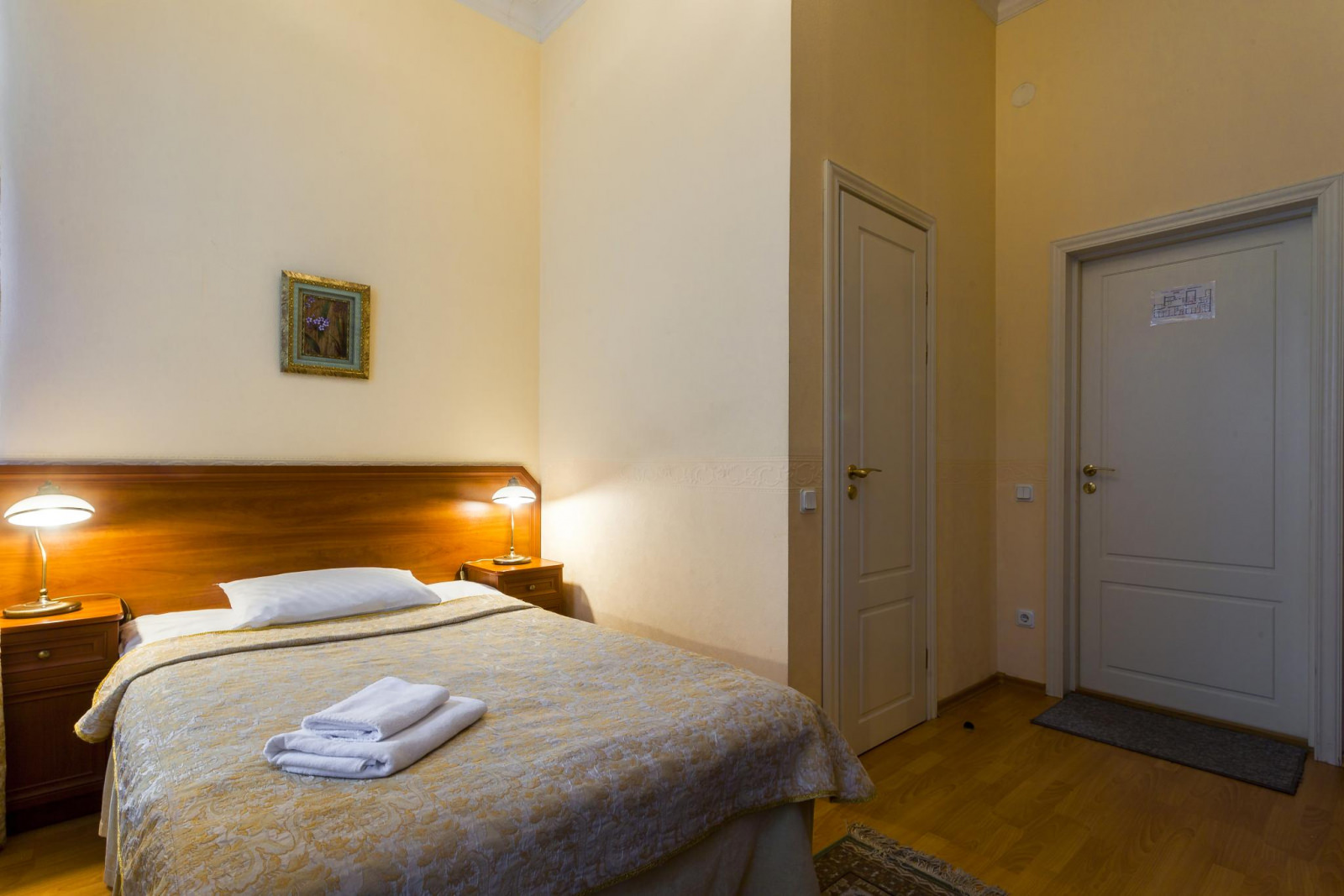 Площадь комнаты: 17 кв. метров. В комнате одна широкая двуспальная кровать (180 см). По желанию можно сделать две отдельные кровати. В комнате удобная мебель — шкаф со встроенным сейфом, рабочий стол, ванная комната с душем, телефон, телевизор, фен. В комнатах №№ 12, 13 есть кондиционеры.