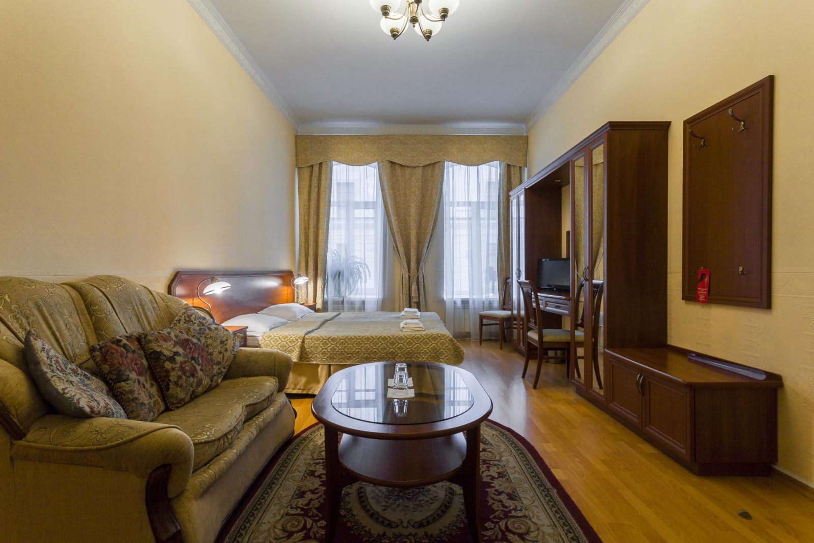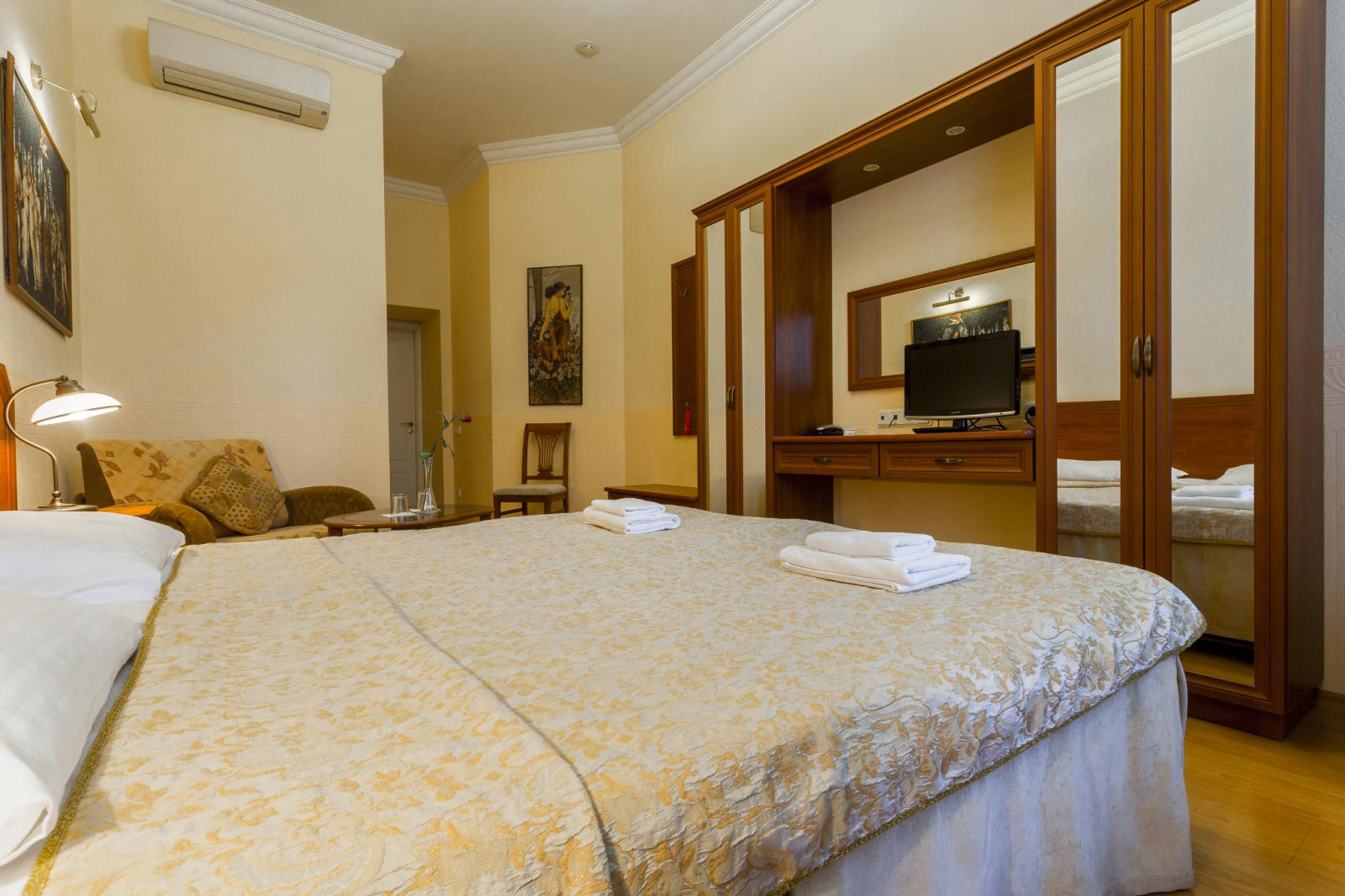 Площадь комнаты — 20 кв.метров. Уютнаякомнатас двумя кроватями (по-желанию — с одной большой) и удобным креслом-кроватью (90 см. ширина). Все удобства: ванная комната с душем, телевизор, телефон, кондиционер, спутниковое телевидение, сейф, фен.