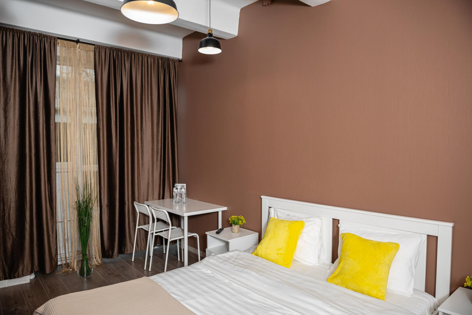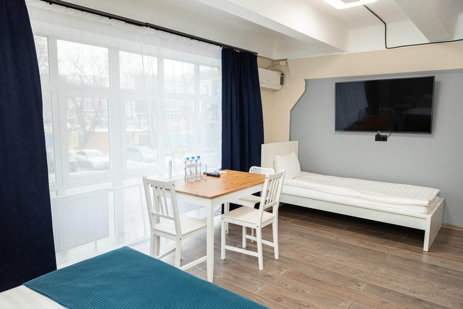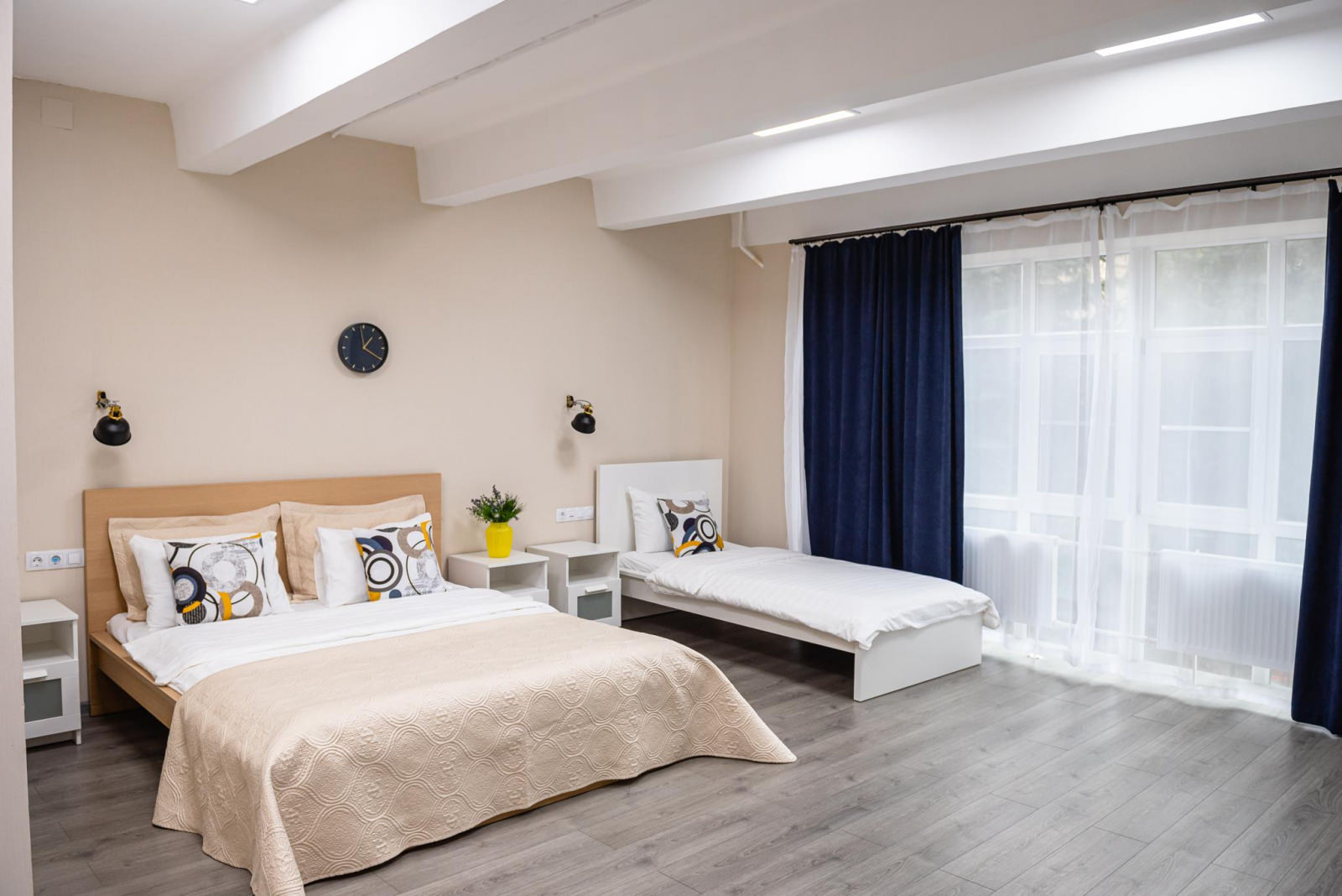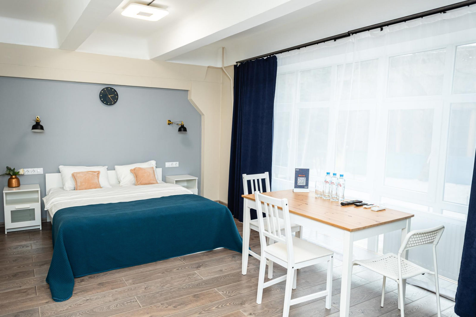 Большой комфортный и светлый номер с панорамными окнами 1 двуспальной кроватью (160*200) и раскладным диваном для двоих (140*200). Возможно разместить дополнительную или детскую кровать. Номер оснащен всем необходимым для комфортного проживания: рабочая зона, wi-fi, плазменный ТВ, место для хранения вещей. В ванной комнате: душ, тапочки, фен, полотенца, средства личной гигиены.