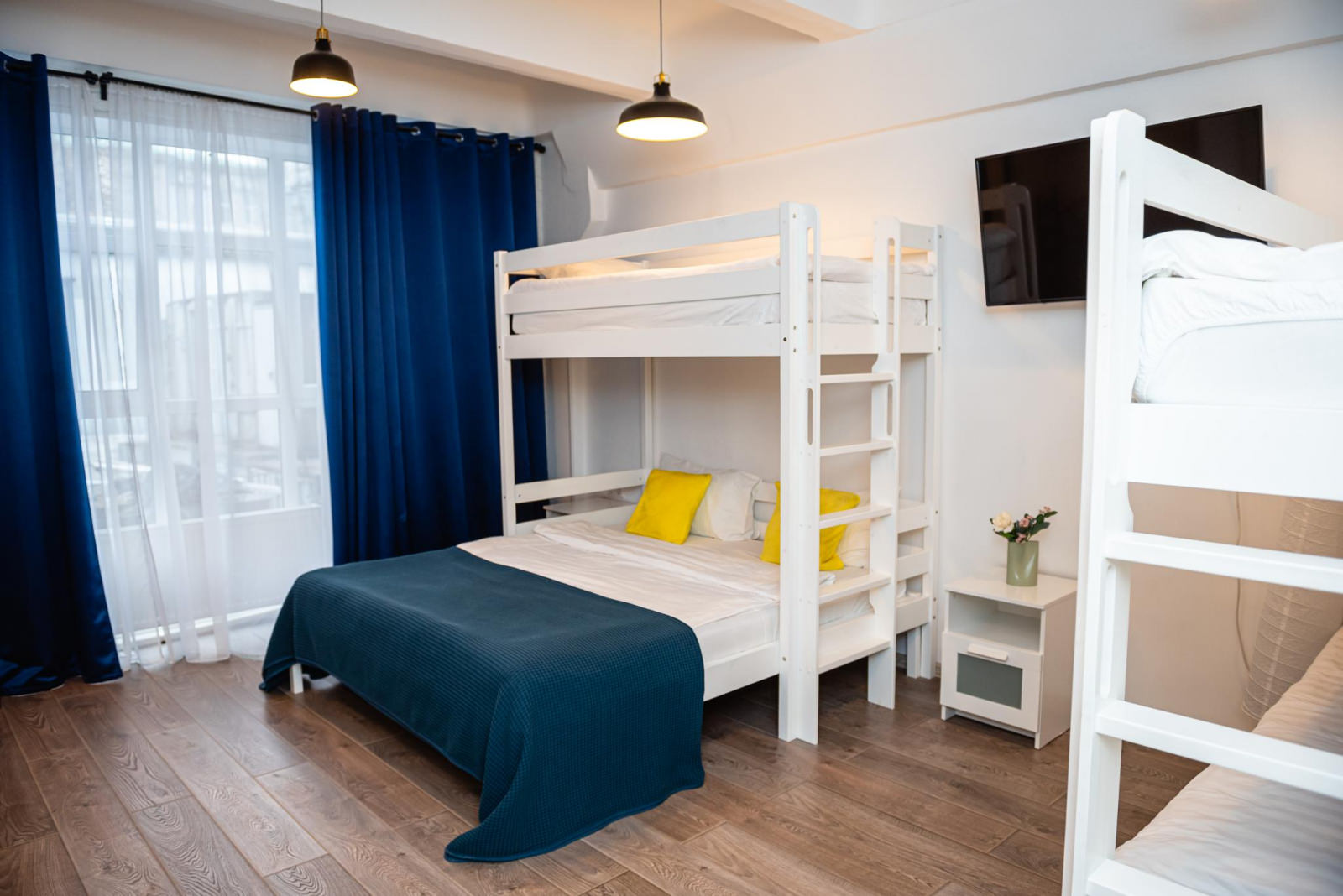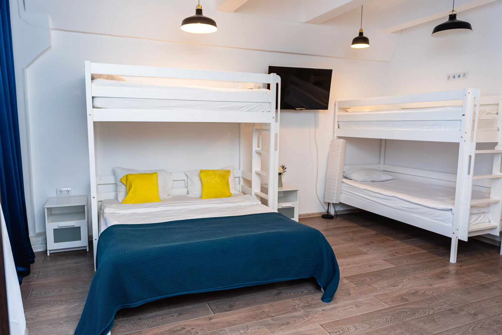 Идеальный вариант, если Вы путешествуете семьей или большой компанией до 5 человек. Для маленьких гостей мы приготовили ступеньку для раковины и детский горшок. Есть возможность установить дополнительно детскую кровать еще для одного малыша. Номер оснащен всем необходимым для комфортного проживания: одна двуспальная кровать (160*200) и три односпальные двухъярусные кровати (90*200), рабочая зона, wi-fi, плазменный ТВ, место для хранения вещей, игрушки и книжки для детей. В ванной комнате: душ, тапочки, фен, полотенца, средства личной гигиены.