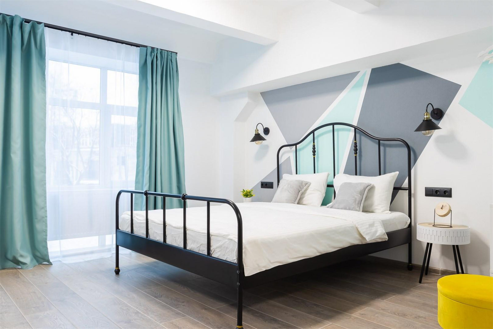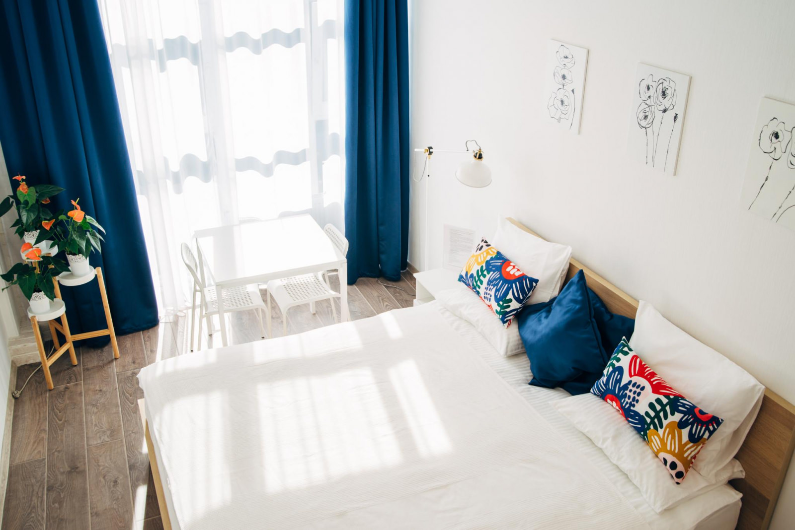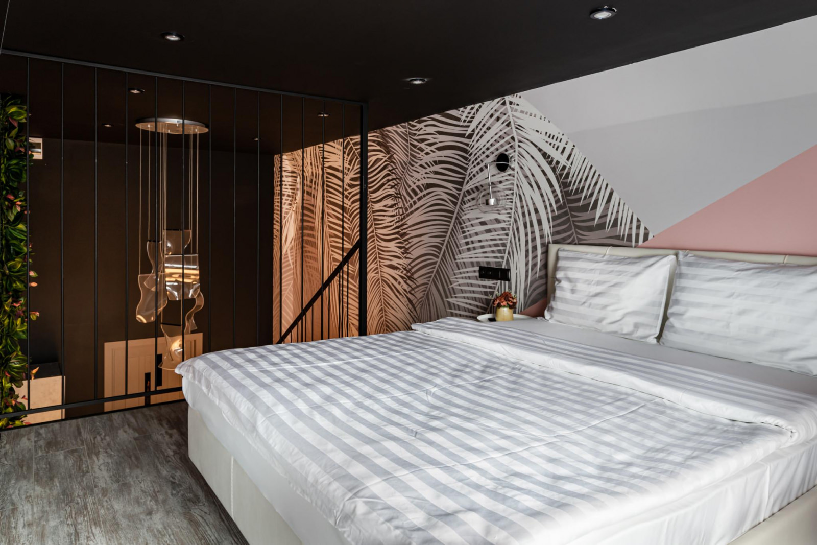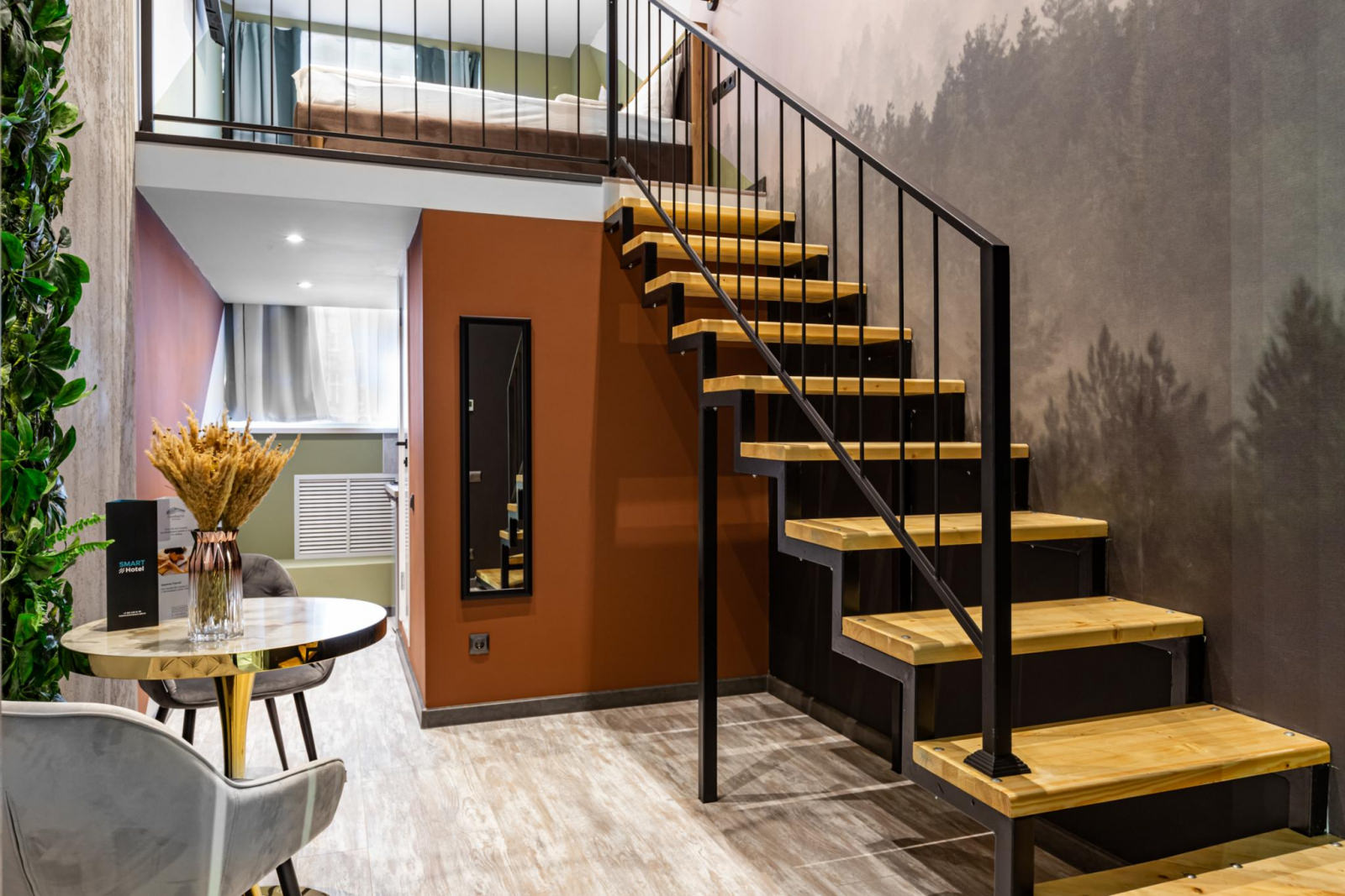 Эксклюзивный авторский дизайн и насыщенные яркие тона создадут неповторимую атмосферу сочетания стиля и комфорта. Апартаменты отвечают всем высоким требованиям размещения. Двухуровневые апартаменты оснащены одной двуспальной кроватью (160*200) на втором этаже, внизу расположена кухонная зона со всем необходимым и зона отдыха. Кухня оснащена посудой, столовыми приборами, чайником, индукционной плитой, холодильником, микроволновой печью. В ванной комнате: душ, тапочки, фен, полотенца, средства личной гигиены.
