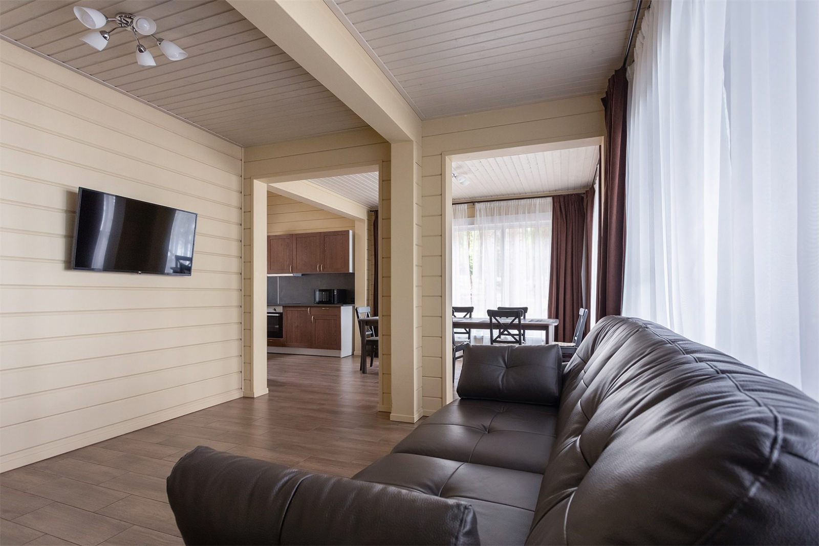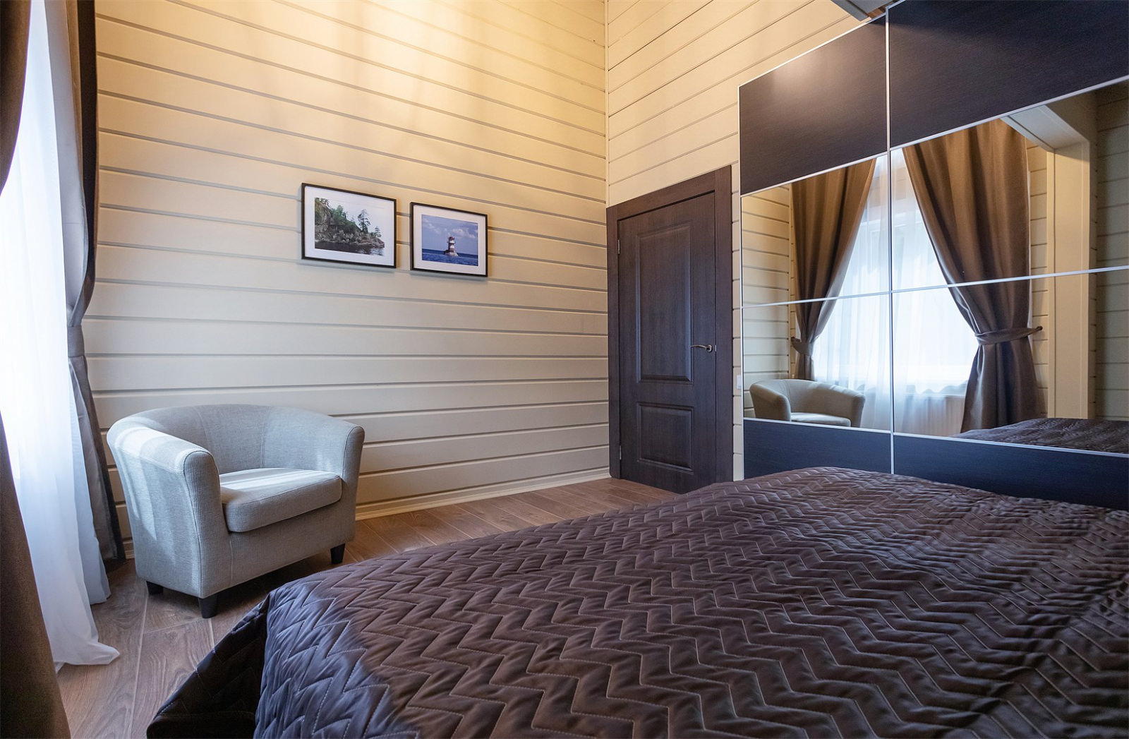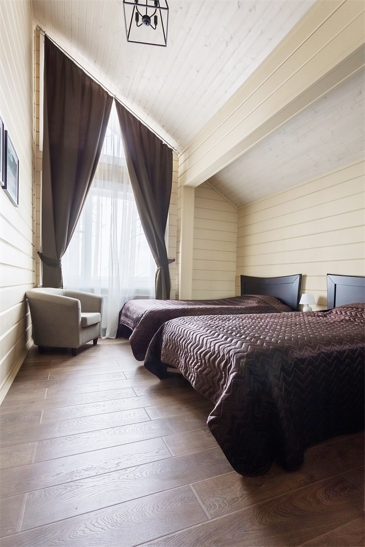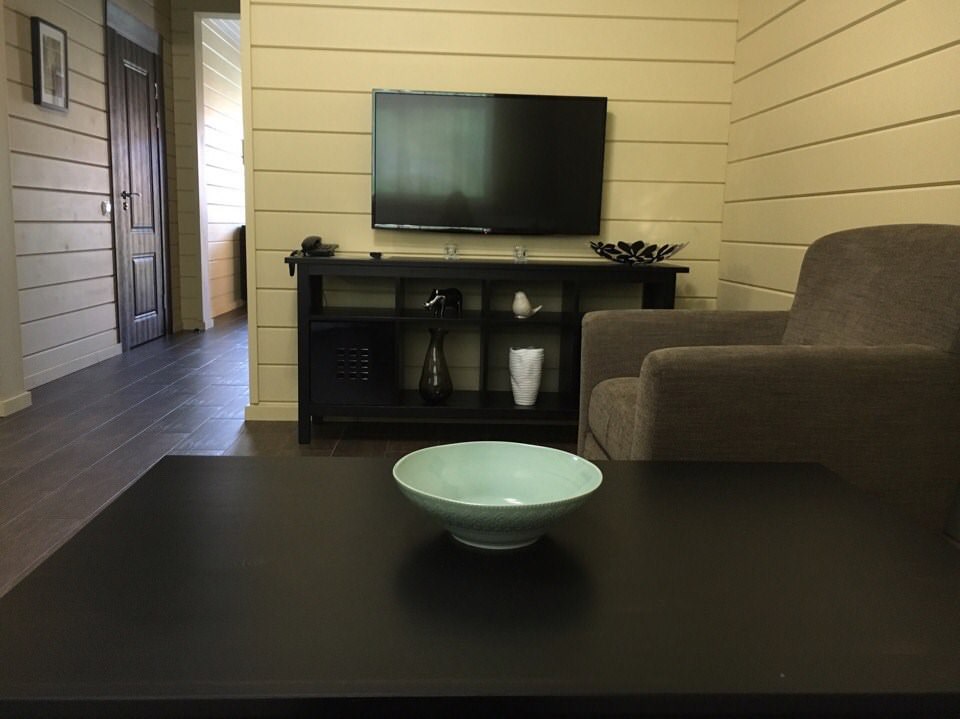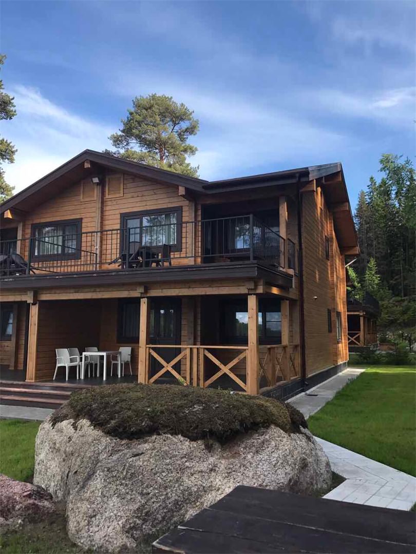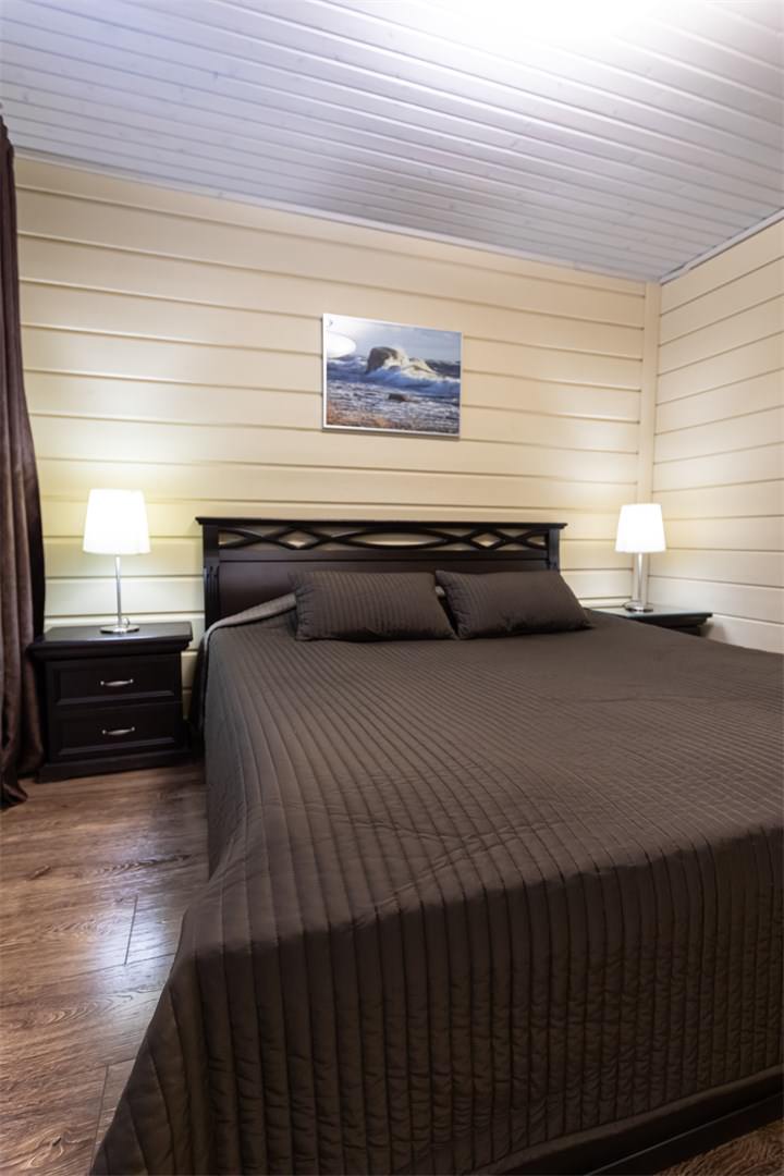 Каждый коттедж-дуплекс (116 м2) выполнен в скандинавском стиле, сочетающем элегантную классику с современными элементами декора и высоким уровнем комфорта. Все номера оборудованы на первом этаже теплыми полами. В каждом из номеров к услугам гостей: - Высокоскоростной WiFi интернет, LCD телевизор с большим выбором кабельных каналов и возможностью просмотра кинофильмов через интернет - На каждом этаже просторная ванная комната, оборудованная душевой кабиной с гидромассажным и тропическим душем; - Стиральная машина - Косметика и туалетные принадлежности, халаты и тапочки - Высококачественное постельное белье - Террасса, оснащенная удобной мебелью - Балкон в каждой спальне - Кухня оснащена холодильником, посудомоечной машиной, индукционной плитой с духовым шкафом, электрическим чайником, микроволновой печью,посудой - Сауна для одновременнного посещения 2-их человек