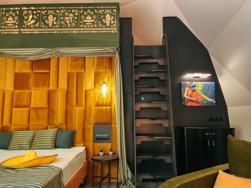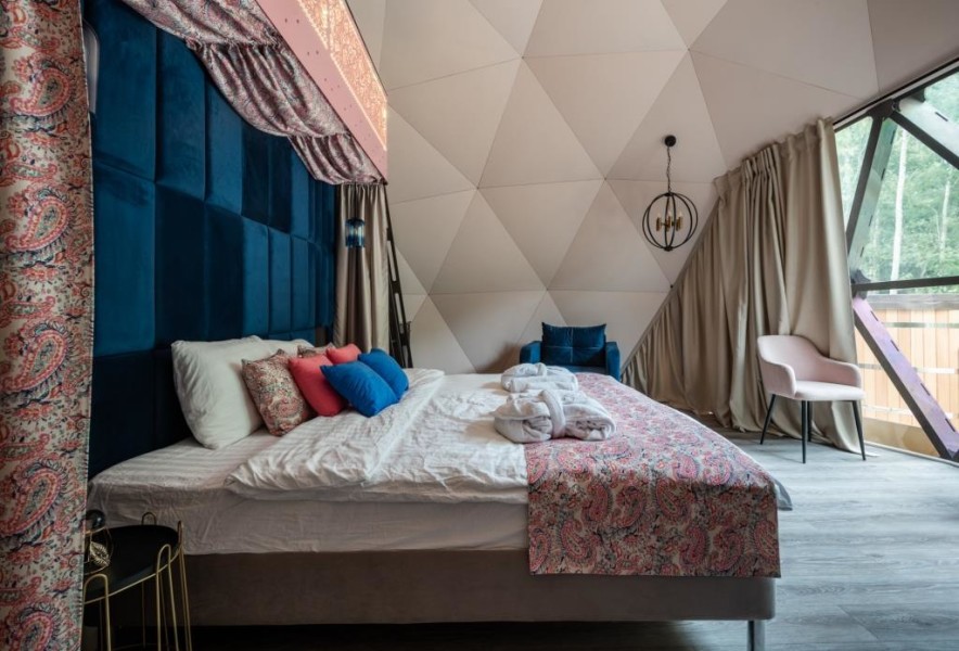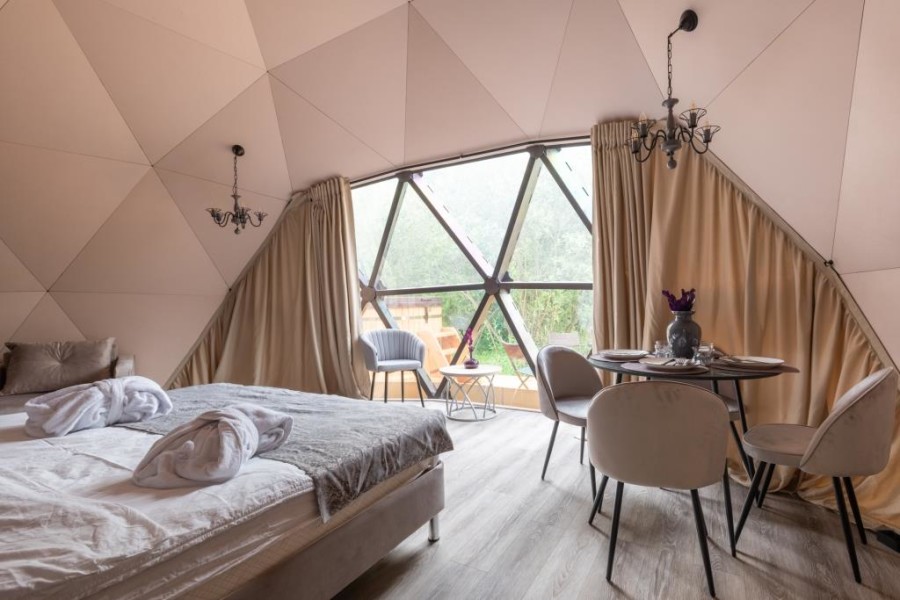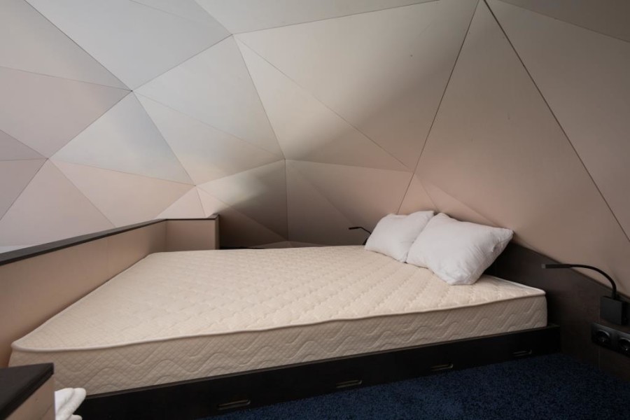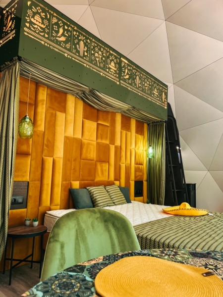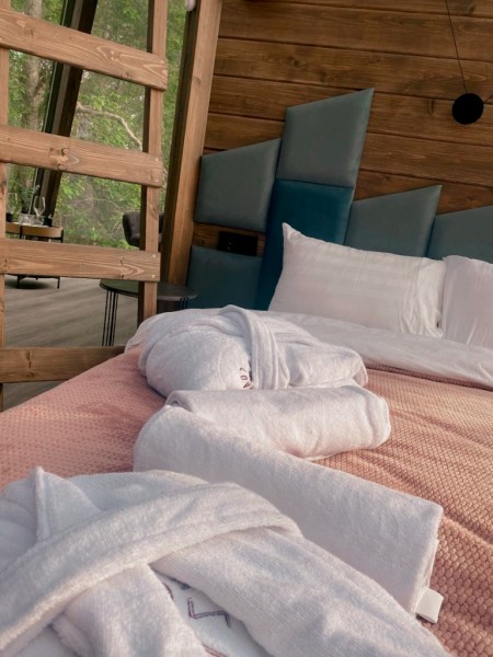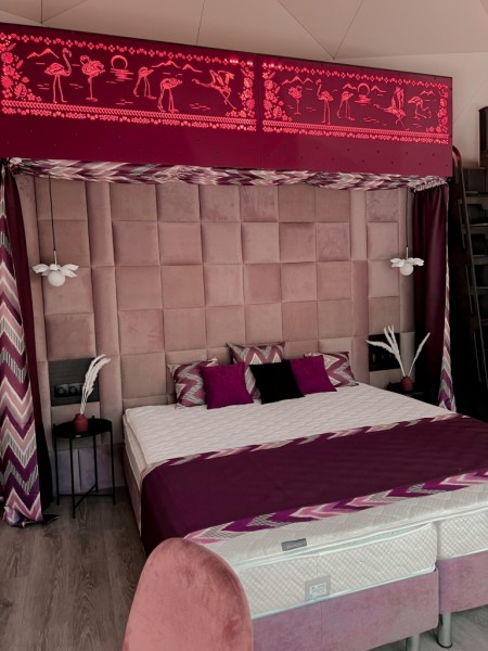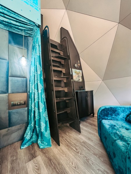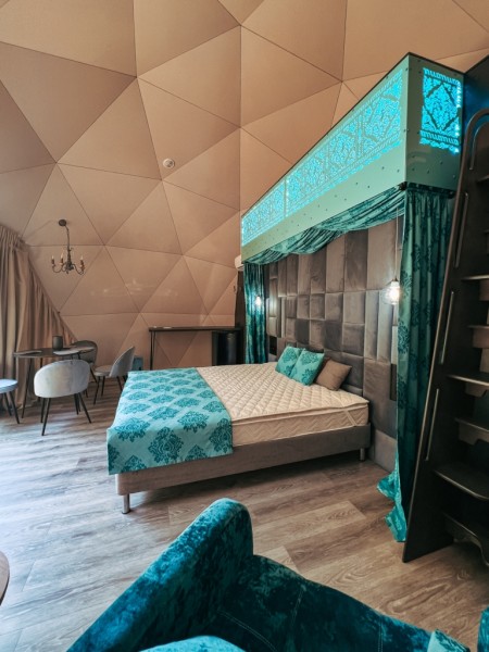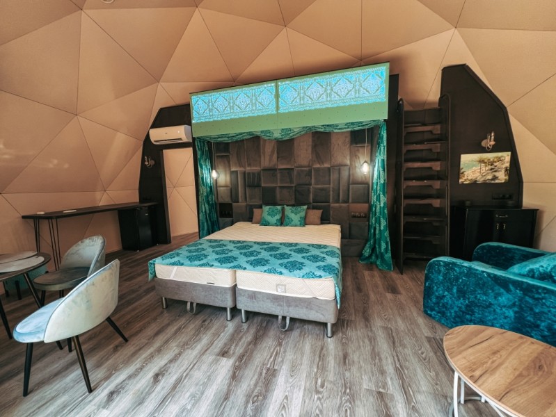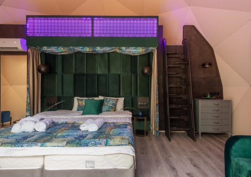 Площадь номера - 60 кв.м. 4 осн. места. Мебель: вешалка, диван, зеркало, кровать двуспальная, стол, стулья, шкаф. Мини-кухня. Оборудование: микроволновая печь, мини-холодильник, набор посуды, телевизор ЖК, чайный набор посуды, электрочайник. Санузел: с душевой кабиной, тапочки, туалетные принадлежности, фен, халат. Сервис: Wi-Fi бесплатно, мини-бар, смена полотенец, смена постельного белья, уборка номера. Терраса.