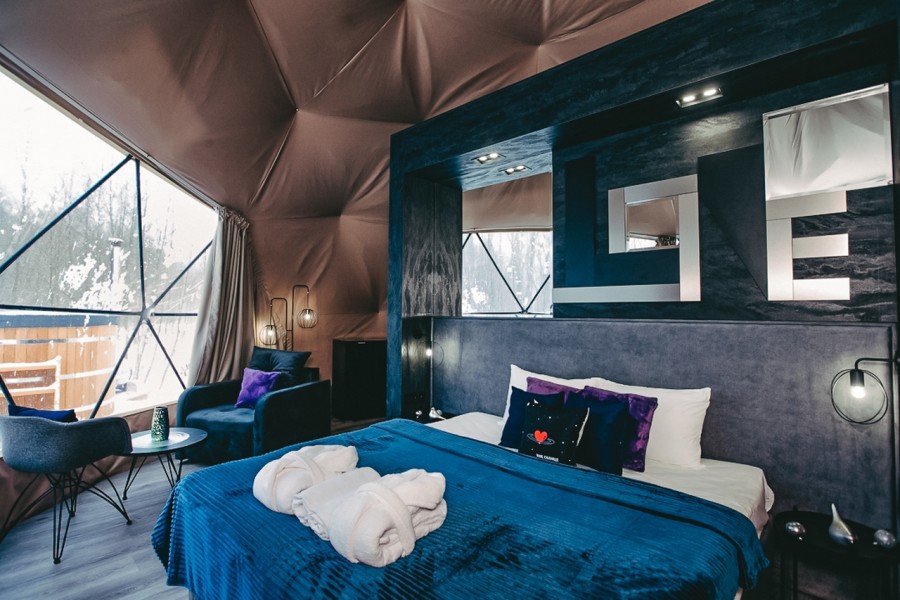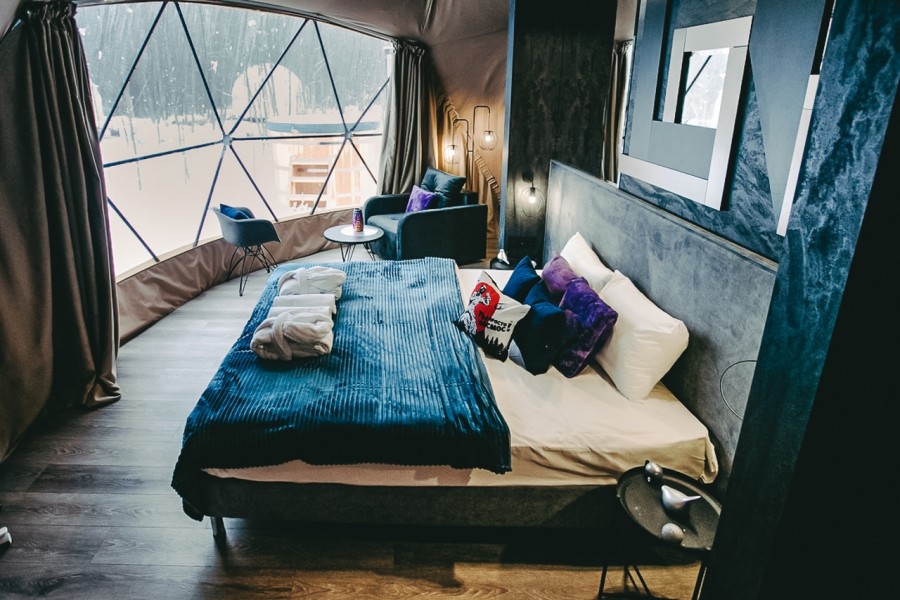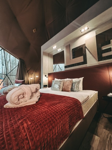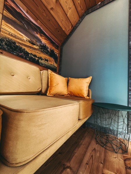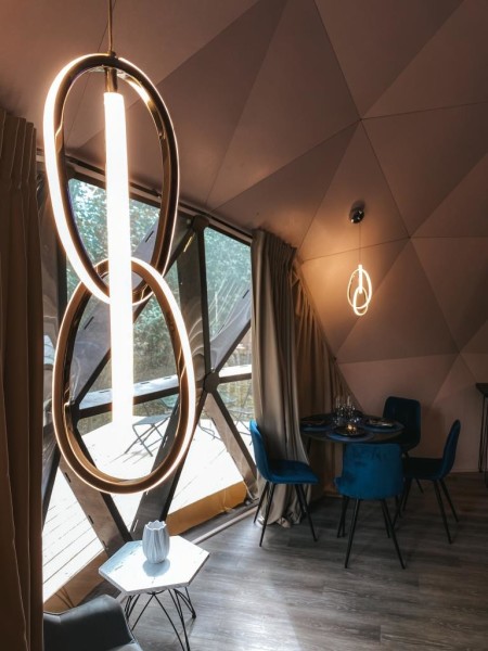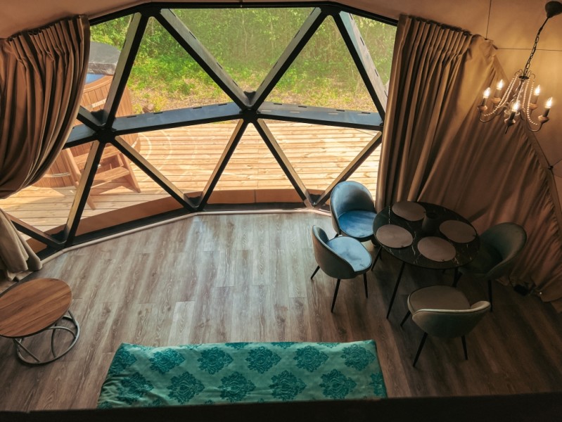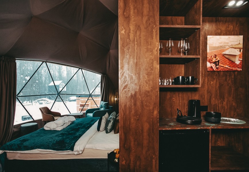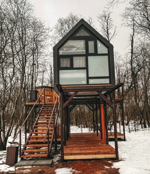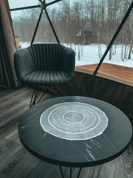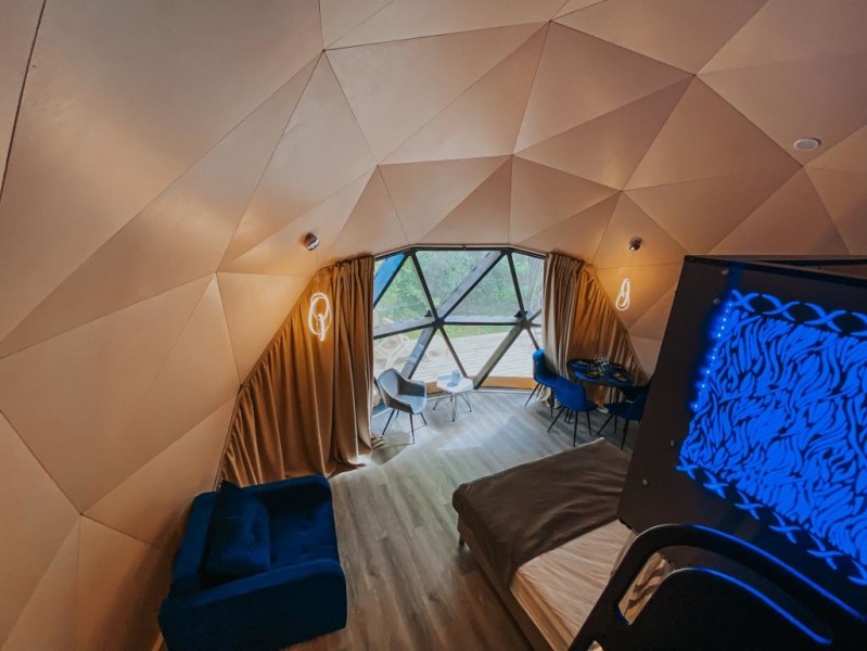 Площадь номера - 60 кв.м. 4 осн. места. Мебель: вешалка, диван, зеркало, кровать двуспальная, стол, стулья, шкаф. Мини-кухня. Оборудование: микроволновая печь, мини-холодильник, набор посуды, телевизор ЖК, чайный набор посуды, электрочайник. Санузел: с душевой кабиной, тапочки, туалетные принадлежности, фен, халат. Сервис: Wi-Fi бесплатно, мини-бар, смена полотенец, смена постельного белья, уборка номера. Терраса.