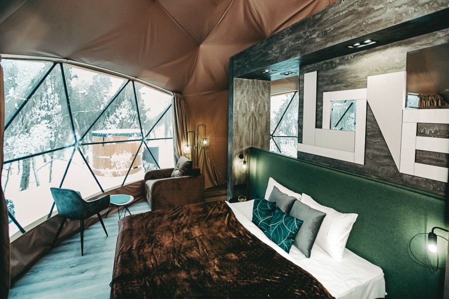 Площадь номера - 50 кв.м. 4 осн. места. Мебель: вешалка, зеркало, кресло-кровать, кровать двуспальная, кровать детская, прикроватные тумбочки, стол, стулья. Оборудование: кондиционер, мини-холодильник, обогреватель, чайный набор посуды, электрочайник. Санузел: с джакузи, с душем, тапочки, туалетные принадлежности, фен, халат. Сервис: Wi-Fi бесплатно, мини-бар, смена полотенец, смена постельного белья, уборка номера. Терраса.