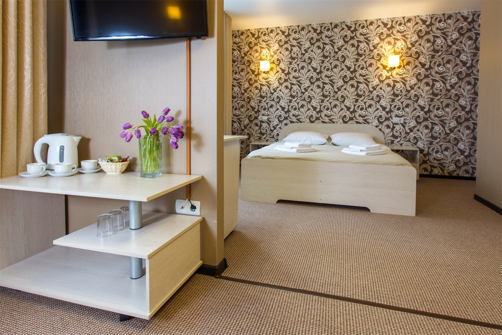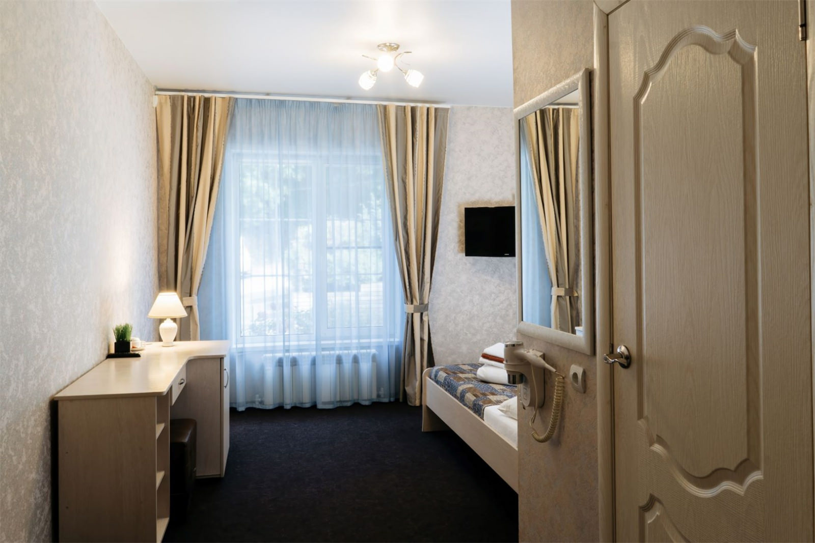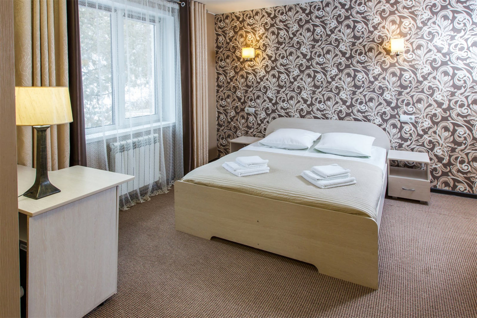 Стандартный двухместный номер с двумя раздельностоящими кроватями, плазменным телевизором, кабельным телевидением, холодильником, интернетом Wi-Fi, набором уютной мебели, комфортными санузлами с душевой кабиной и индивидуальными принадлежностями.