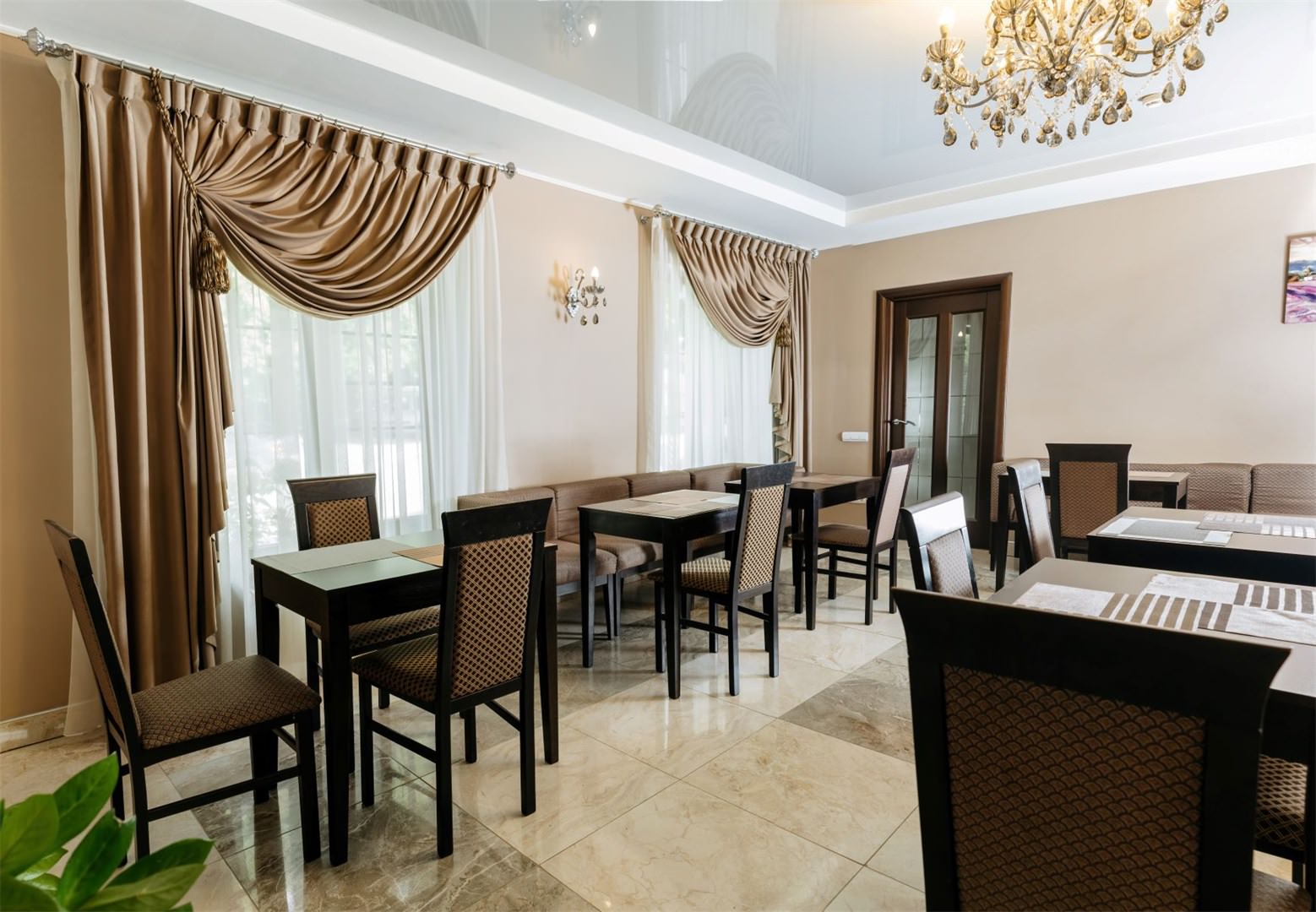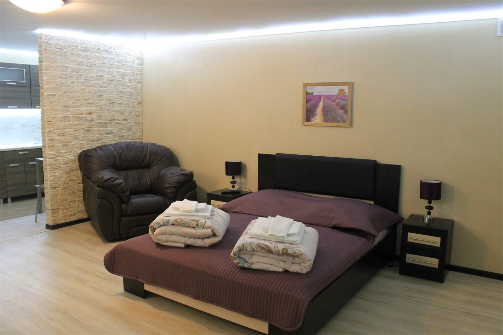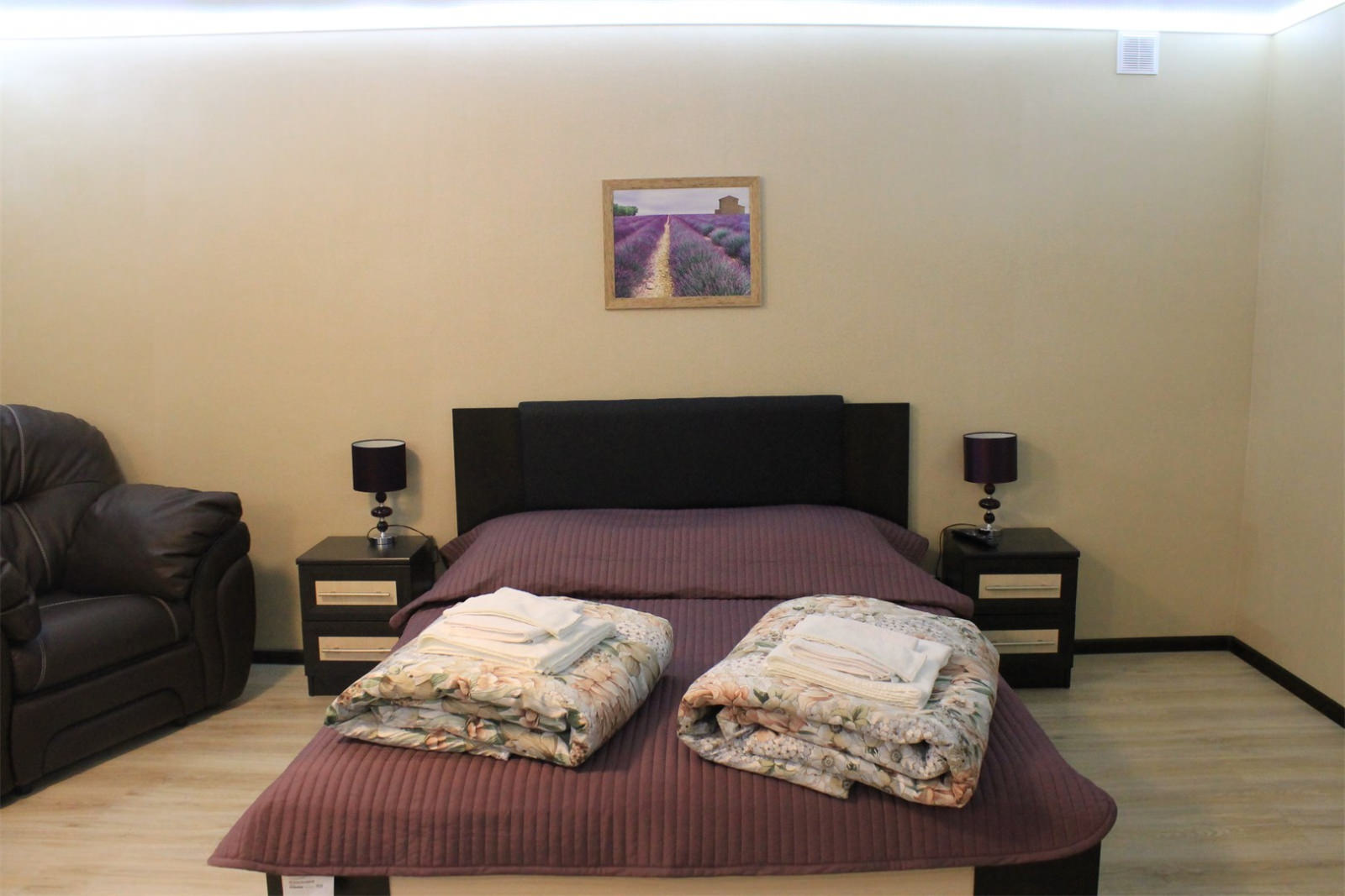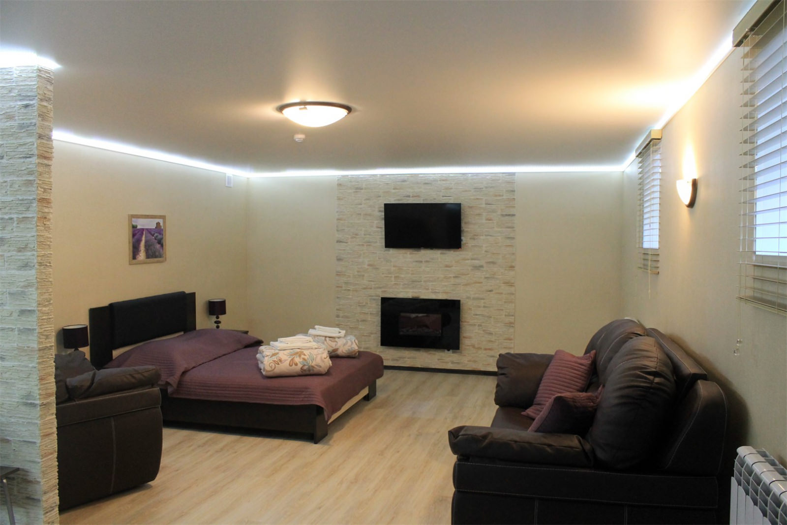Номер класса ЛЮКС с двуспальной кроватью, раскладывающимся диваном, плазменным телевизором, кабельным телевидением, холодильником, интернетом wi-fi, набором уютной мебели, комфортным санузлом с душевой кабиной и индивидуальными принадлежностями. Допускается размещение трёх человек.