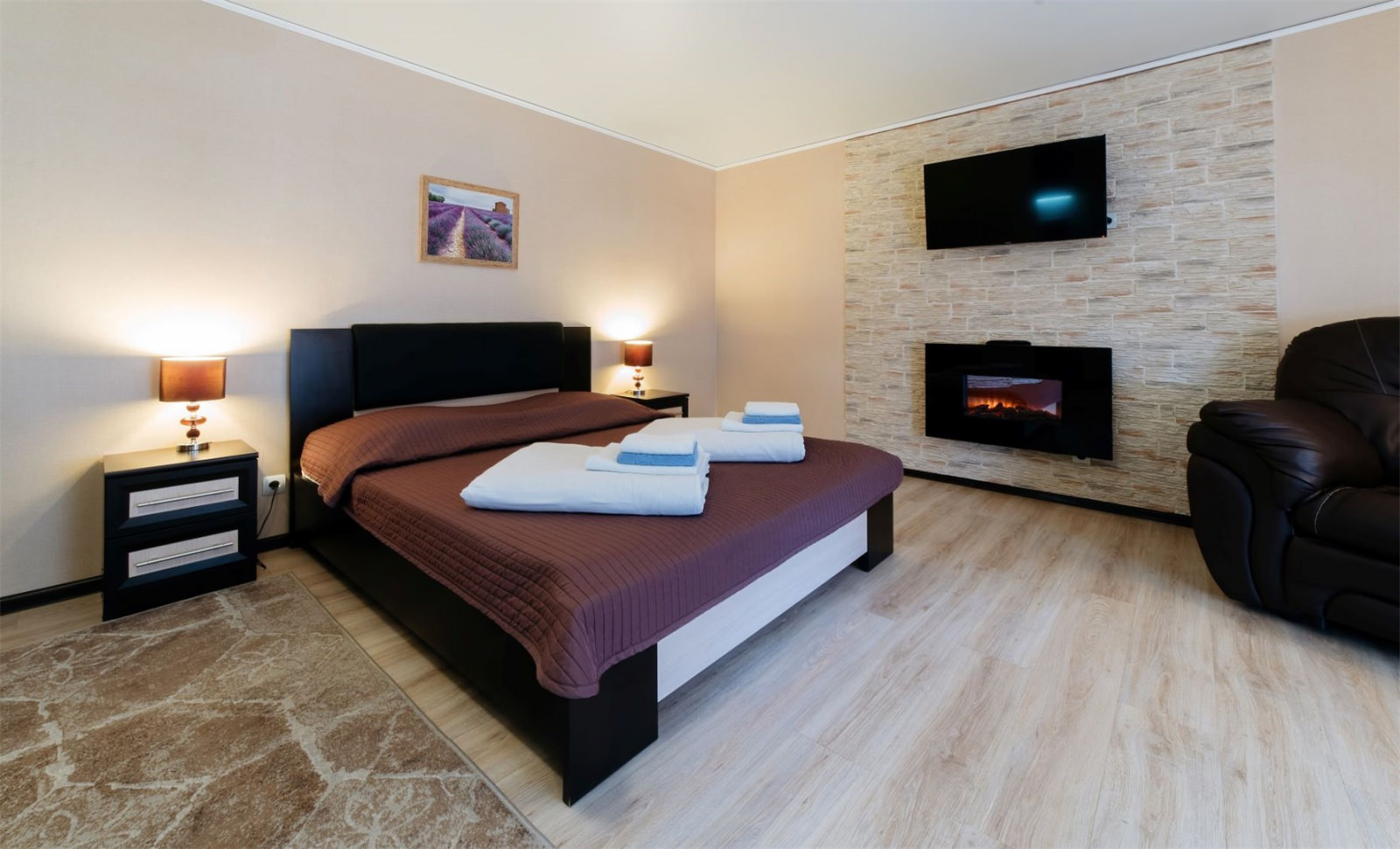 Двухкомнатный номер класса ЛЮКС с двуспальной кроватью, раскладывающимся диваном,камином, плазменным телевизором, кабельным телевидением, холодильником, интернетом wi-fi, набором уютной мебели, комфортным санузлом с душевой кабиной и индивидуальными принадлежностями. Допускается размещение трёх человек.