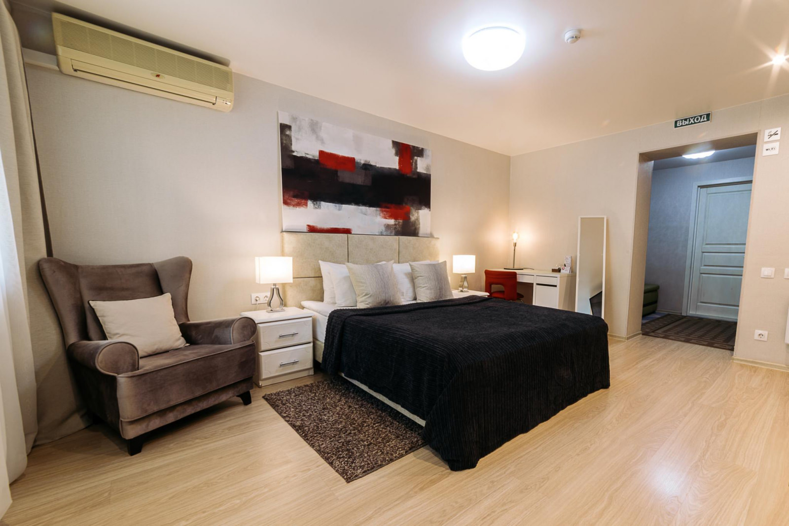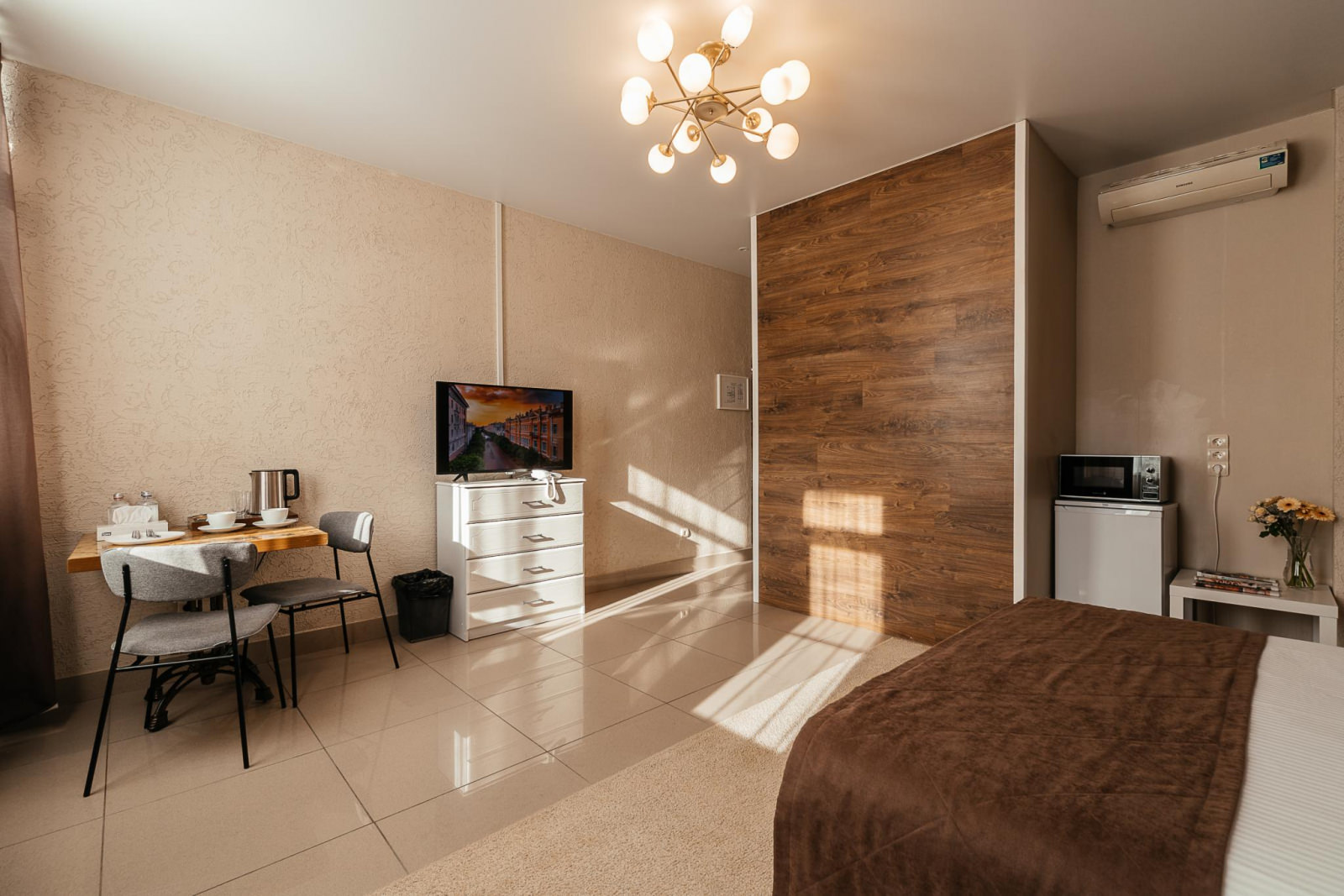 Светлый эргономичный апарт-номер являются отличным вариантом для одноместного или двухместного размещения гостей города. Площадь номера составляет 20 м². Номер оборудован двуспальной кроватью, зоной для работы и отдыха в виде стола и дизайнерского кресла, кухонного уголка с необходимой бытовой техникой: микроволновая печь, холодильник, варочная панель. Номера имеют повышенную шумоизоляцию и плотные шторы блэк-аут, что способствует комфортному пребыванию и спокойному отдыху. Ванная комната оборудована душевой кабиной, туалетом, феном и косметическими принадлежностями: зубным набором, гелем, шампунем. Уборка номеров и смена полотенец проводится ежедневно. Номер для некурящих.