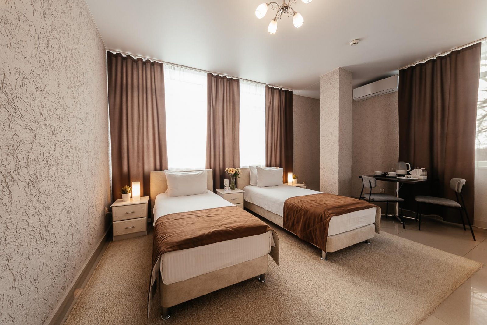 Улучшенные номер с видом на город площадью 24-26 м² с двумя односпальными кроватями (90x200) подходит для размещения двоих гостей. Для удобства номер оснащён кондиционером, электрическим чайником, жидкокристаллическим телевизором с цифровым телевидением, холодильником и микроволновой печью. Ванная комната оборудована душем, туалетом, феном, набором полотенец, косметическими принадлежностями: зубным набором, гелем, шампунем. Бесплатный Wi-Fi в номере и на территории гостиницы. Уборка номеров и смена полотенец проводится ежедневно. Номер для некурящих. Если Вы забыли дома какие-либо предметы личной гигиены, то позвоните в службу приёма и размещения, и мы будем рады бесплатно предложить Вам набор для бритья, расчёску, косметический набор, шапочку для душа, швейный набор, беруши, одноразовые защитные маски.