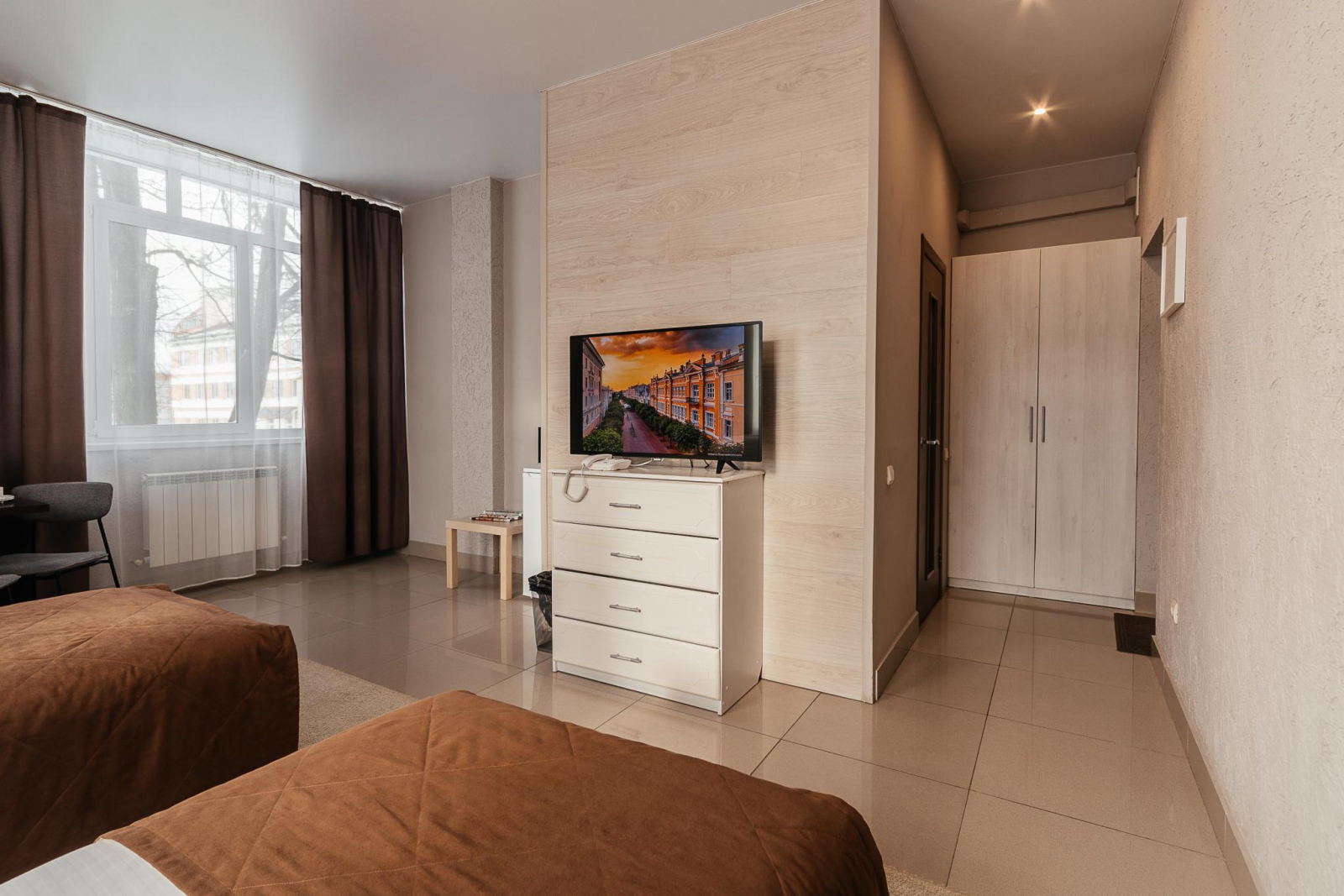 «Апартаменты–студио» - номер площадью 24-26 м² с уникальным дизайном и видом на город. В номере присутствует кухонная зона с варочной панелью, микроволновой печью, электрическим чайником и холодильником, а также обеденная зона в виде стола и стульев. Просторная ванная комната оборудована вместительной душевой кабиной, раковиной для умывания, туалетом, феном, набором полотенец, косметическими принадлежностями: зубным набором, гелем, шампунем. Спальное место оборудовано ортопедическим матрасом (160x200) и постельным бельем премиум-класса. Для удобства номер оснащён будильником, кондиционером и жидкокристаллическим телевизором с цифровым телевидением. Бесплатный Wi-Fi в номере и на территории гостиницы. Уборка номеров и смена полотенец проводится ежедневно. Номер для некурящих. Если Вы забыли дома какие-либо предметы личной гигиены, то позвоните в службу приёма и размещения, и мы будем рады бесплатно предложить Вам набор для бритья, расчёску, косметический набор, шапочку для душа, швейный набор, беруши, одноразовые защитные маски.
