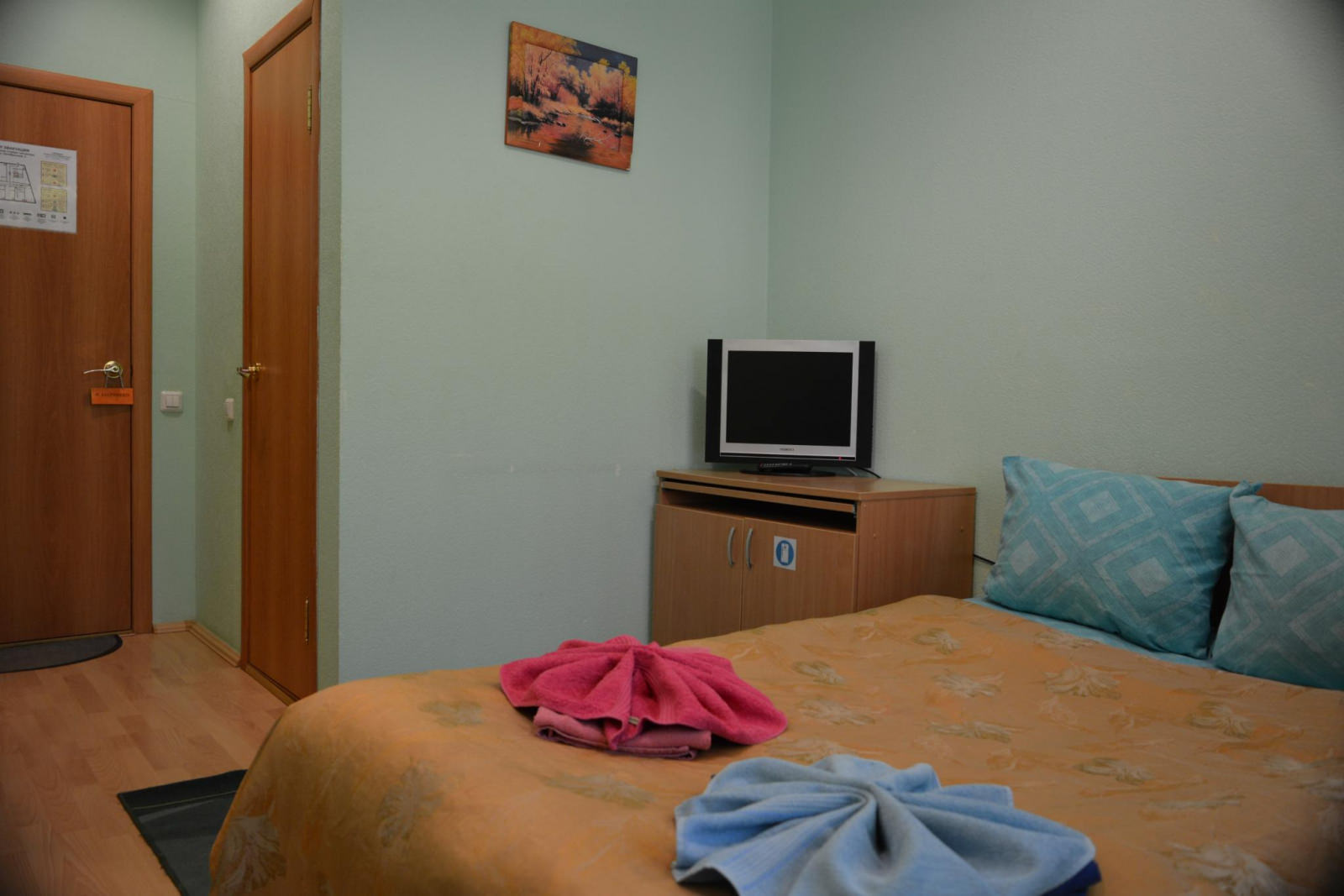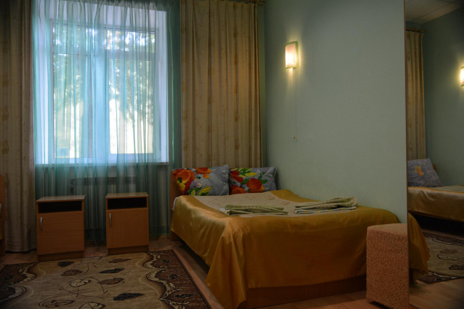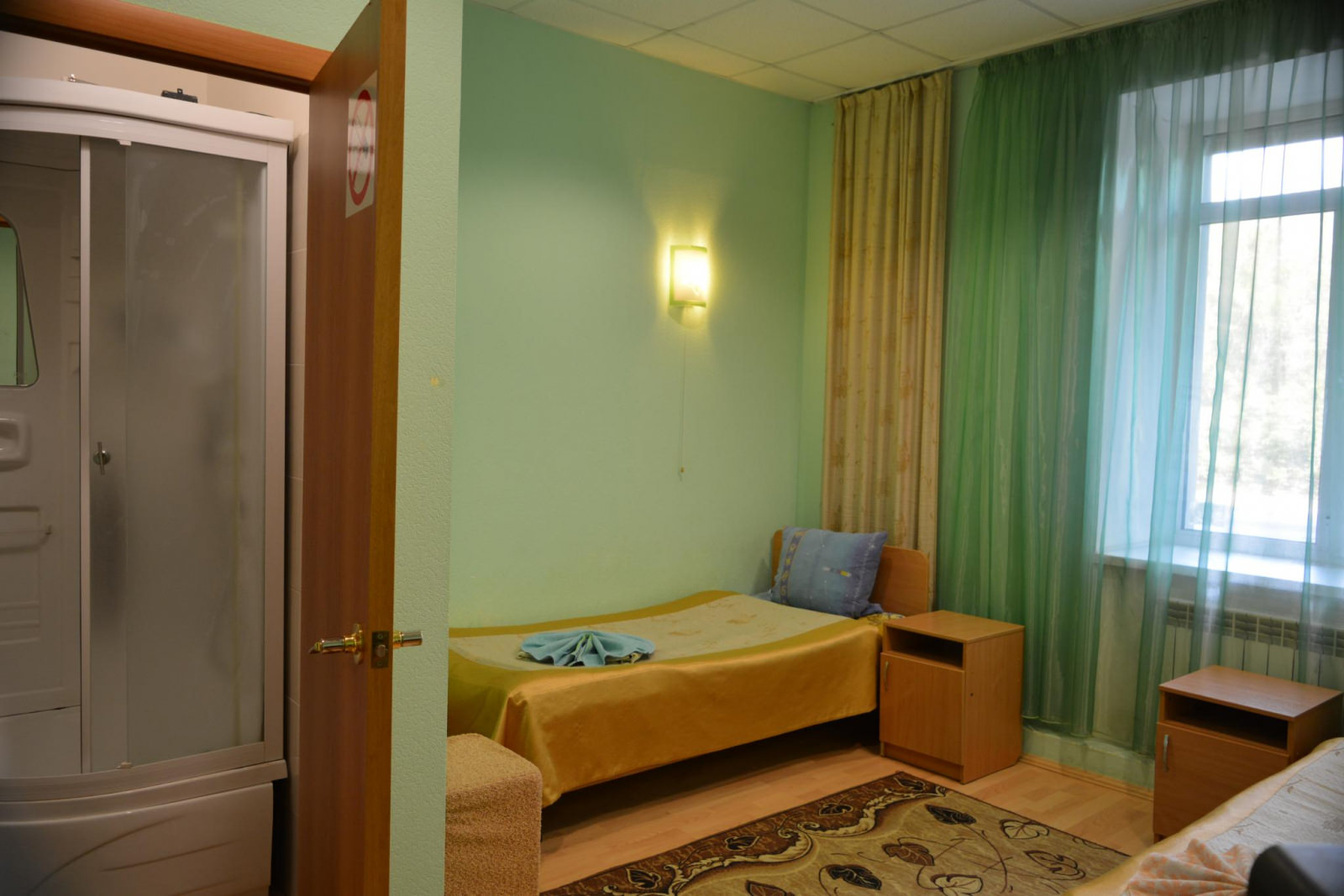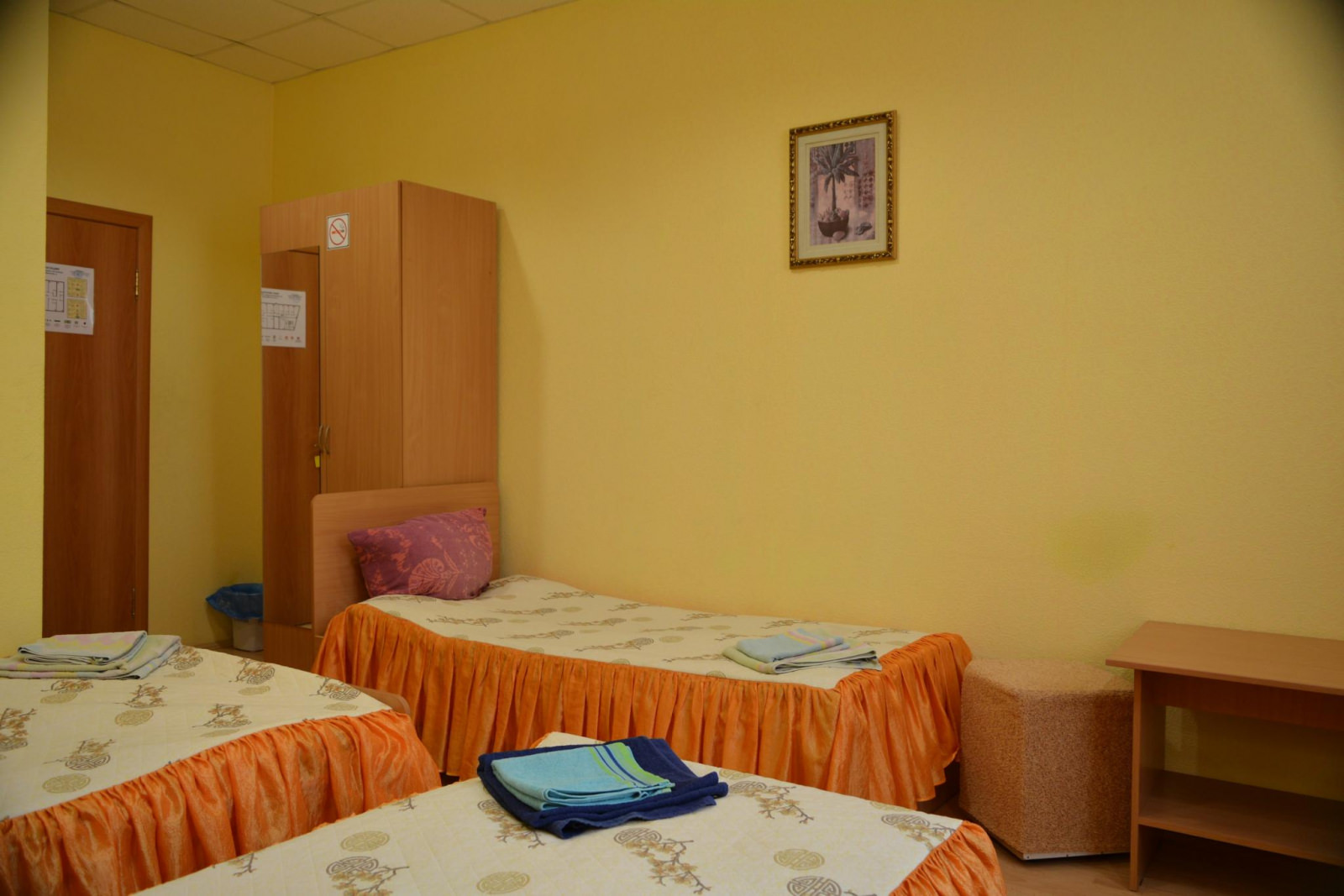 Большой номер с 2-мя односпальными кроватями. В номере телевизор, стол, прикроватная тумбочка, шкаф с зеркалом. Душевая и санузел не в самом номере, а рядом через дверь. Общая большая кухня со всеми приборами и посудой, питьевая вода, чай, Wi-Fi.