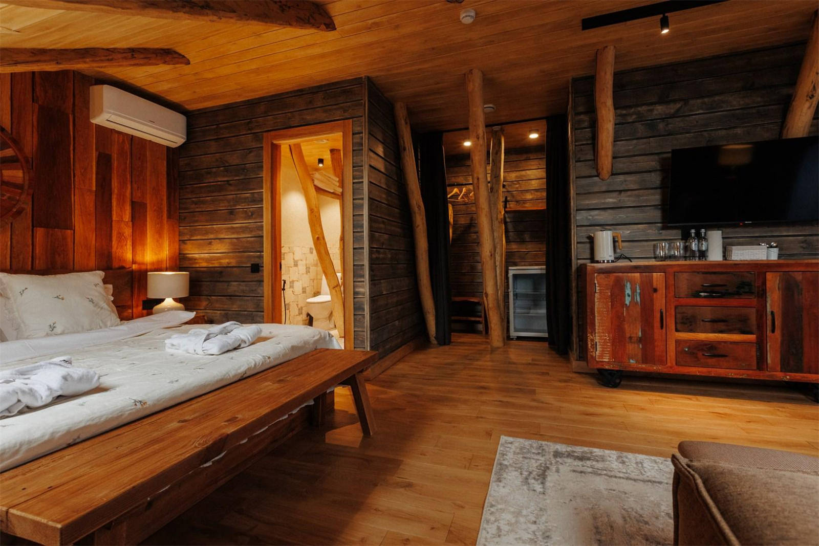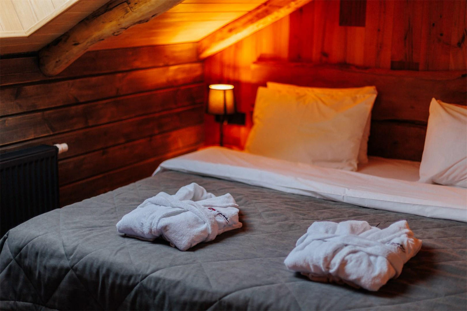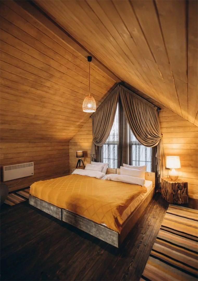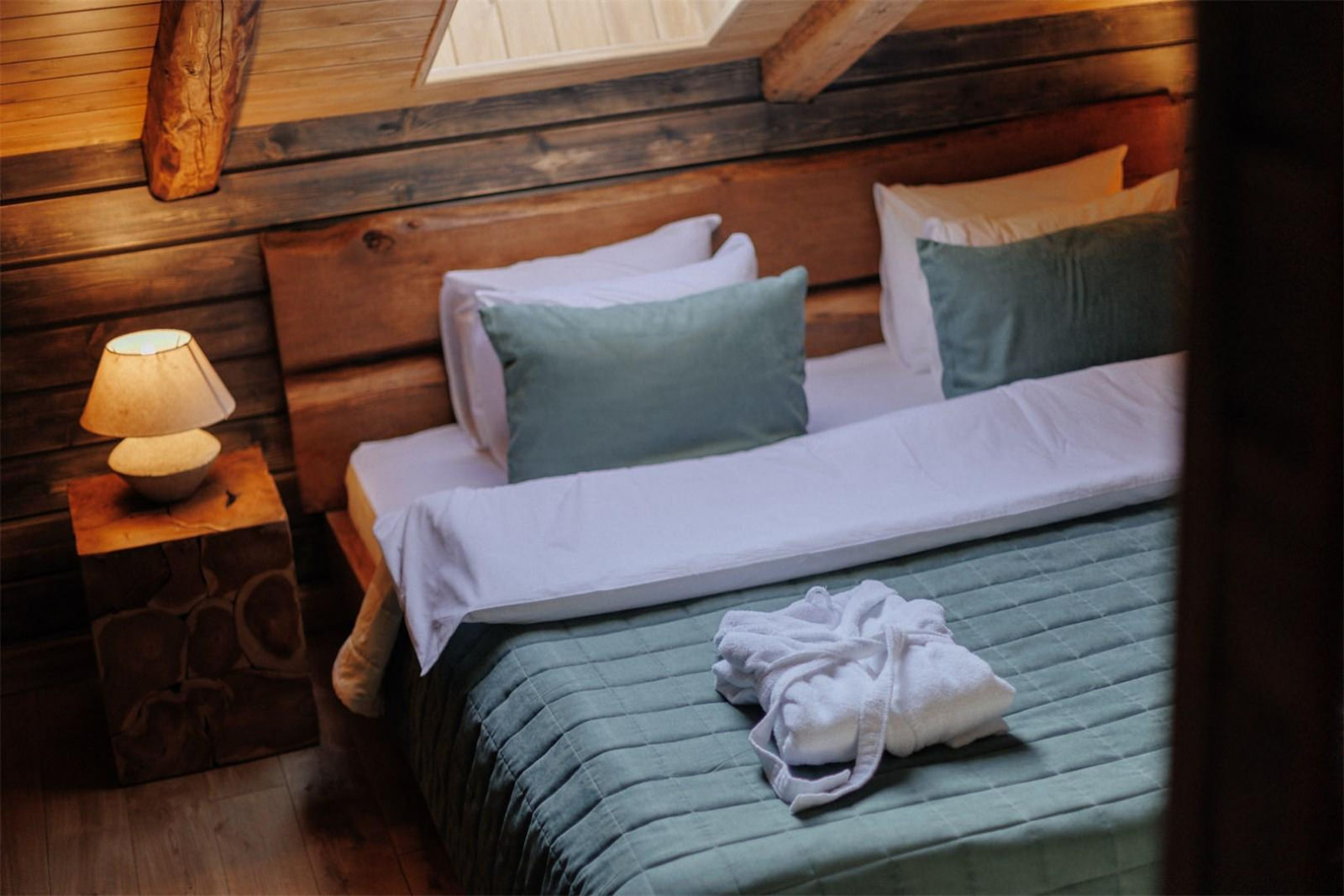 Компактный двухместный одноэтажный домик для двоих. В спальне располагается кровать king size шириной 180 см и две прикроватные тумбы. Доступ в интернет, фен и утюг по запросу, халаты, тапочки.