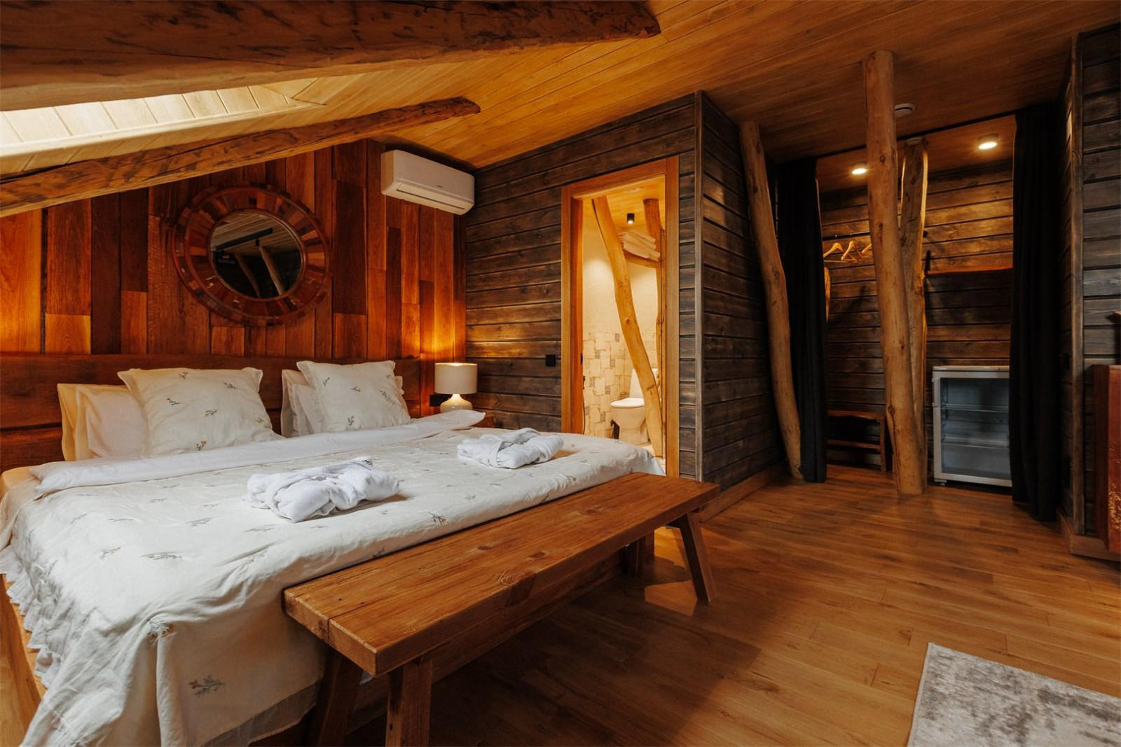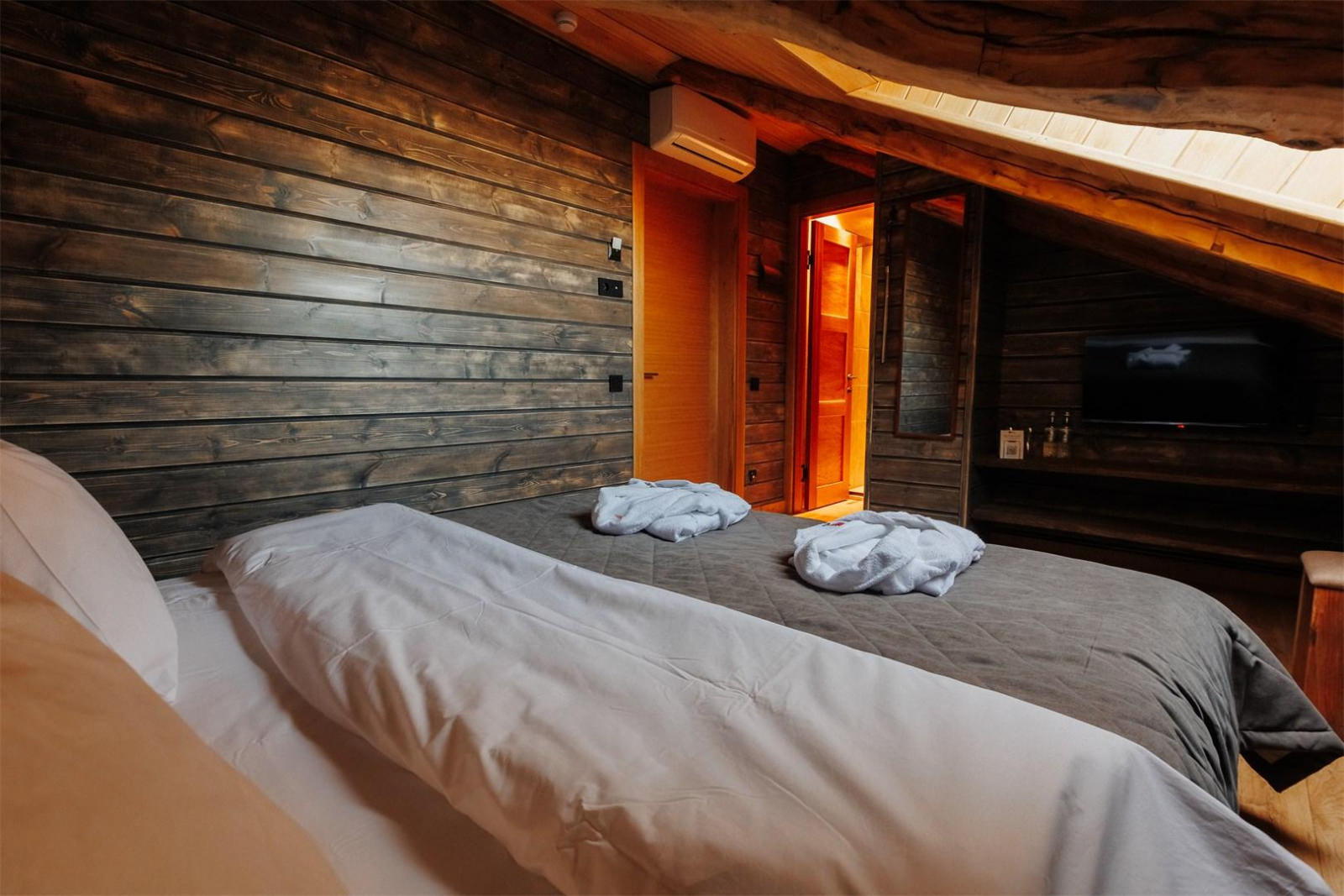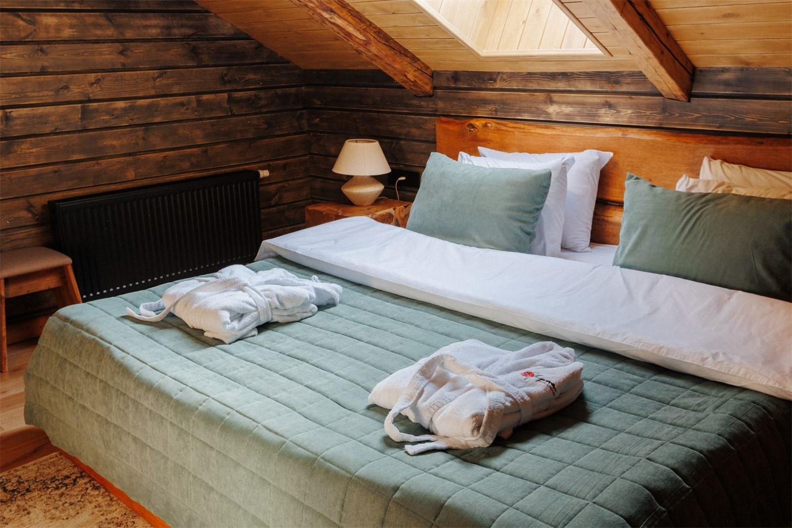 Компактный двухместный одноэтажный домик для двоих. В спальне располагается кровать king size шириной 180 см и две прикроватные тумбы. Доступ в интернет, фен и утюг по запросу, халаты, тапочки.