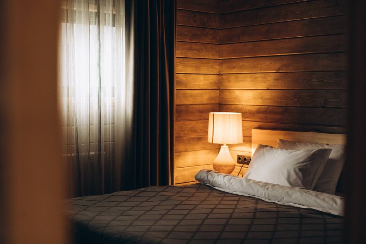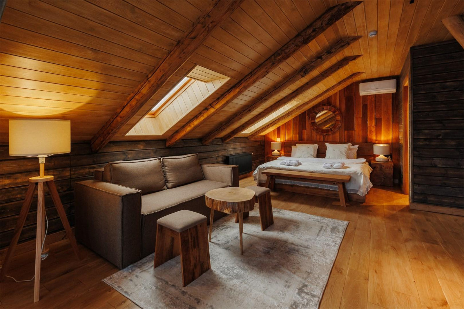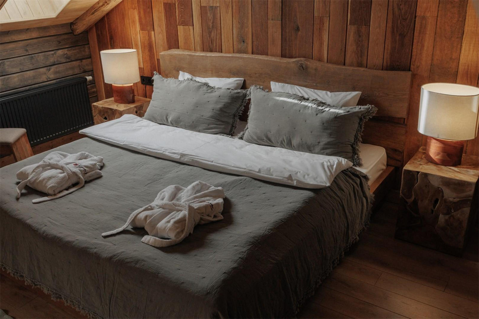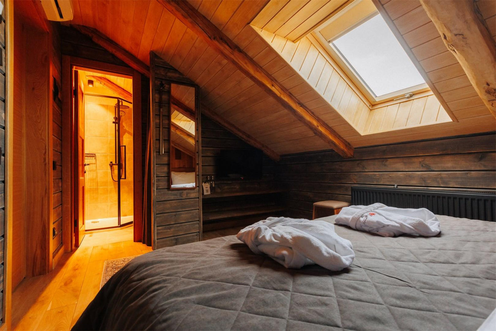 Компактный двухместный одноэтажный домик для двоих. В спальне располагается кровать king size шириной 180 см и две прикроватные тумбы. Доступ в интернет, фен и утюг по запросу, халаты, тапочки.