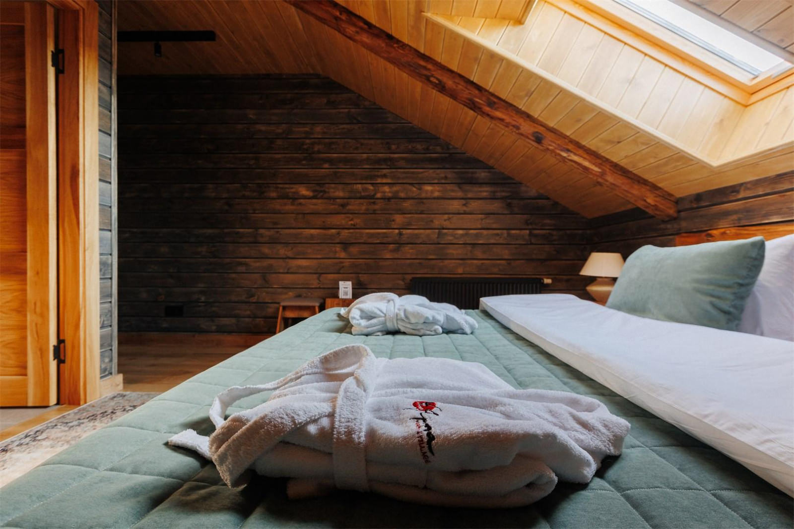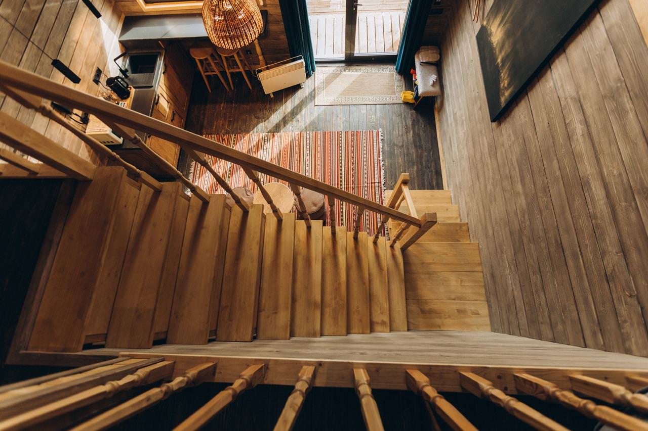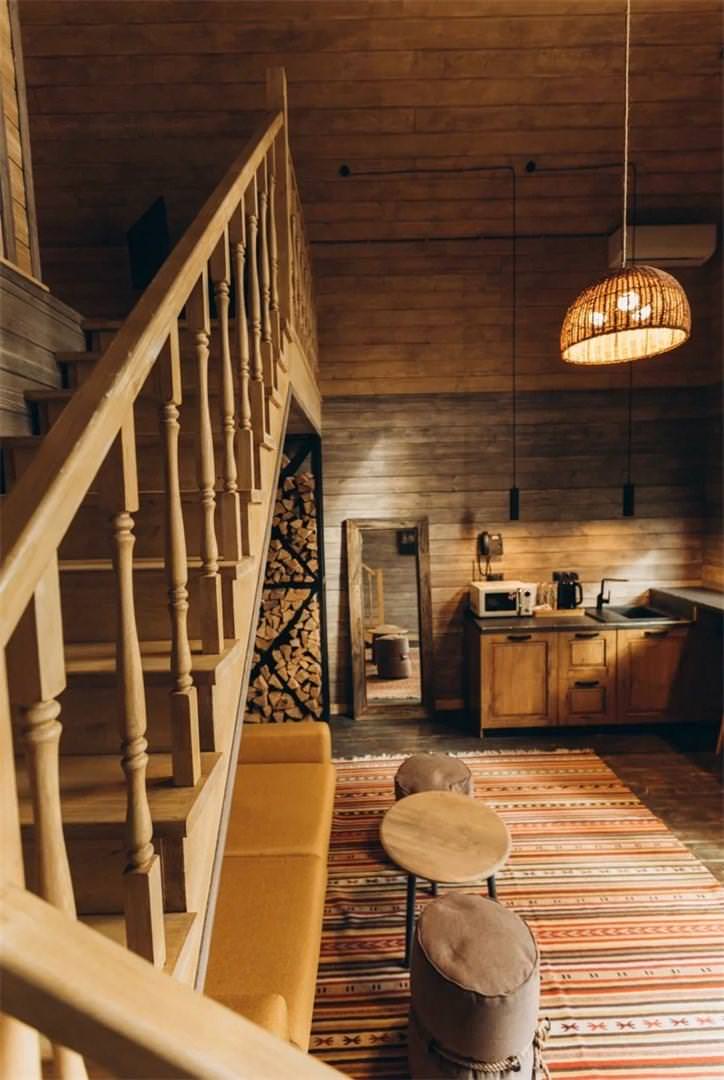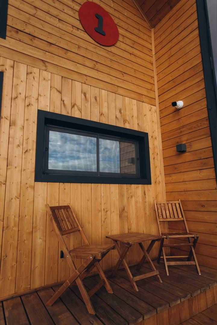 Двухэтажные домики состоят из трех комнат: гостиная и две спальни. Вместительность двухэтажных домиков от 4 до 6 человек (2 человека в одной спальне, 2 человека во второй спальне, 2 человека на диване в гостиной зоне). В спальнях располагается кровать king size шириной 180 см. В гостиной зоне располагается диван шириной 140 см., где комфортно смогут разместиться два гостя, а так же кухонная зона с микроволновой печью, холодильником и чайником. Каждый домик оборудован ванной комнатой со всеми необходимыми аксессуарами (халаты, тапочки, косметика, фен). Для маленьких гостей: детские кроватки, либо манежи.