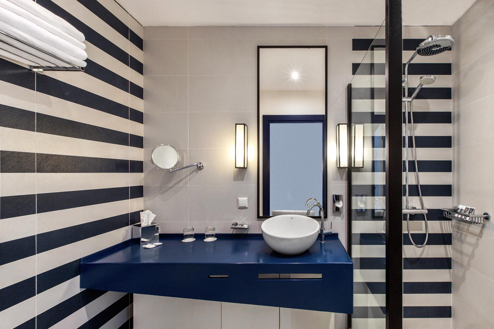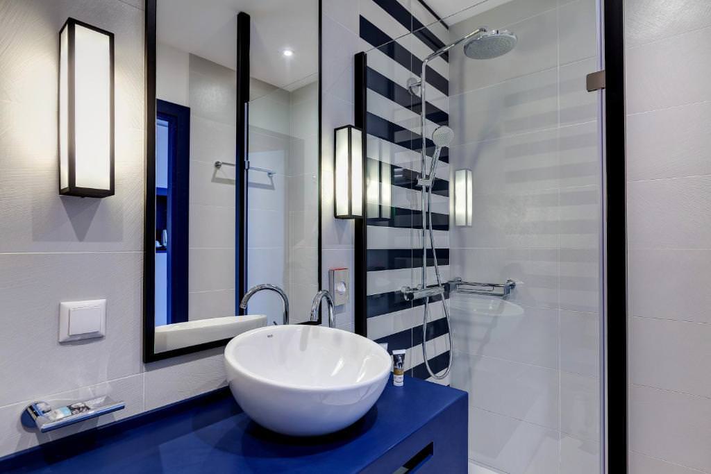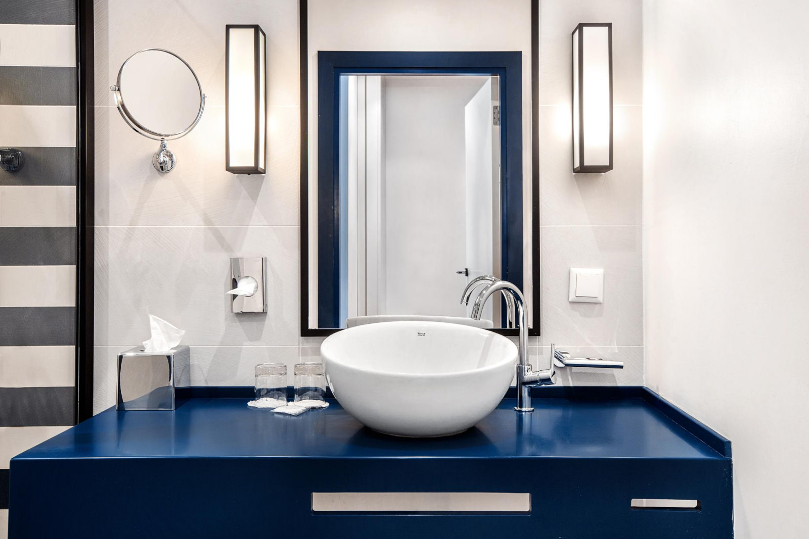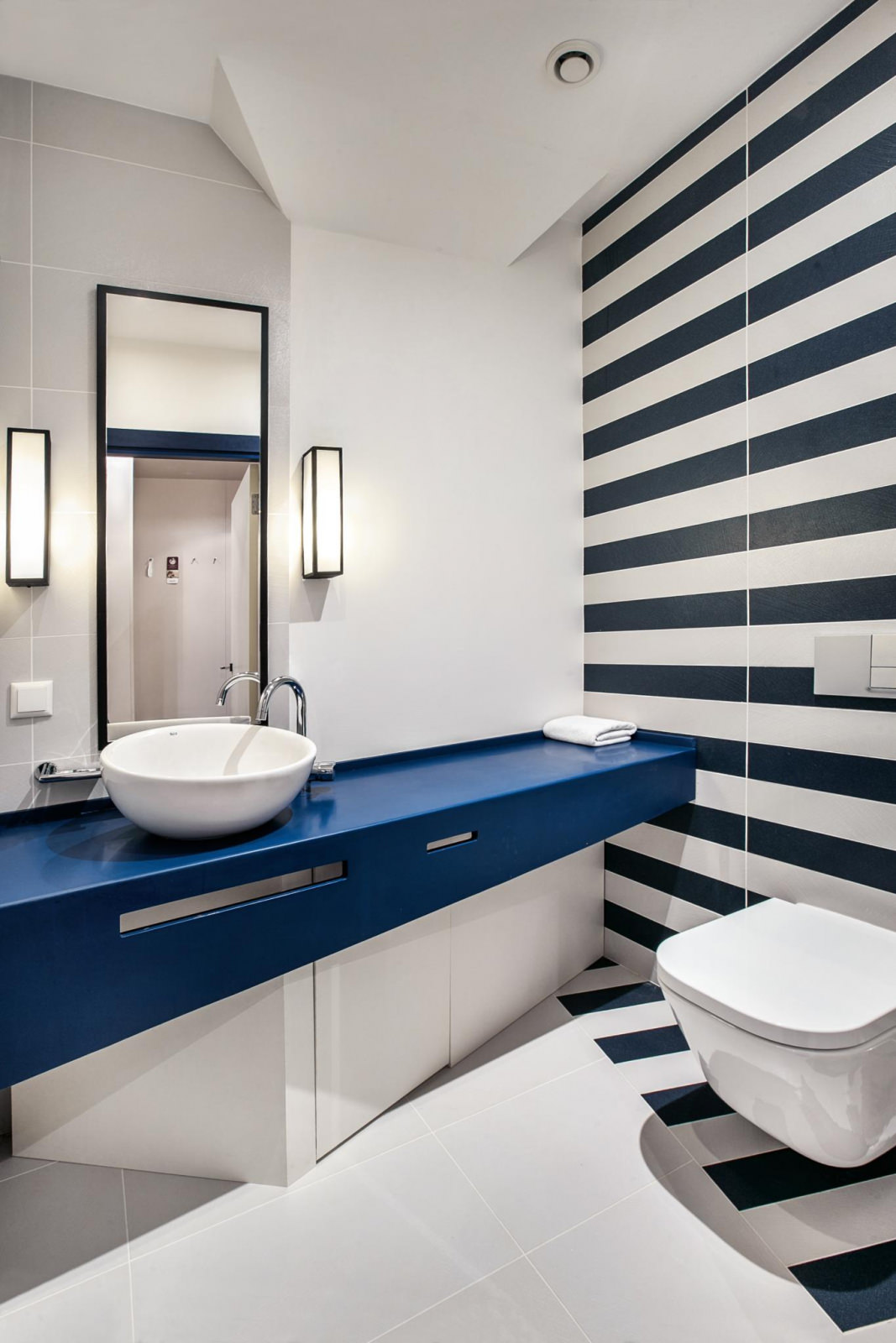 Приятная цветовая гамма номера в морском стиле поможет отвлечься от суеты рабочего дня и набраться сил для новых свершений.