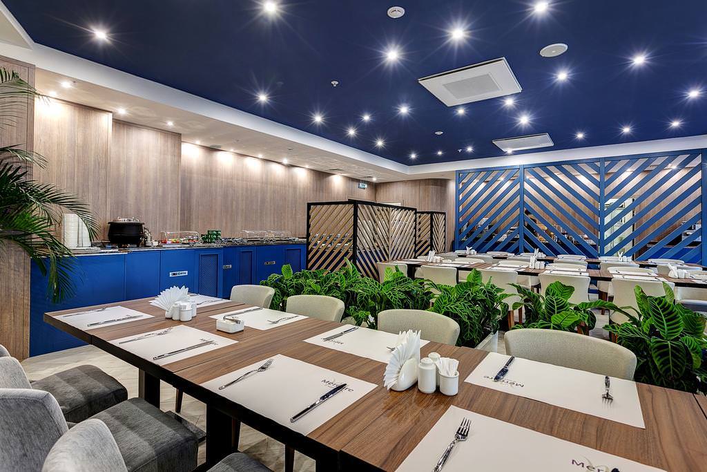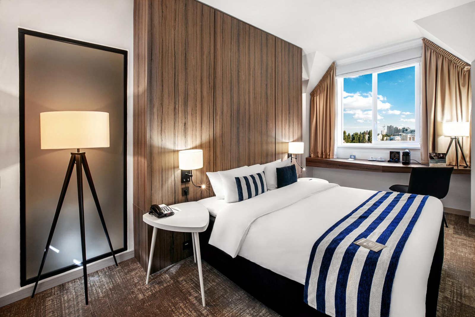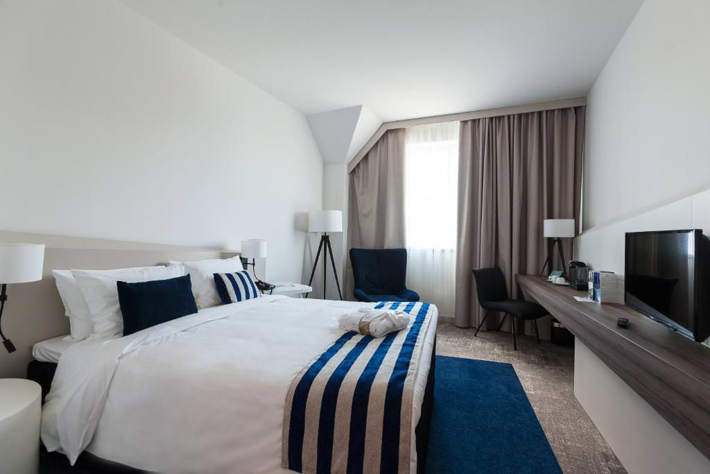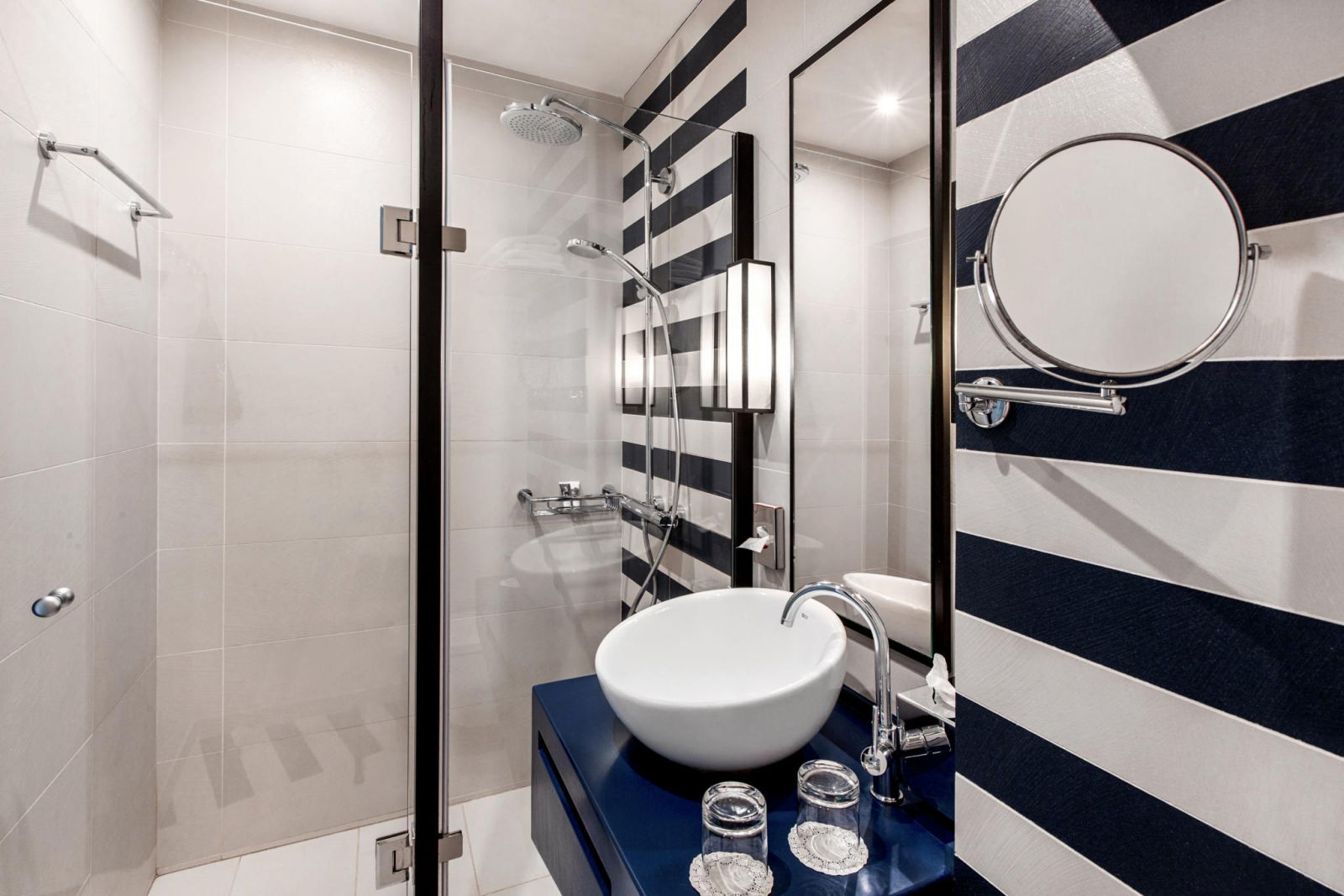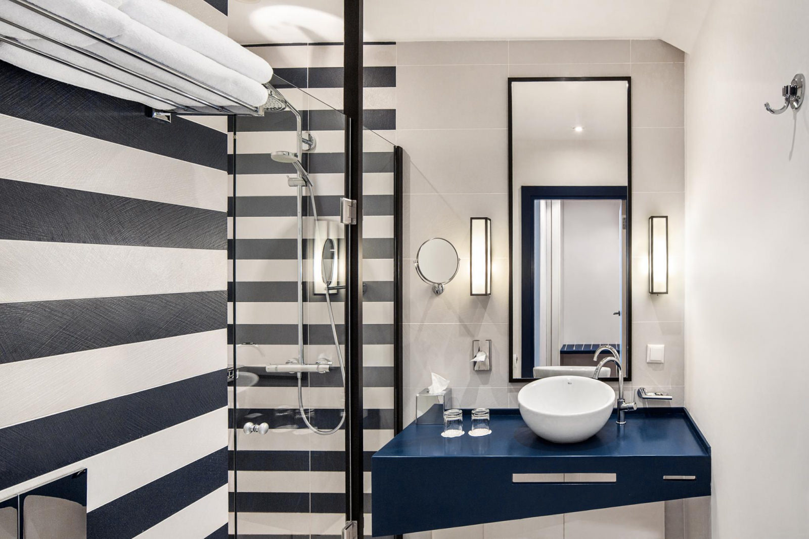 Приятная цветовая гамма номера в морском стиле поможет отвлечься от суеты рабочего дня и набраться сил для новых свершений.