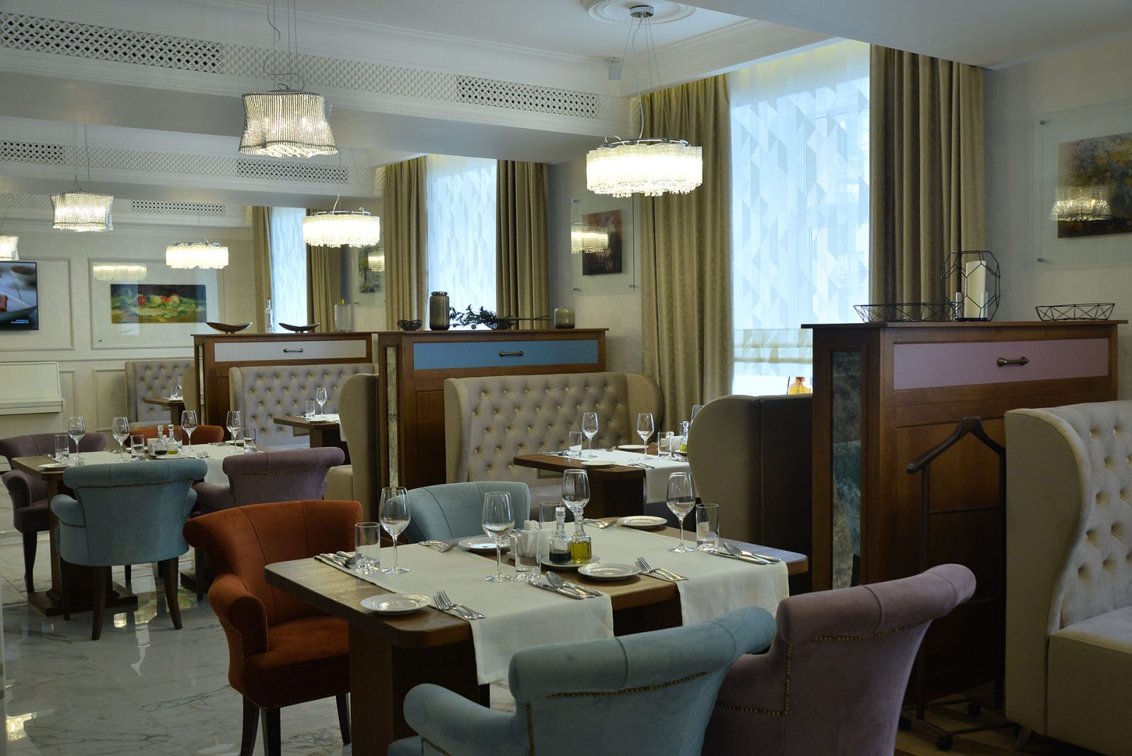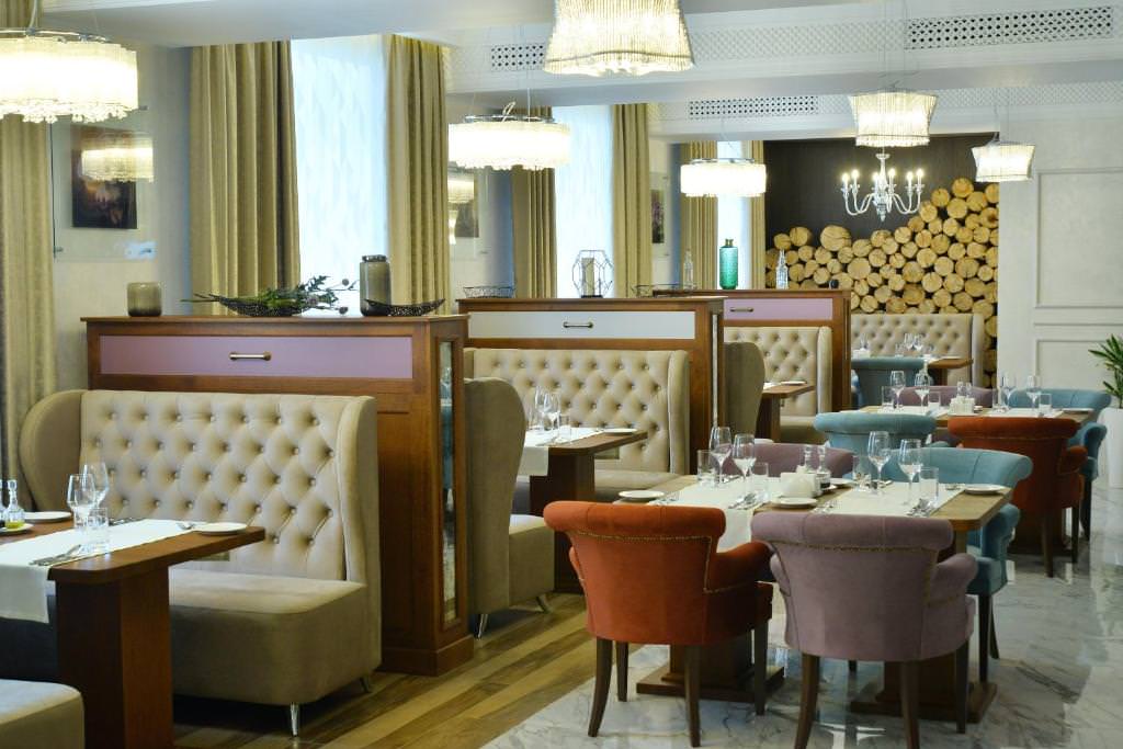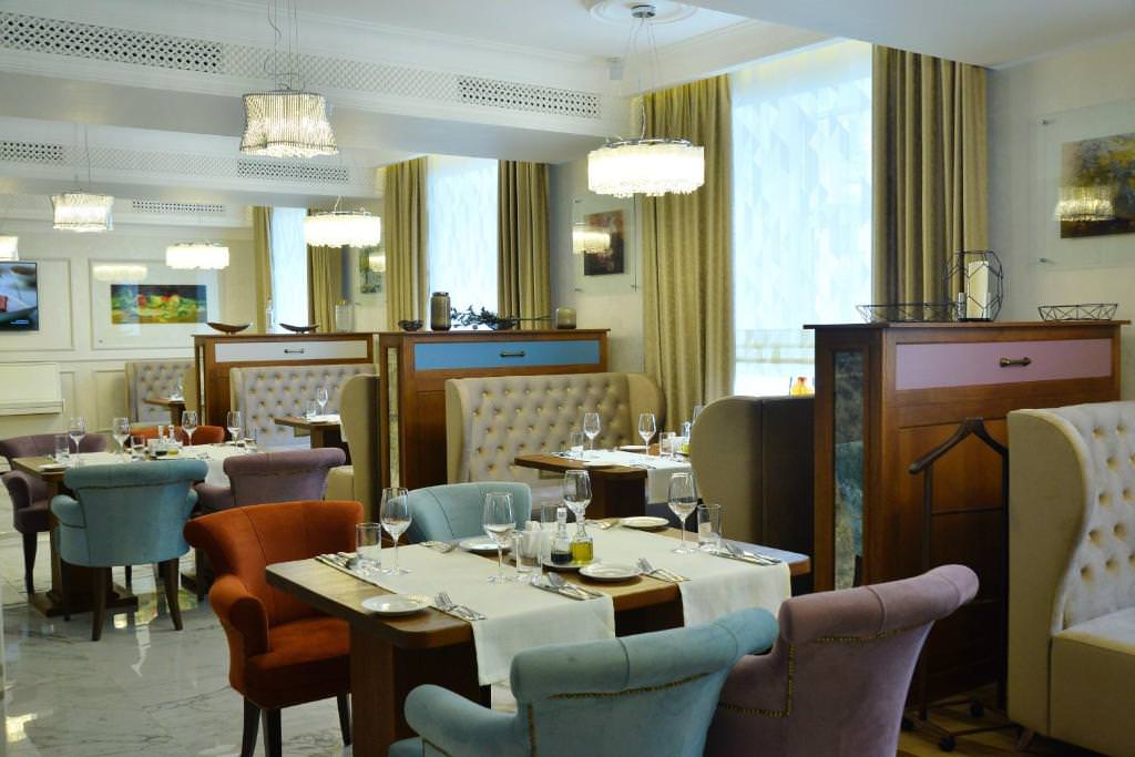 В здании работают рестораны европейской и русской, японской кухни. В обновленном зале каждое утро сервируется завтрак, его стоимость по желанию можно включать в тариф проживания.