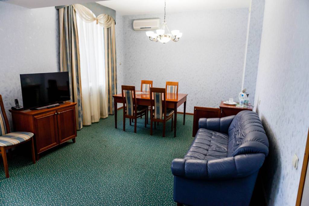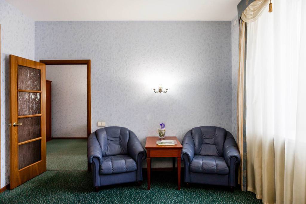 Номера люкс категории включают еще электронные замки, зону отдыха с кожаной мягкой мебелью, халаты, персональный сейф.
