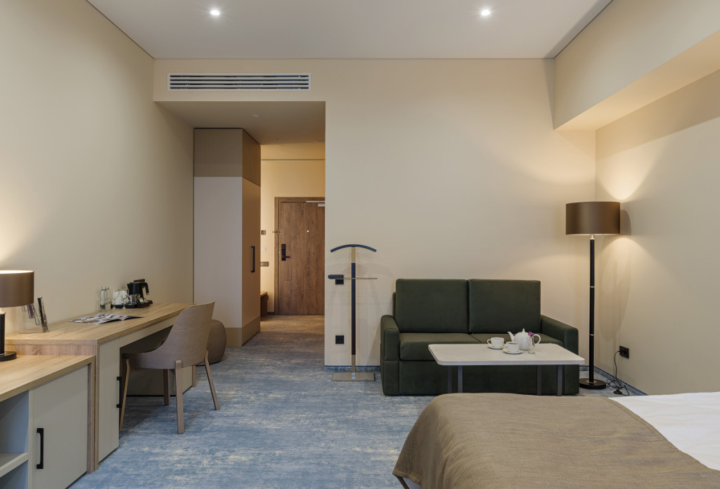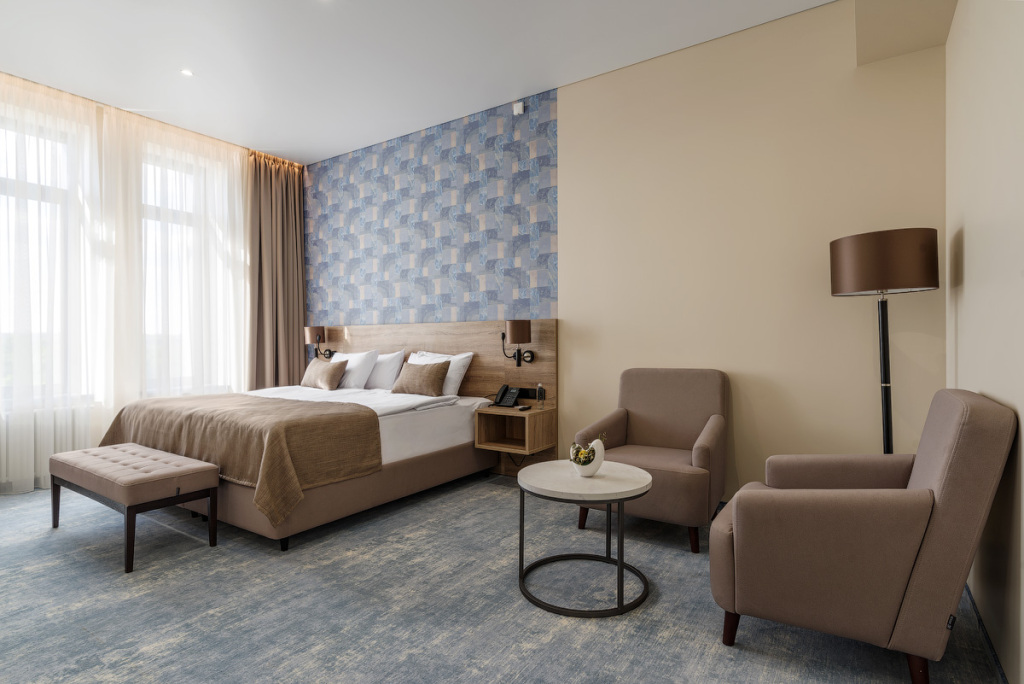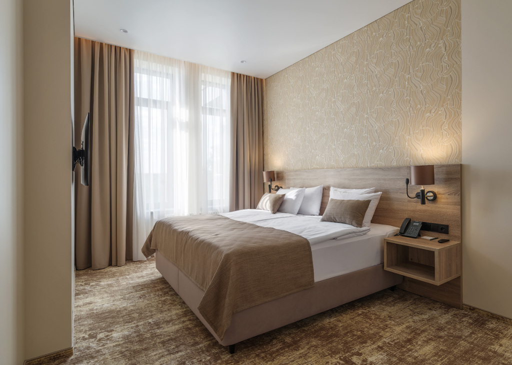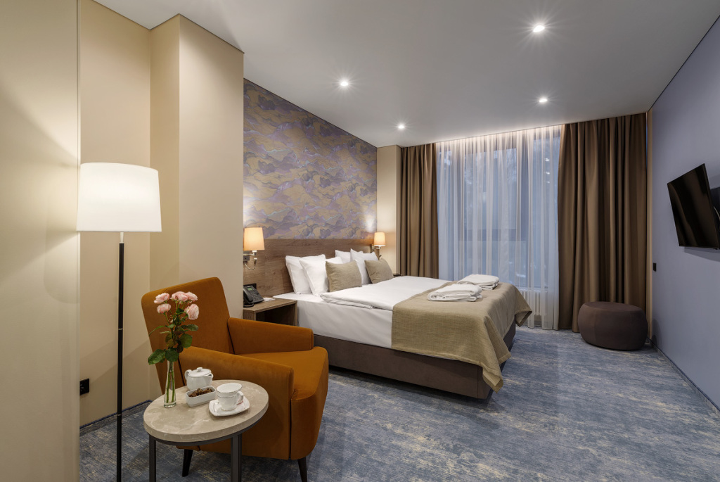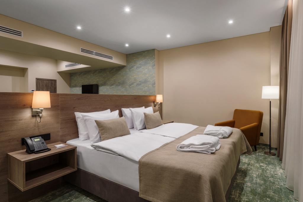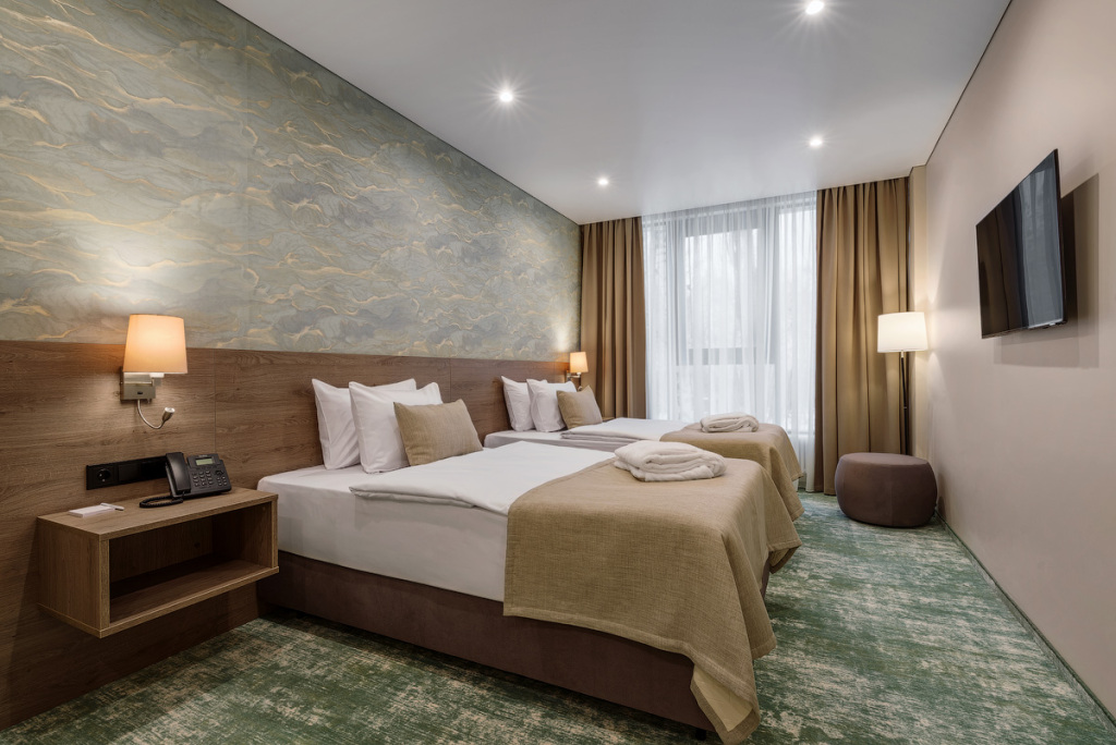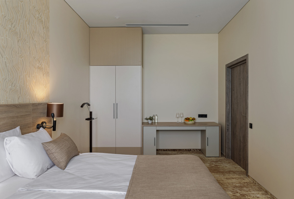 Номерной фонд санатория обладает комфортными и просторными номерами, оформленными в натуральных светлых оттенках. Номера оборудованы всем необходимым для проживания.